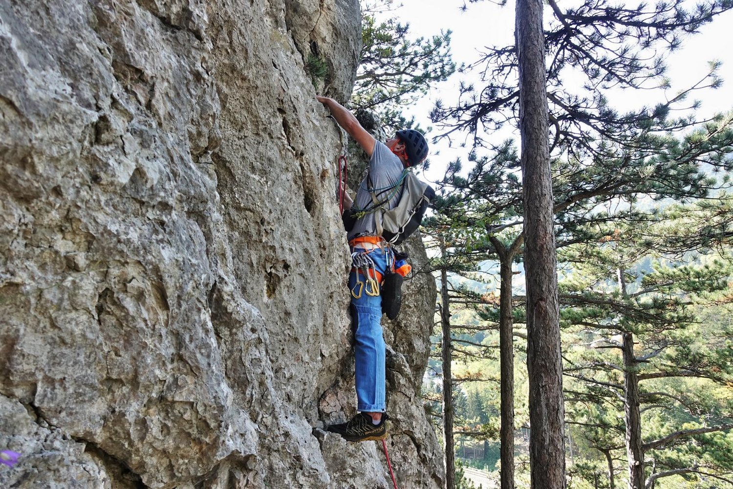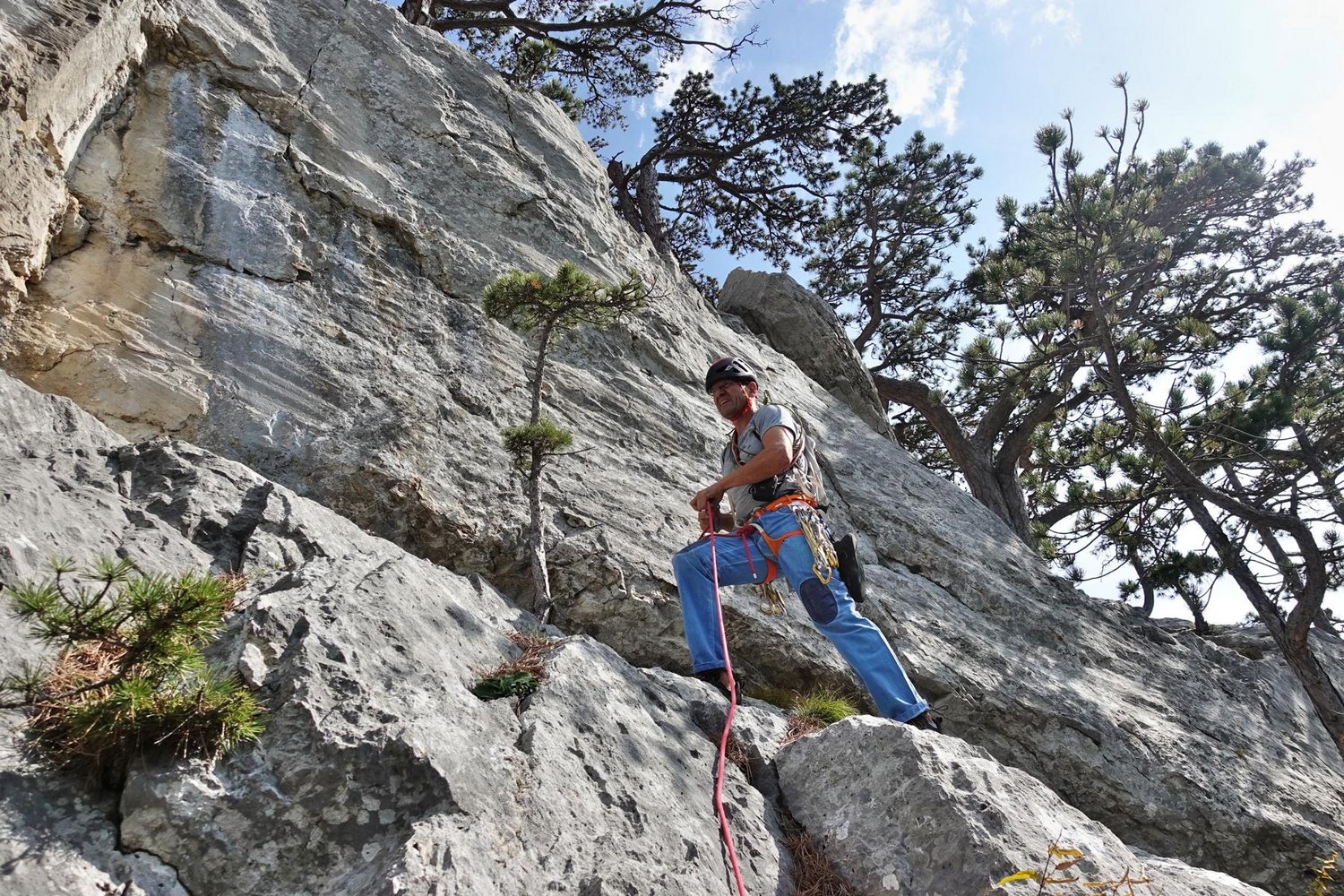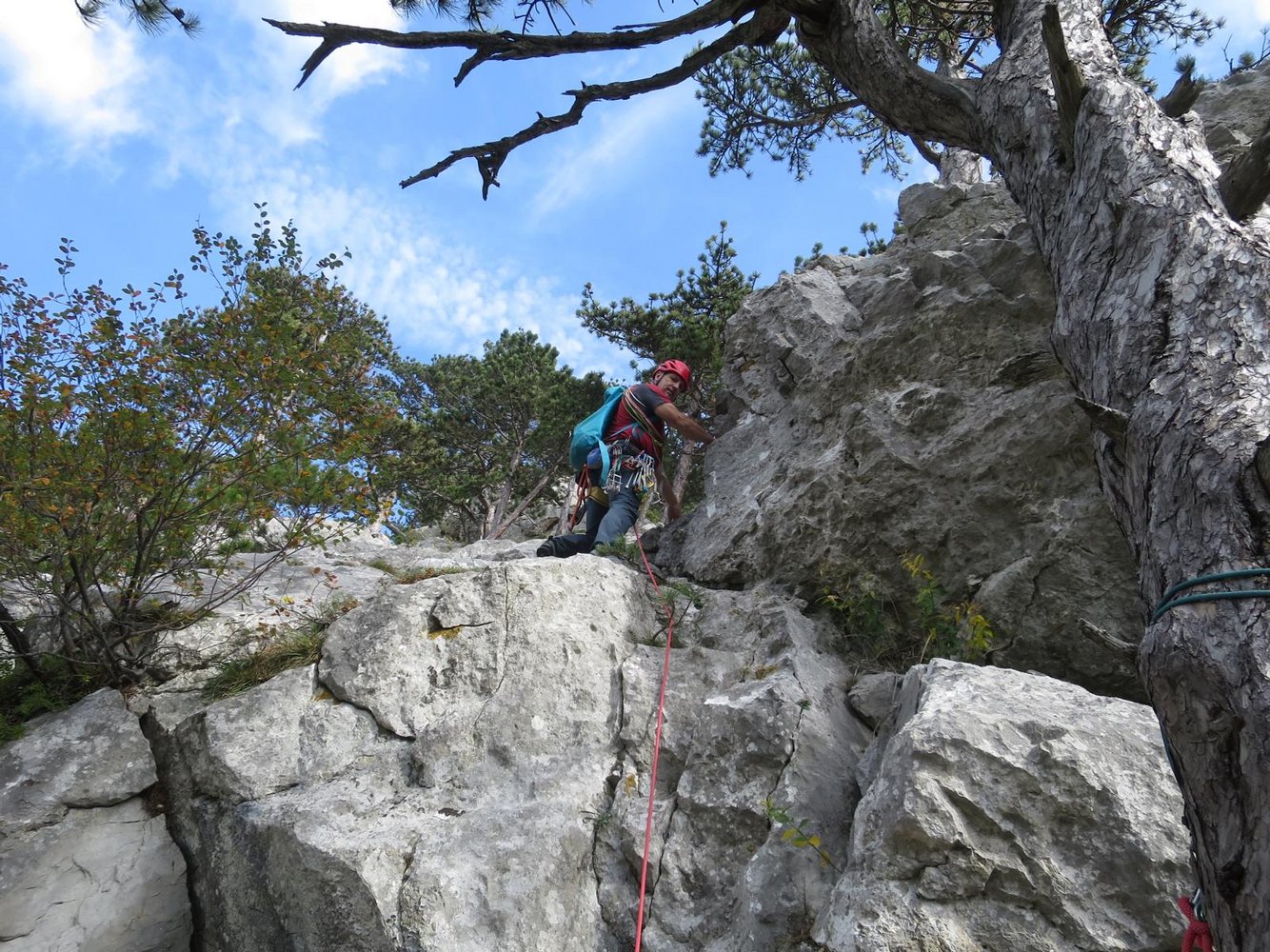 Die erste SL des Südgrats ist sehr gut gesichert. In der eigentlichen Route kann gut an Bäumen gesichert werden und des stecken wenige Normalhaken, die zeigen, dass hier davor schon mal geklettert wurde.