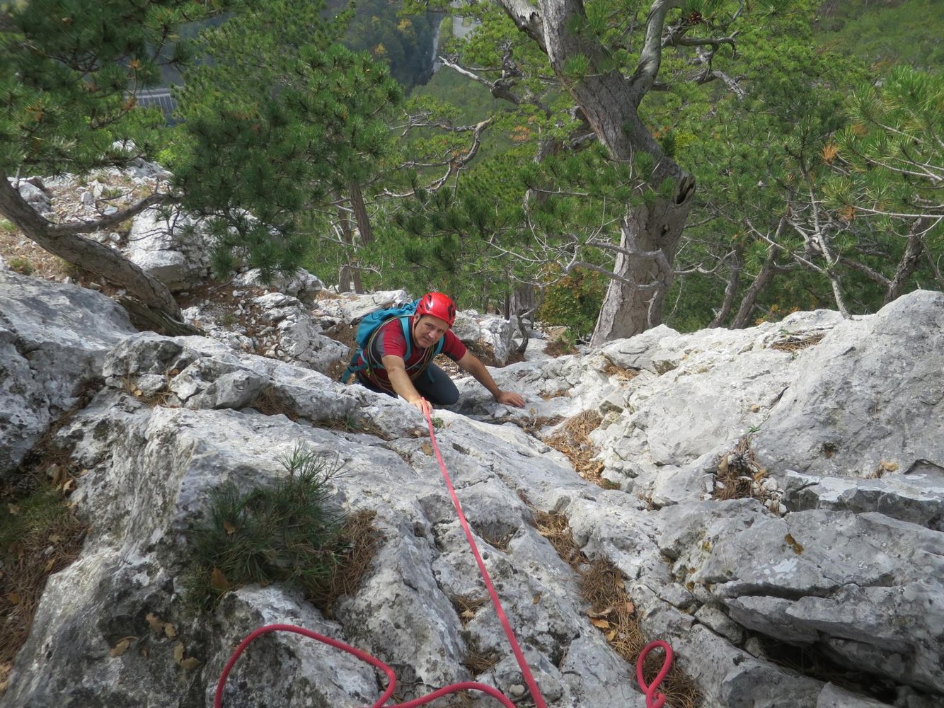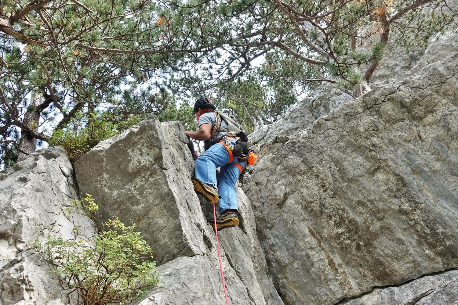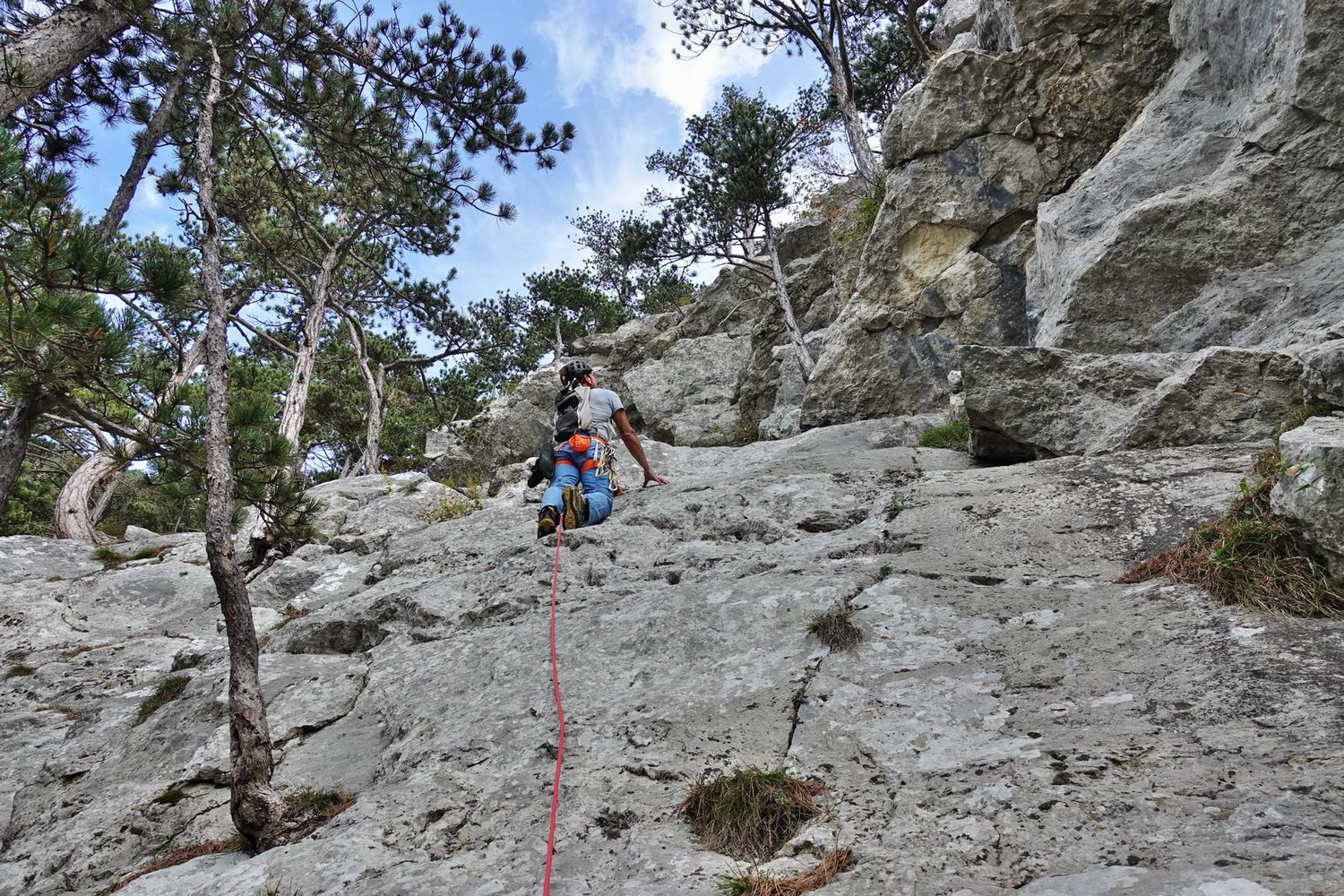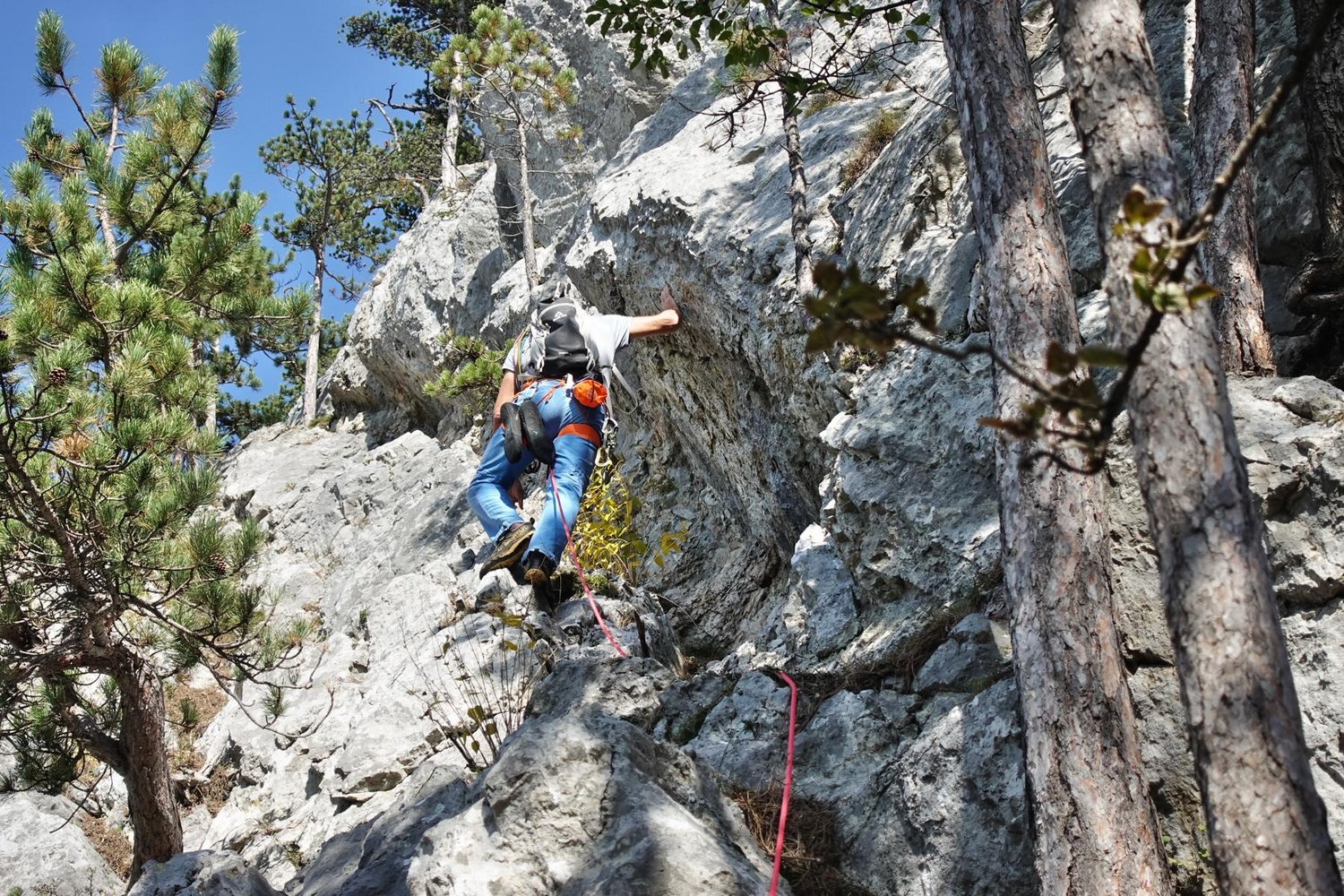 Die erste SL des Südgrats ist sehr gut gesichert. In der eigentlichen Route kann gut an Bäumen gesichert werden und des stecken wenige Normalhaken, die zeigen, dass hier davor schon mal geklettert wurde.