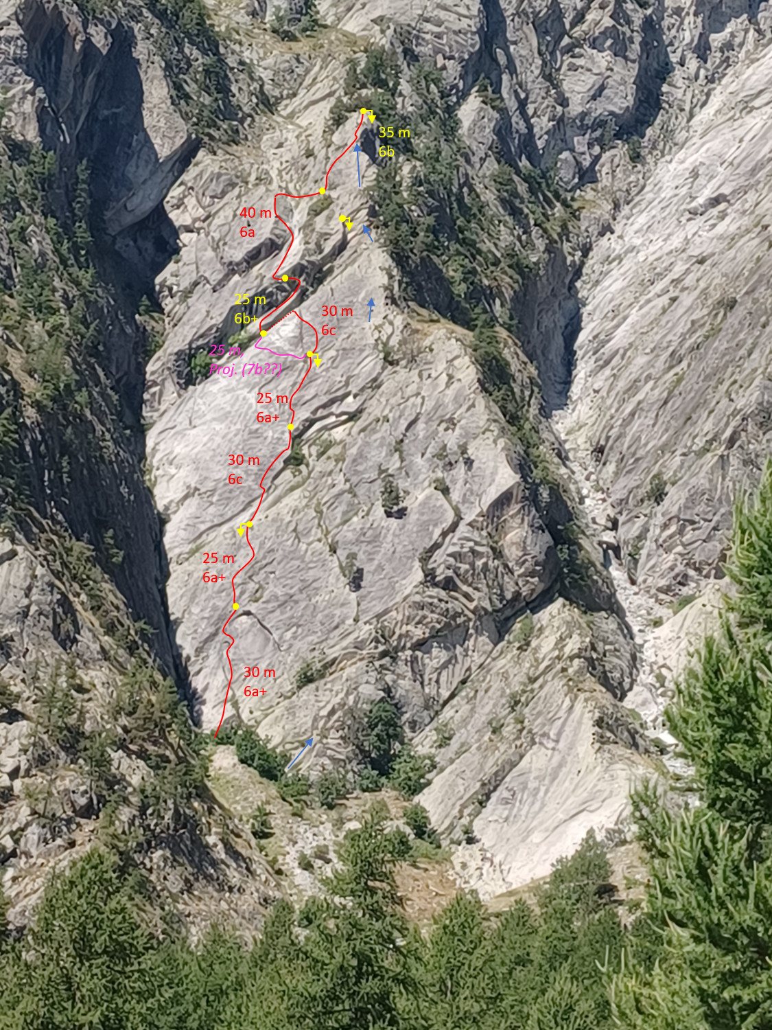 Bombenfester Granit, kurzer Zustieg, landschaftlich super (Ailefroide ist einfach cool) und durchgehend mit Bohrhaken abgesichert: gibt es auch einen Haken? Nein, zumindest dann wenn man Plattenkletterei mag. Wobei die Tour auch zwischendurch andere Features wie Verschneidungen aufweist. Die Tour ist gut abgesichert - aber im Vergleich zu den populären Plaisirrouten im Tal muss man schon ein wenig weiter weg vom Haken klettern. Will heißen: die 6c-Stellen sind obligat zu klettern (der letzte Bohrhaken bei oder knapp unterhalb der Füße). Die Variante in der 5. Seillänge konnte nicht befreit werden, ist aber eh nicht so schön wie die später entdeckte jetzige Länge. Wenn wer Lust hat: wir haben die Bolts belassen.