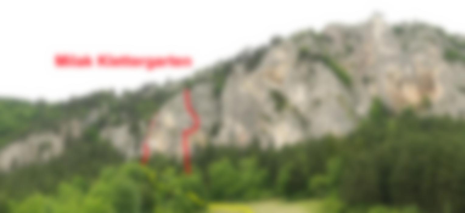 Vom großen Parkplatz in der Kehre (Sonnenuhrparkplatz) zum Milakklettergarten (eingefärbte Touren) und hier zur Nische mit der Bank. Der Einstieg ist links der Nische bei blauer Schrift (Stg. der Wr. Neustädter Jugend).