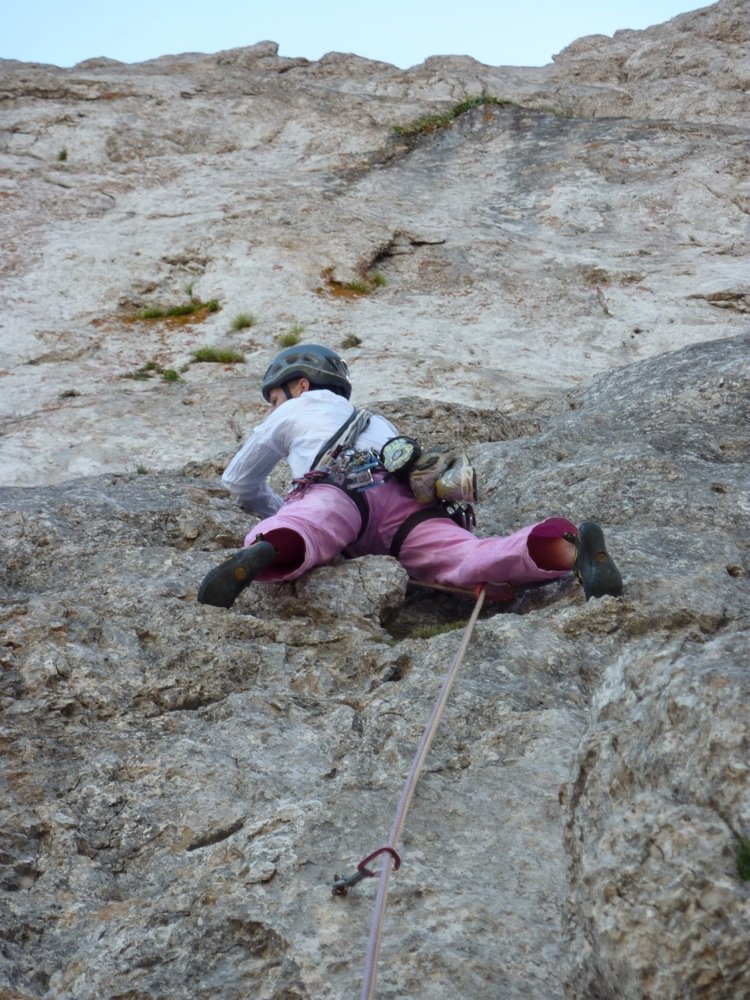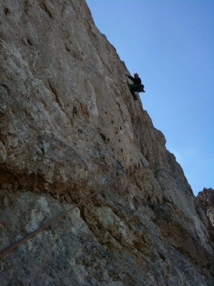 Der Westwand-Gedächtnisweg ist sicher eine der besten Routen am Koschtunikturm. Der direkte Einstieg – also die ersten beiden Längen weisen zwar noch ein paar schrofige Passagen auf, bieten jedoch sehr diffizile Kletterei auf dem wahrscheinlich kompaktesten Stück Fels der Karawanken. Wehe wer sich im Routenlesen schwer tut... Achja, noch kurz was zur Schwierigkeitsbewertung: die Route war bis dato immer mit 6b+ angegeben. Sorry, aber entweder haben wir beide den grottenschlechtesten Tag des Jahres erwischt oder aber es hat einen Grifffausbruch in der Schlüssellänge gegeben. Wir werden versuchen, diese Unsicherheit demnächst zu beheben.