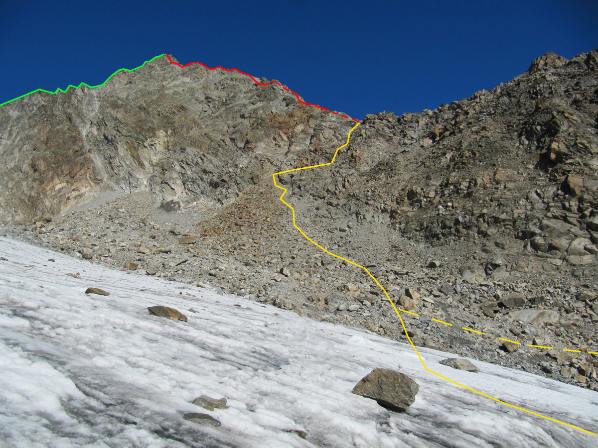 Man kann den Zu- und Abstieg ohne Gletscherberührung im Schutt gehen, ist aber tlw. mühsamer als mit den Steigeisen auf dem Eis.