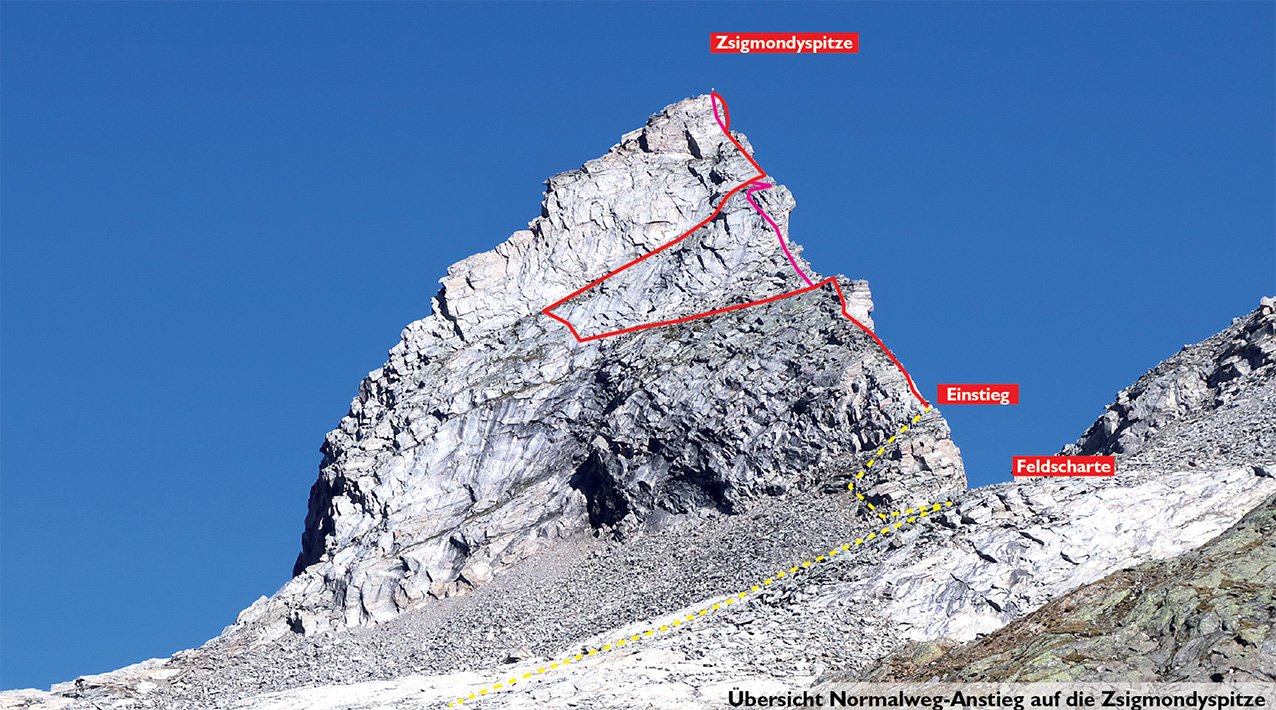 Vom Gasthof Breitlahner auf dem Forstweg im Zemmgrund hinauf zur Alpenrosen Hütte (kann nur selten abgekürzt werden). Dahinter links auf dem markierten Weg zur Berliner Hütte (2042 m) aufsteigen. Nach der Berliner Hütte links auf dem Wanderweg in Richtung Schwarzensee. Beim Schwarzensee direkt den Hang hinauf in Richtung Melkerscharte (diese liegt auf 2814 m). Kurz vor der Scharte kann man rechts über Blockwerk zur Feldscharte (2878) aufsteigen. Von der Feldscharte links um einen kleinen Vorbau herum zum Einstieg am Grat.
