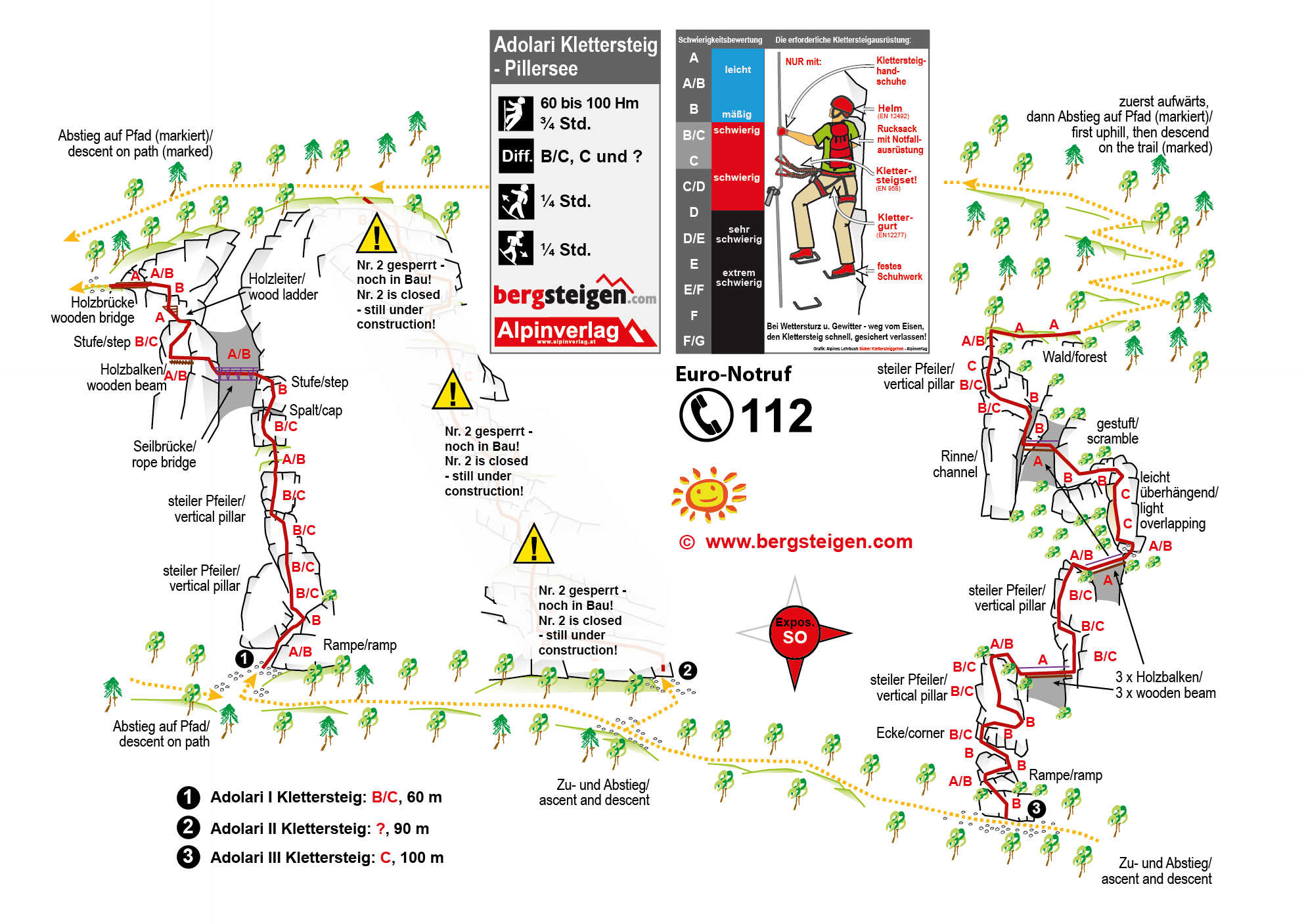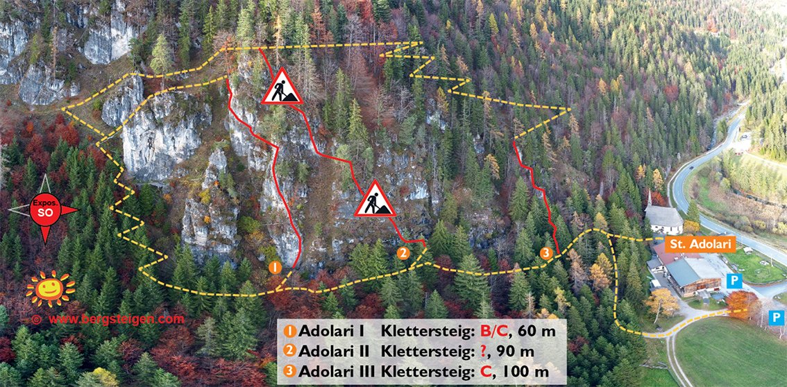 Der Adolari Klettersteig war ursprünglich ein kurzer Klettersteig oberhalb des Kirchleins St. Adolari. Die kurze Ferrata wurde aber erweiter, sodass am Ende drei eigenständige Klettersteig-Linien an der Felswand verlaufen, man klettert immer in Nahbereich eines Klettergartens. Der Klettersteig ist wegen des kurzen Zu- und Abstieges auch bei nicht so sicherem Wetter interessant - auch lädt der nahe Pillersee zum Baden oder Wandern ein.