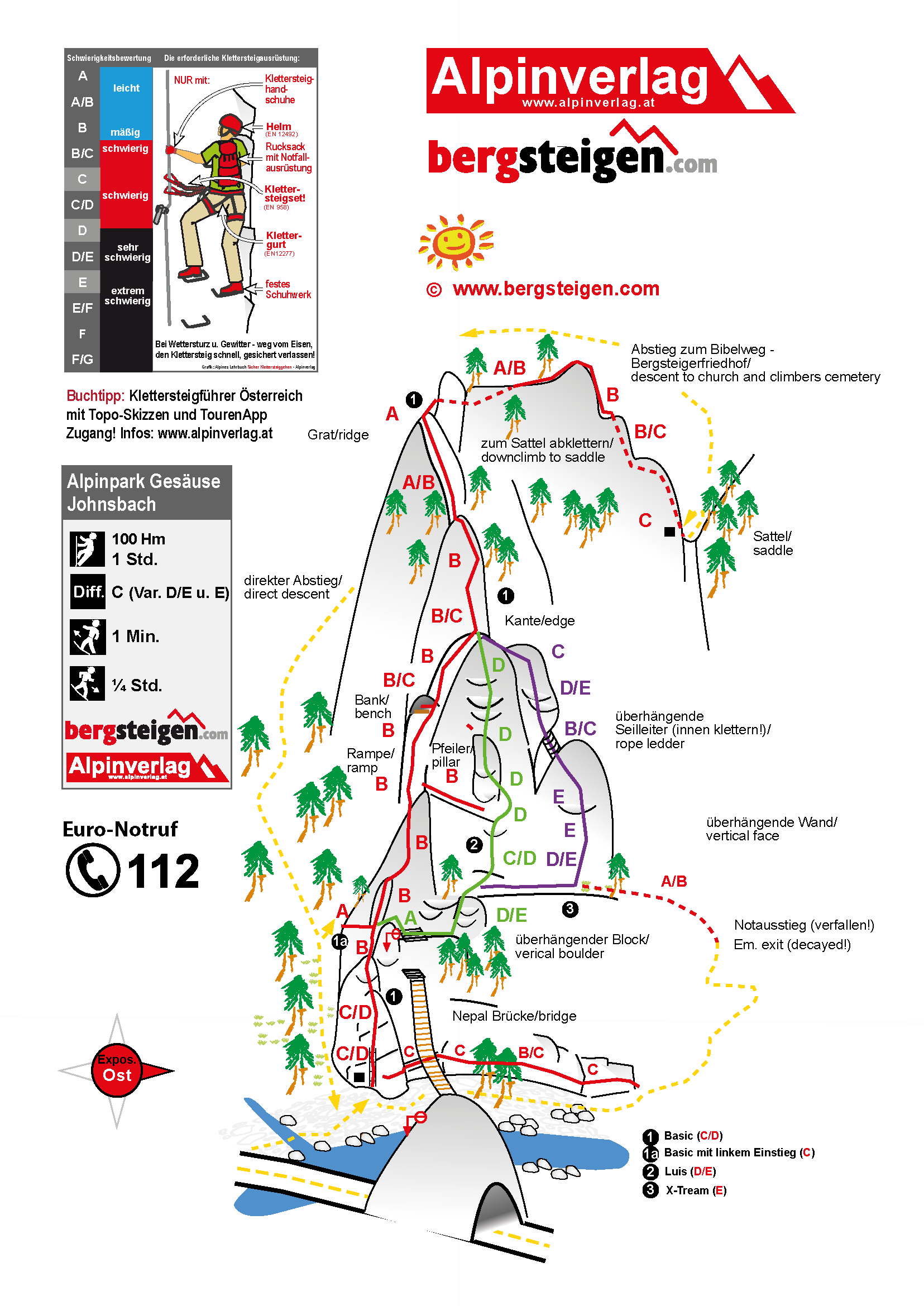 X-treme Variante (E), schwere Variante - Luis D/E. Leichte Basic Variante mit Einstiegsüberhäng (C/D). Leichetester Weg (C) mit rechter Einstiegsvarante