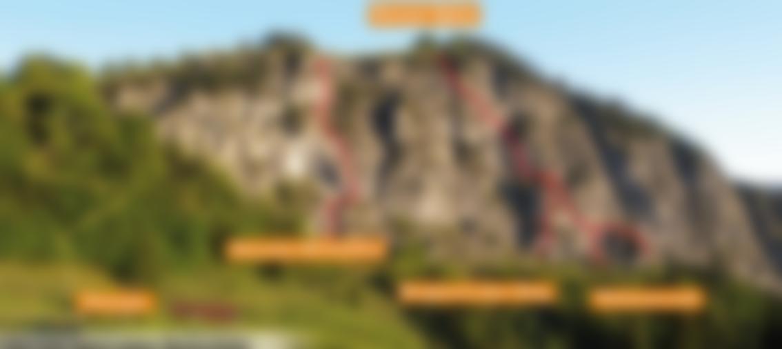 An der Pfeilerwand hinauf (C, Stellen C/D), bis man oben zur Seilbrücke quert. Über die Seilbrücke (B), an die Hauptwand. Eine leichte Querung (A) führt links zu einem Überhang (D). Nach dieser kurzen D-Passage klettert man in S-Linie (C/D) zu einem Flachstück (A/B). Eine Querung (A) und mehrere Stufen (B/C) führen zur zweiten Seilbrücke (B), danach kurz steil (B/C), dann leicht (A) hinauf zum Ausstieg.