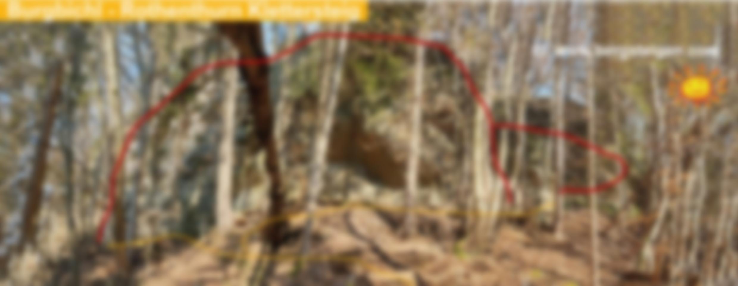 Vom Parkplatz wenige Schritte in den Wald und rechts über einen Weg und Stufen hinauf zu den Felsen.