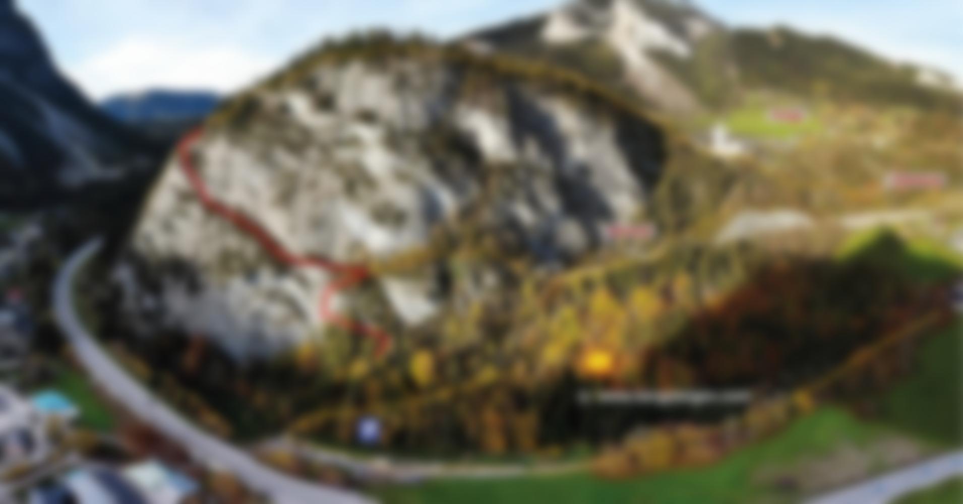 Von der Straßenunterführung gerade aufwärts zu den Wänden und Steigspuren folgend rechts hinauf zum Einstieg bei einem erdigen Spalt (A/B). Weiter durch steiles Gehgelände zu einer Felsnische. Kurze, recht ausgesetzte Querung nach links hinaus (A) zu einer Verschneidung, hier nicht links weiter, sondern dem roten Pfeil folgend über viele Klammern (B, dann A/B) in einer steilen Verschneidung hinauf, bis das Seil im Wald endet. Nun dem Pfad hinauf zu den nächsten Felsen folgen und nach links auf das große, die gesamte Wand querende Band zu den nächsten Versicherungen. Es folgt eine teilweise versicherte, lange Querung, deren Ausgesetztheit durch die üppige Vegetation verdeckt wird. Der beeindruckende Tiefblick wird etwas durch die direkt unterhalb verlaufende breite Bundesstraße getrübt. Bei einem markanten Baum entlang der Versicherungen rechts aufwärts, dann unversichert immer leichter werdend ins Gehgelände und über eine Felsstufe (nur Klammern A) zum bewaldeten Gipfelplateau.