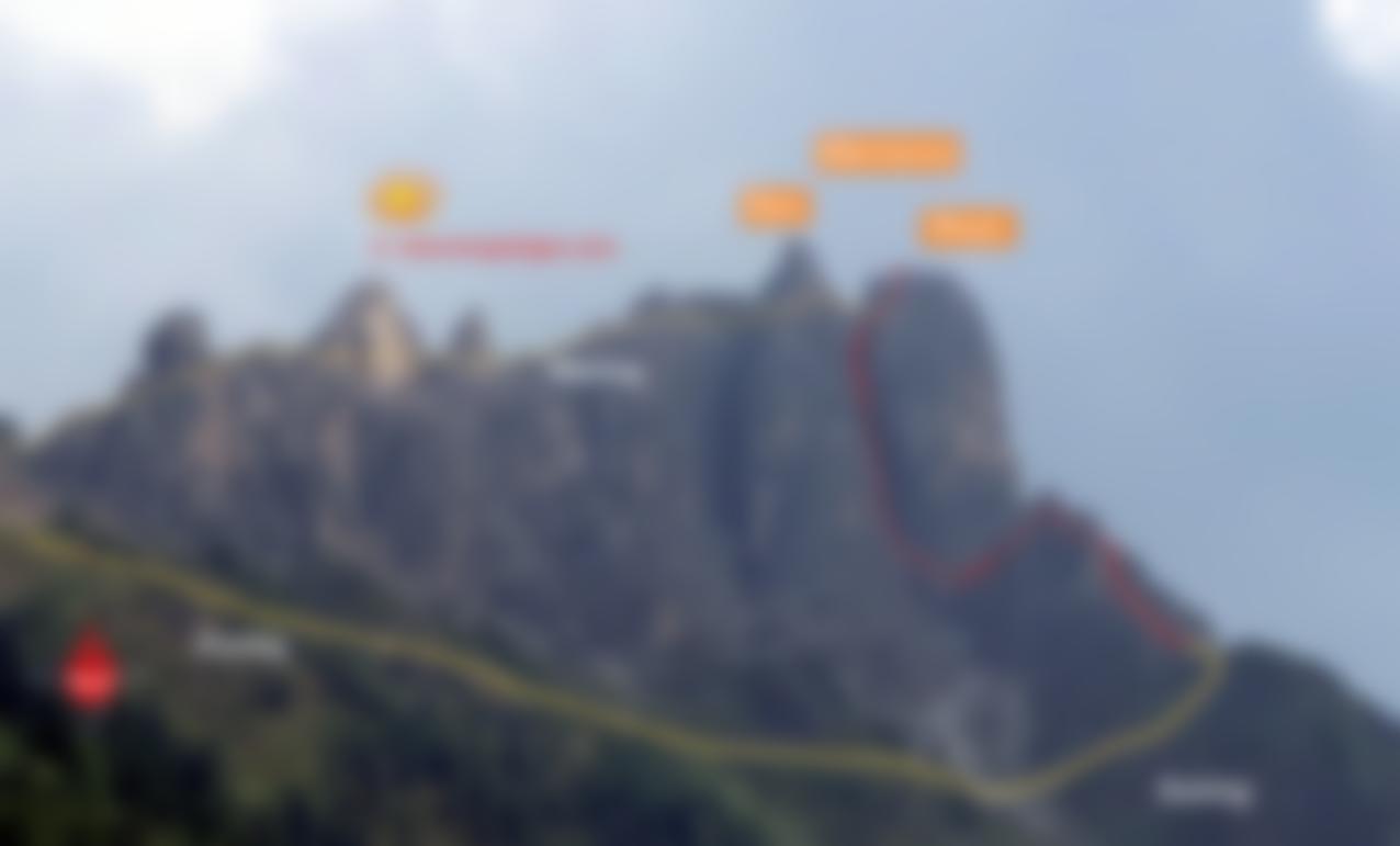 Siehe Topo. Nach dem Einstiegsteil (C) quert man die Schlucht (B/C) und klettert an der linken Schluchtseite bis zur Schlüsselpassage (C/D, Variante im Spalt D). Danach in einen Kessel (C) und über Schrofen (A/B ) zur Schlusswand, die kurz, aber steil und knackig (C) zum Gipfel führt - ein tolles Finale!
