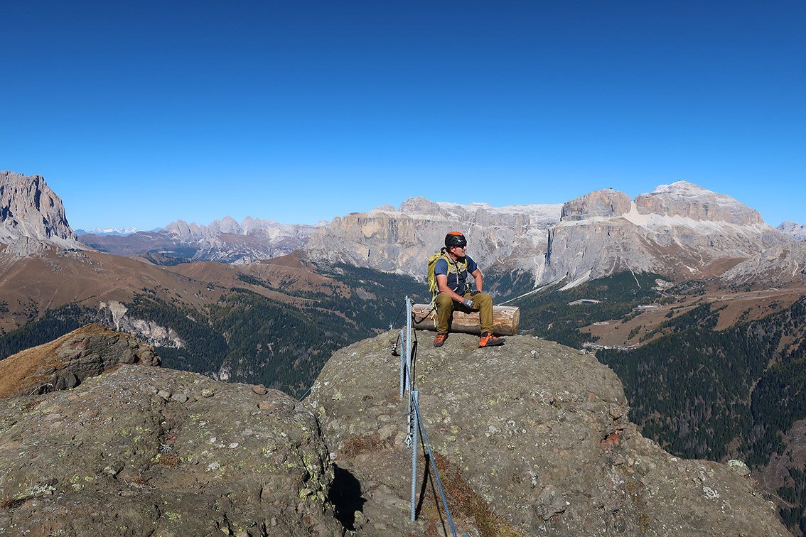 Die Crepa Neigra ist ein kleiner Konglomeratberg mit vulkanischem Ursprung (Neigra = Schwarz) und primär um diesen Berg wurde eine Ferrata angelegt. Man steigt zuerst ein paar Meter auf, eine Seilleiter sorgt für Abwechslung. In halber Wandhöhe beginnt man dann mit der sehr langen Querung, aus der man in der Mitte schon auf den Wiesengipfel aussteigen kann. An der Ferrata wurden rund 500 m Stahlseil verbaut, die meisten Meter davon in der Horizontalen. Wer das Traversieren bis zum Ende durchhält, wird mit ein bis zwei ausgesetzten Passagen belohnt. Die Ferrata Crepa Neigra ist ein klassischer Mainstream-Klettersteig in Seilbahnnähe und spricht wegen der geringen Schwierigkeiten eher Ferrata-Einsteiger an. Der Klettersteig bietet im wahrsten Sinne des Wortes (lange Querung) ein perfektes, lang anhaltendes Dolomiten-Panorama!