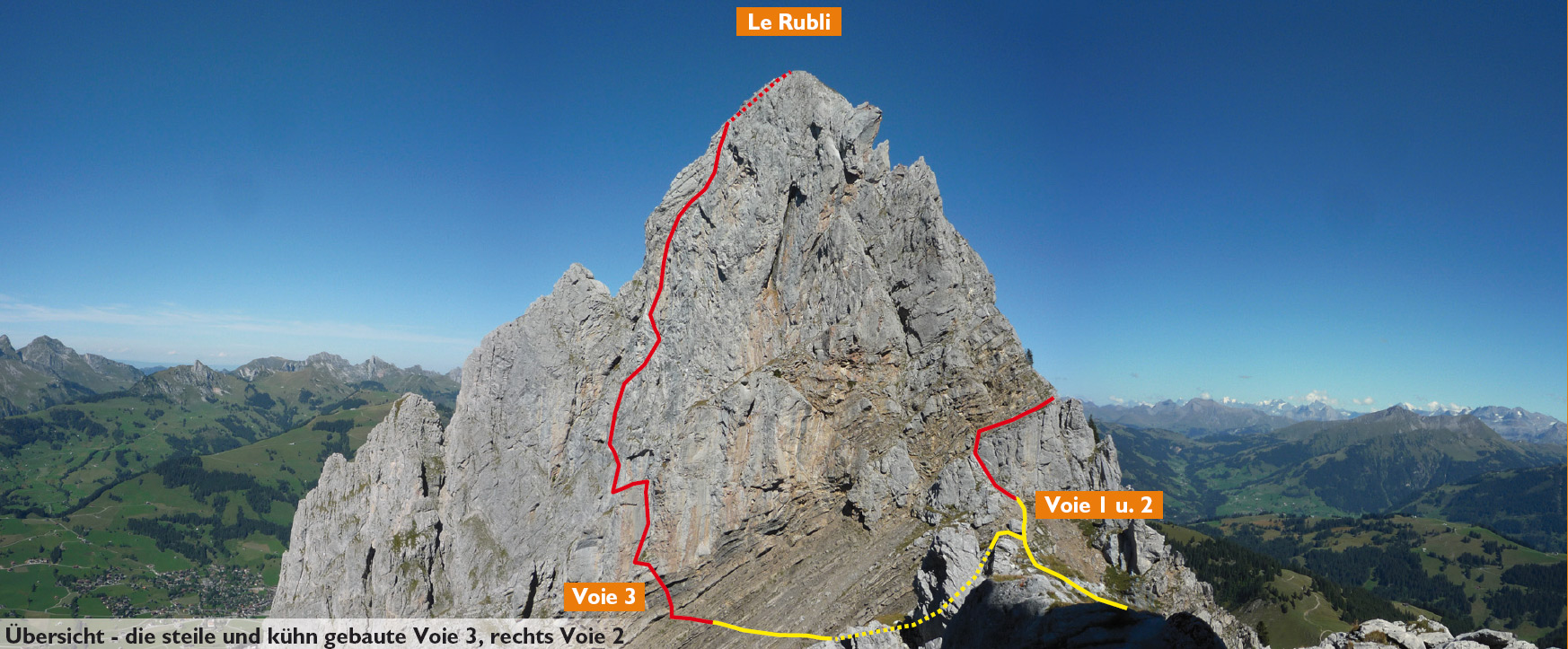 Eins, zwei, drei – Rougemont – die drei kurzen Klettersteige findet man in der Literatur oder den unendlichen Weiten des www auch unter Via ferrata Rougemont oder einfach nur Via ferrata le Rubli. Die Steige bieten nahezu die gesamte Schwierigkeitspalette und sind damit ein willkommenes Ziel für Anfänger und Fortgeschrittene. Die perfekte Verbindung mit der Videmanette Seilbahn lädt dazu ein, den Rubli in Form eines sonnigen Nachmittagsspaziergangs zu bezwingen. Voie 1 (Deutsch: Weg 1), der leichteste Weg auf den Rubli ist für Einsteiger und als Abstieg gedacht. Voie 2 zweigt nach dem ersten Drittel ab und schwingt sich über steile Platten und den Südostgrat hinauf zum Westgrat. In der senkrechten Westwand verläuft der extremste Anstieg (Voie 3), konstant steil und schwer.
