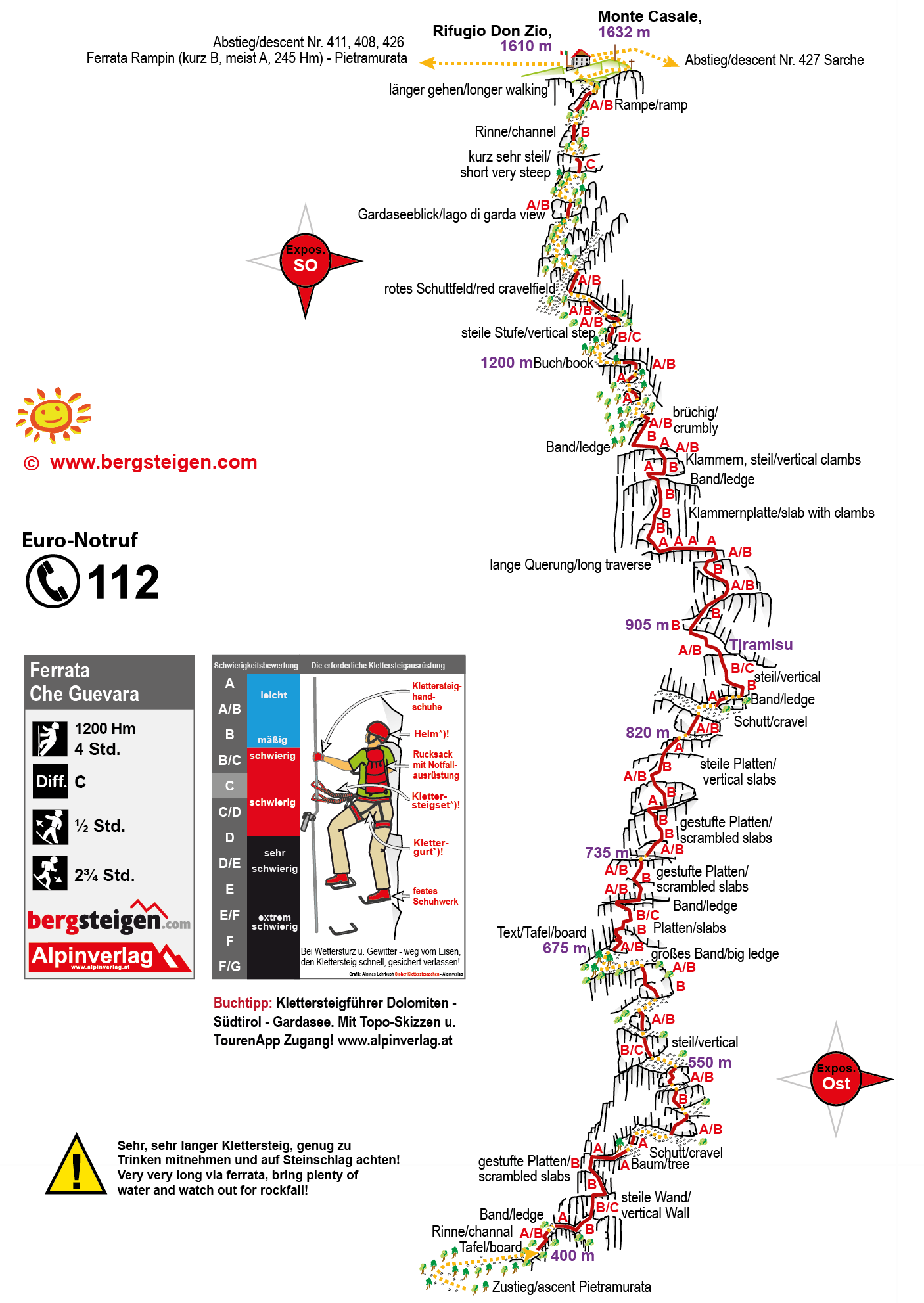 Anmerkung: Mit gesamt 1400 Hm der längste Klettersteig beim nördlichen Gardasee, vor allem im Sommer sollte man die Tour nicht unterschätzen. Bei Nässe ist die Ferrata wegen der oberen, erdigen Gehpassagen nicht zu empfehlen. Es liegt auf den Bändern viel Schutt - Steinschlag ist also in Thema. In den Sommermonaten Juli und August ist auf kühles Wetter zu achten.