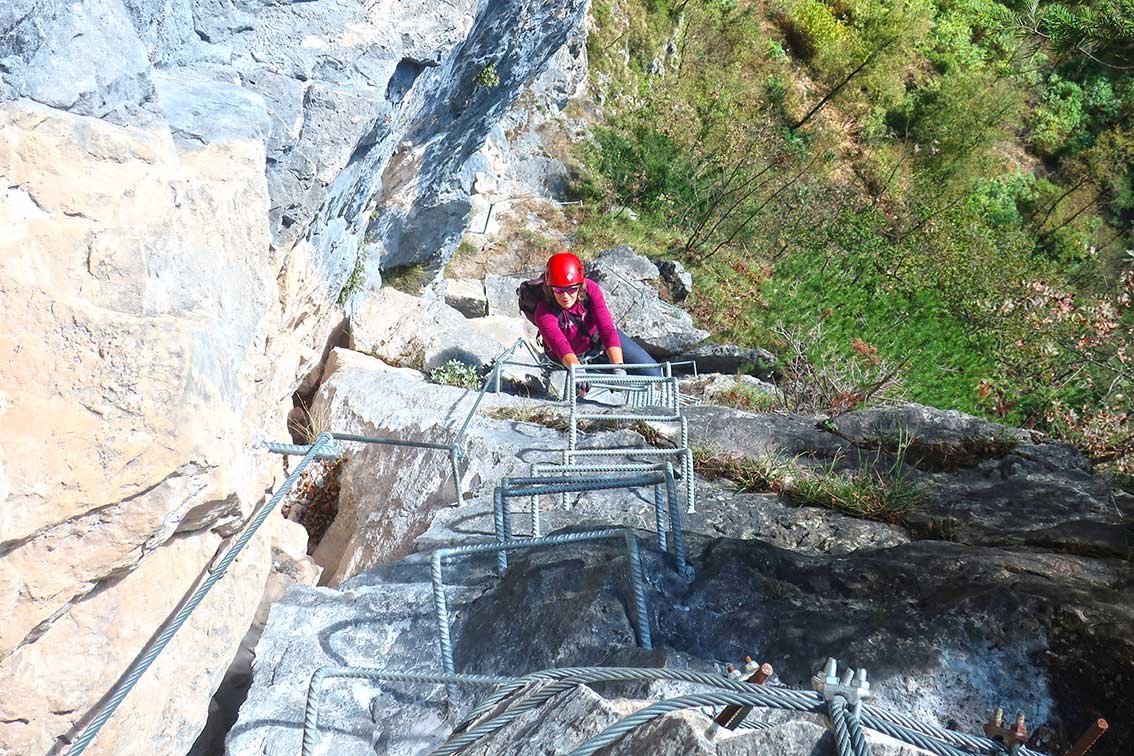 Die Ferrata Sandokan (siehe Topo) lohnt nicht als eigener Zustieg zum oberen Teil, wer die unteren Klammerrampen der Ferrata San Silvestro schafft, kommt auch gut den oberen Teil bis zur Kirche hinauf.