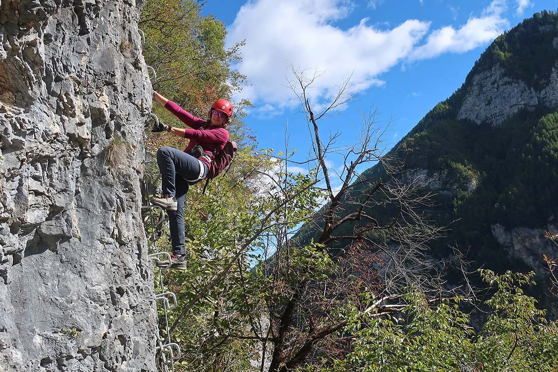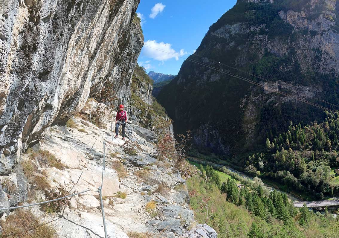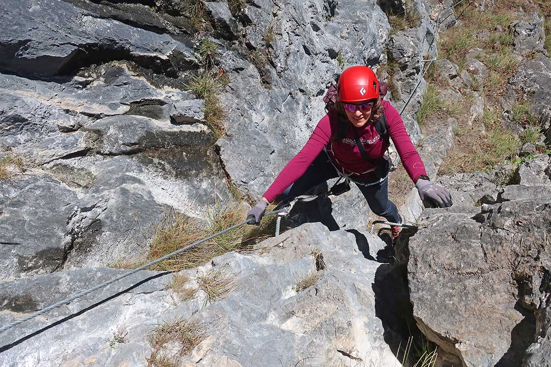 Der Klettersteig ist gut gesichert, teilweise passen aber Stahlseil und Klammern nicht gut zusammen (man steht immer etwas neben der Ideallinie).