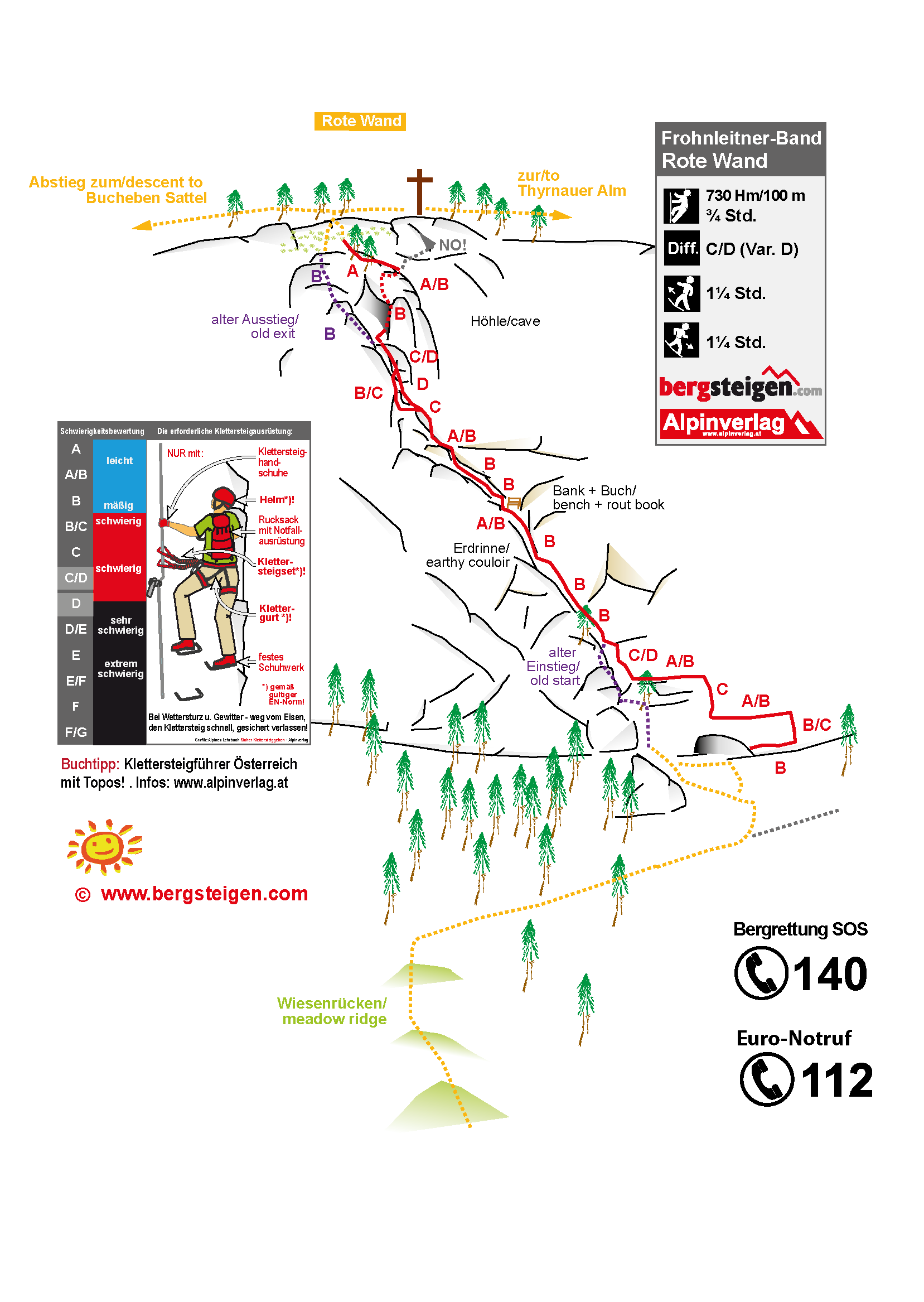 Vom Parkplatz der Roten Wand auf Forststraße in Richtung Buchebensattel, in der ersten Kehre auf gut sichtbaren Steigspuren nach rechts in einem Graben zur nächsten Forststraße aufwärts, dieser nach rechts folgen und auf dem markierten Wanderweg Richtung Tyrnaueralm, bis dieser noch im Wald auf einem Rücken unter dem Gipfel der Roten Wand führt, der Weg geht noch kurz den Rücken hinauf und verlässt diesen bei einer gelben Tafel nach rechts. Hier genau bei einem gelben Wegweiser den Wanderweg verlassen und auf einem Pfad dem Rücken weiter aufsteigen. Es kommt eine Forststraße und gleich (der weg ist links) darüber eine Wiese. Kurz am Wiesenrücken zur Wand hinauf und vor dem Wald rechts einem Weg folgen. Bei einigen Felsblöcken + Steinmann, zweigt links der Weg zum Einstieg ab.