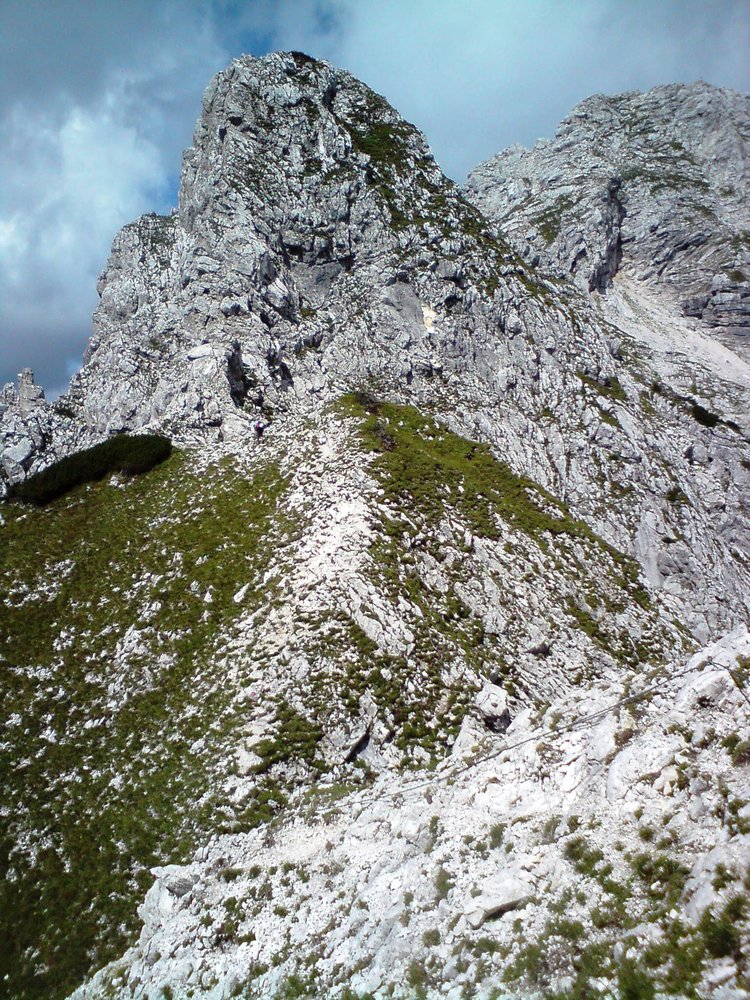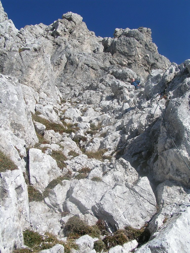 Vom Einstieg 50 m nordseitig entlang der ersten Versicherungen (A) auf den Hauptgrat. Weiter über die steile Felskante absteigend (zuerst B, dann 1-) auf einen Rasenkamm, diesen leicht links ansteigend (1-) zum Fuße des großen Turmaufbaues. Südseitig über eine Rampe (A) aufsteigen und anschließend kurz abklettern (A/B, Steigbuch). Über die Schlüsselstelle (B/C) in die markante Schlucht einsteigen. Leichter (zuerst A, dann B) etwa 60 m in die Turmscharte aufsteigen. Weiter leicht rechts haltend über den Kammrücken und über leichten Felsgrat (1-) zur Rosskarscharte abklettern. Hier Ausstieg und Einmündung in den Normalweg.