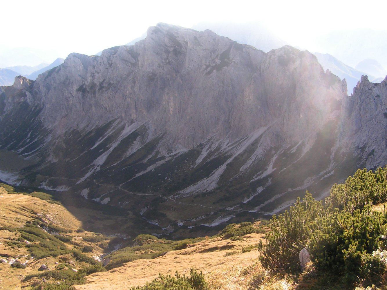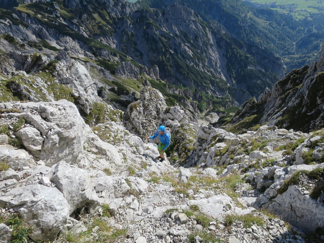 Es empfiehlt sich der Abstieg über den Klettersteig, alternativ ab der Abzweigung über Weg 634 ins oberste Roßkar absteigen und anschließend in die Natterriegelscharte aufsteigen (schattig, im Frühjahr und Herbst feucht und länger). Von dort am Aufstiegsweg zurück ins Tal.