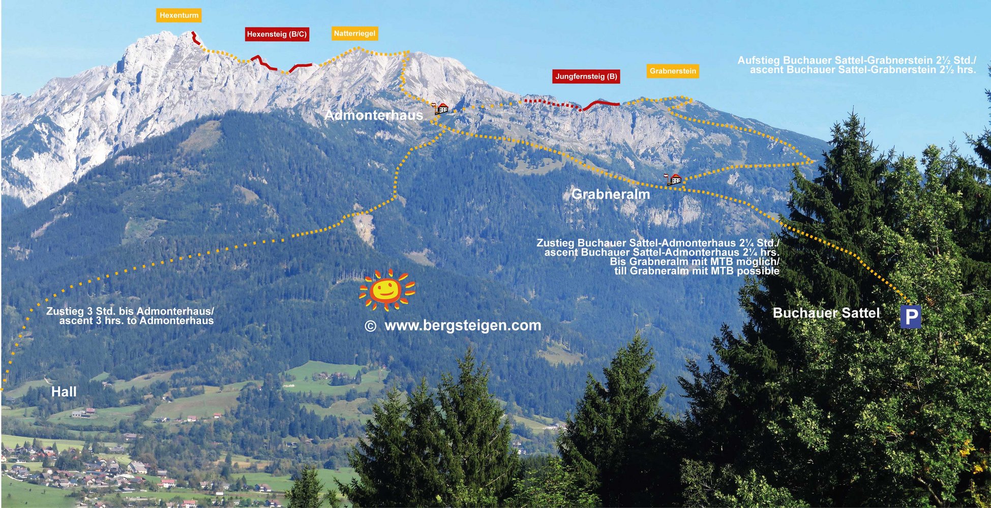 Über Weg 636 meist auf Forststraßen zur Grabneralm. Weiter Weg 636 nun in Form eines Wanderwegs zum Admonter Haus folgen. Ab Admonterhaus über Weg 634 auf den Natterriegel. Von dort Abstieg in die Natterriegelscharte und in Kürze zum Einstieg.