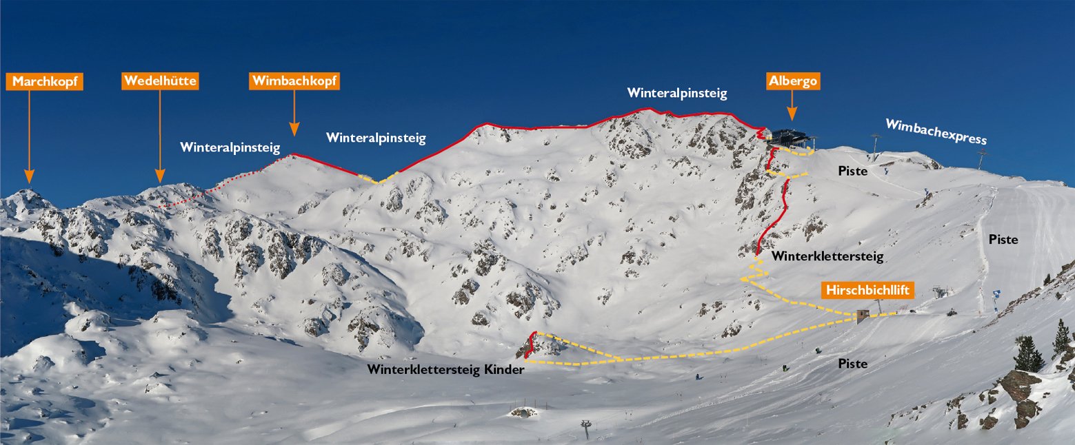 Der Hochzillertal Winterklettersteig Kinder ist eine sehr kurze Ferrata an einem Felsblock im südlichen Becken unterhalb des Wimbachkopfes. Die 20 Hm hohe Ferrata lohnt nur bedingt als eigenständige Unternehumg, ist aber als Aufwärmroute für den Hochzillertal Winterklettersteig interessant. Wer beim Winterklettersteig Kinder Probleme hat, braucht nicht weiter zum Hochzillertal Winterklettersteig aufsteigen.