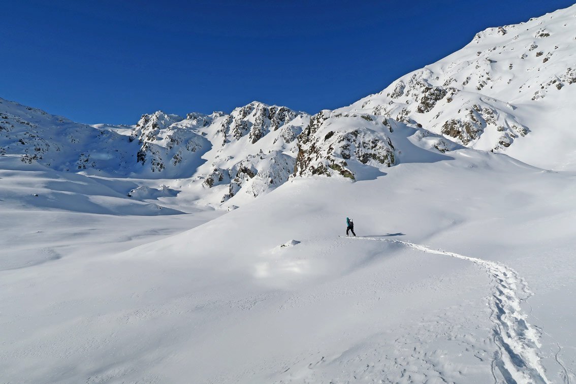 Vom Ausstieg oben rechts hinunter zur Zustiegsspur und dann zurück zur Skipiste.