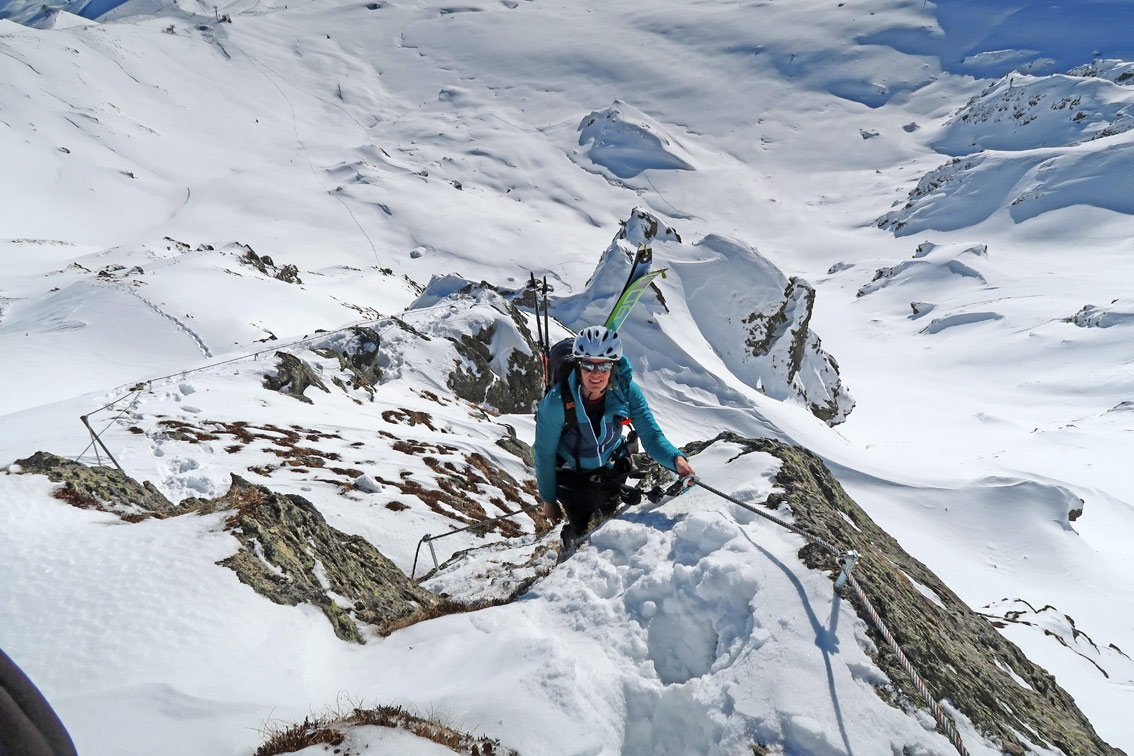 Gut mit Stahlseil und wenigen Trittklammern abgesichert.