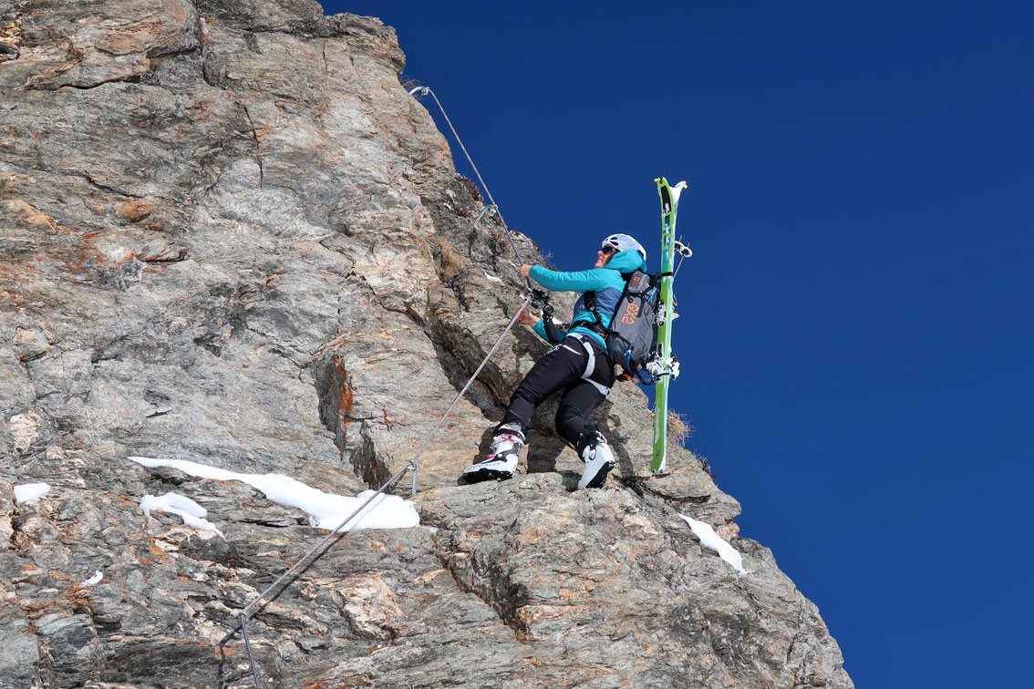 Komplette Klettersteigausrüstung und Helm, zusätzlich noch Lawinenausrüstung (LVS-Gerät, Sonde, Schaufel).