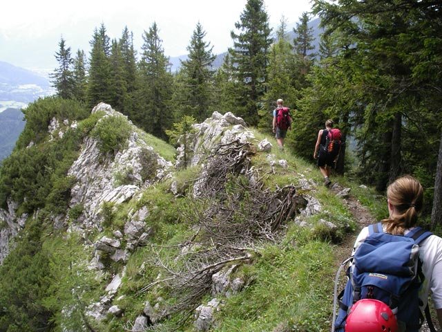 Über gesicherte (A bis A/B) und ungesicherte (1-) Felsstufen zum Ausstieg.