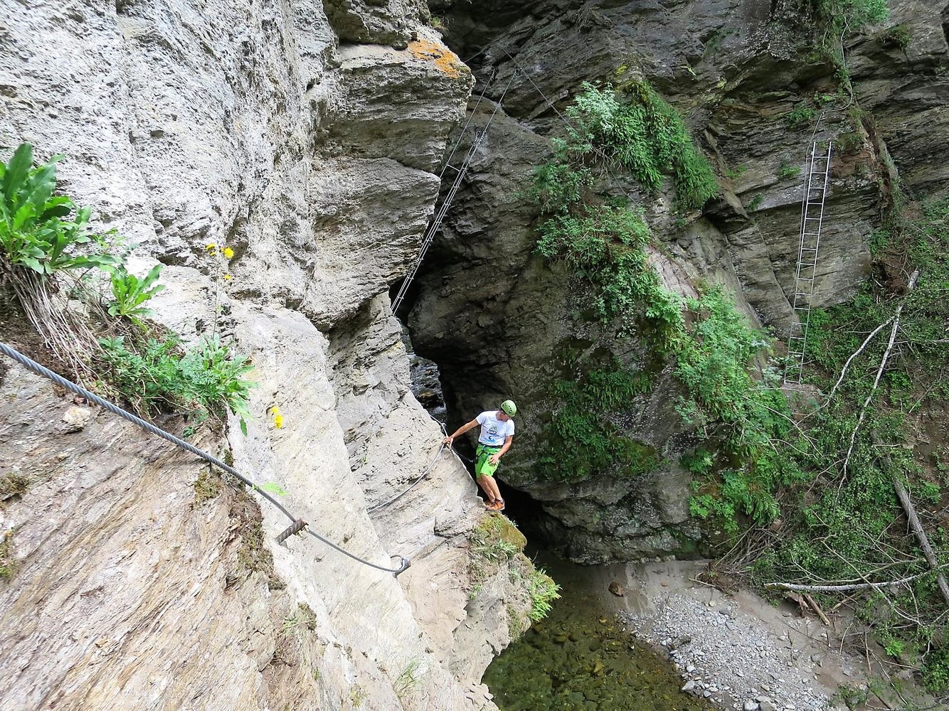 Wer den Notausstieg vor der oberen langen Steigbrücke nimmt, kann die Gesamtschwierigkeit auf C reduzieren.