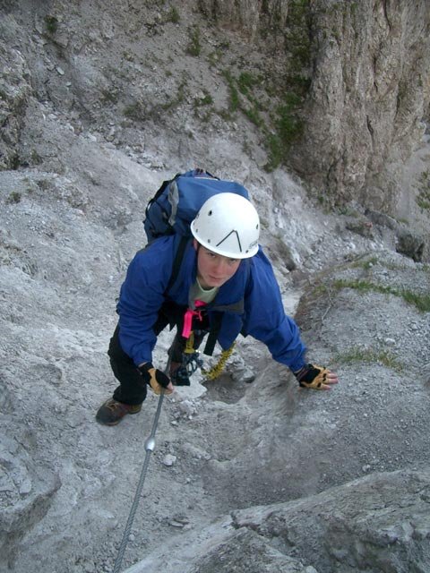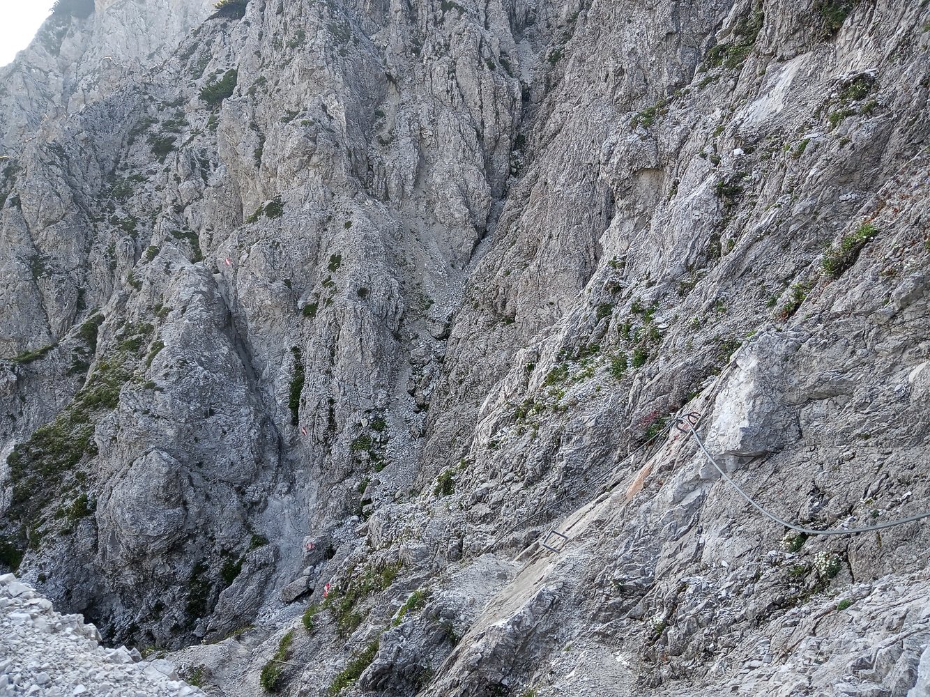 Sicherungsseil mit weiten Abständen zwischen den Verankerungen. An allen schwierigen Stellen ist eine Seilsicherung möglich.