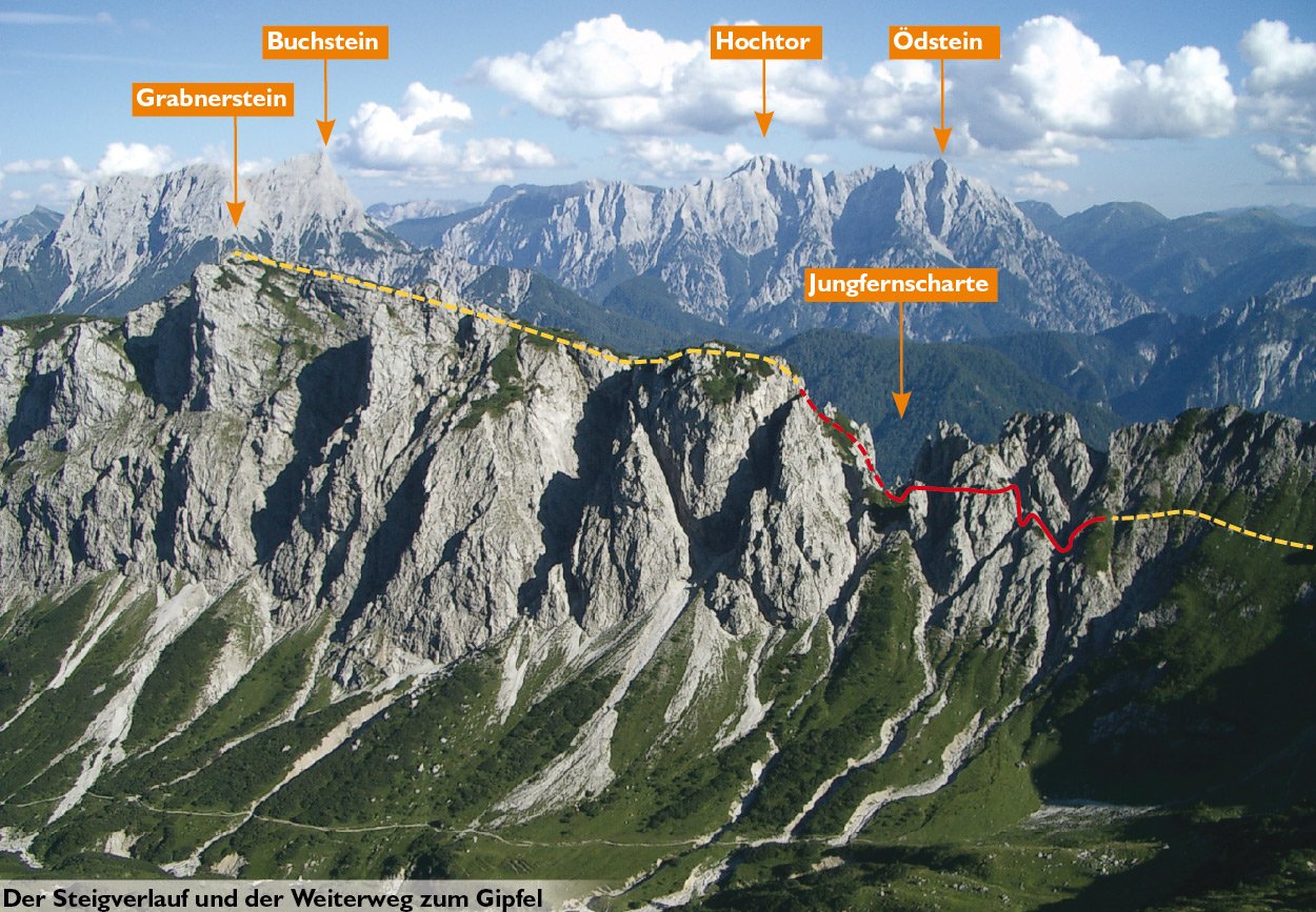 Richtung Admonter Haus - Grabnerstein: Nach einer leicht abfallenden Querung (A) wird in eine Scharte abgestiegen (A/B). Wiederaufstieg durch einen Kamin (B) und erneuter Abstieg (A/B) in eine weitere Scharte. Über eine große Rampe (B, im Abstieg unangenehm) gelangt man zu einer abfallenden Querung (A-A/B), die in die Jungfernscharte (1.718 m, Steigbuch) bringt. In der Scharte wird auf die andere Seite des Berges gewechselt und kurz abgestiegen (Gehgelände). Ein Aufschwung durch eine steile Rinne (A/B) führt abermals zu einem Stück Gehgelände. Nach einer etwas ausgesetzten Querung (A) ist der Ausstieg erreicht.