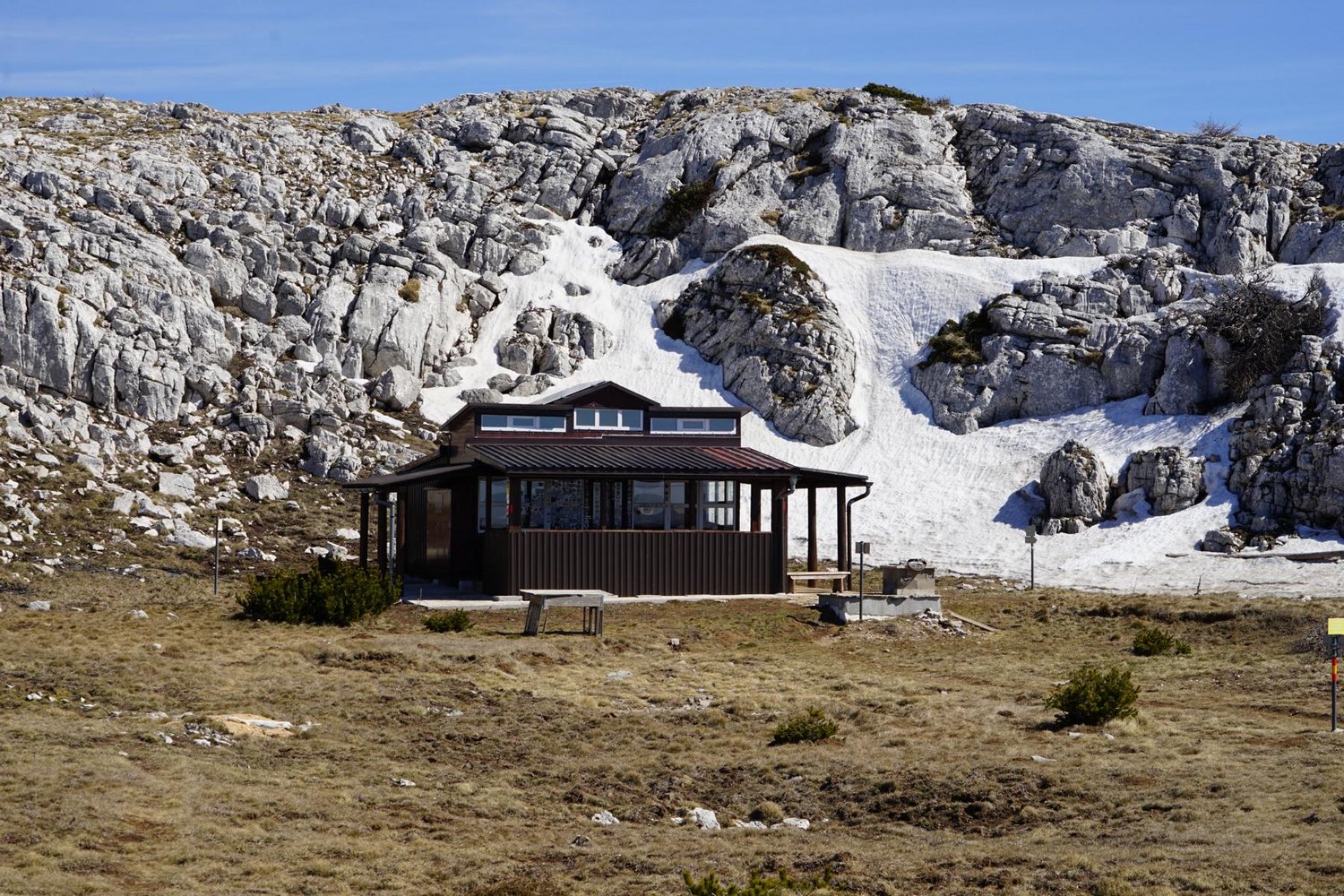 Alternativer Abstieg zur „Bili cvitek“-Hütte.: Vom Ausstieg 5 Min. zum Wandwerg aufsteigen und 300 m nach rechts zur Schutzhütte „Drago Grubać“ - dort gibt es Trinkwasser. Von der Hütte folgt man dem markierten Weg nach Südosten Richtung Glavaš und zweigt nach knapp 45 Minuten bei einer Tafel rechts Richtung „Bili cvitek“-Hütte ab. In weiteren 1,5 Stunden erreicht man die „Bili cvitek“-Hütte und in weiteren knapp 30 Min. den Parkplatz.