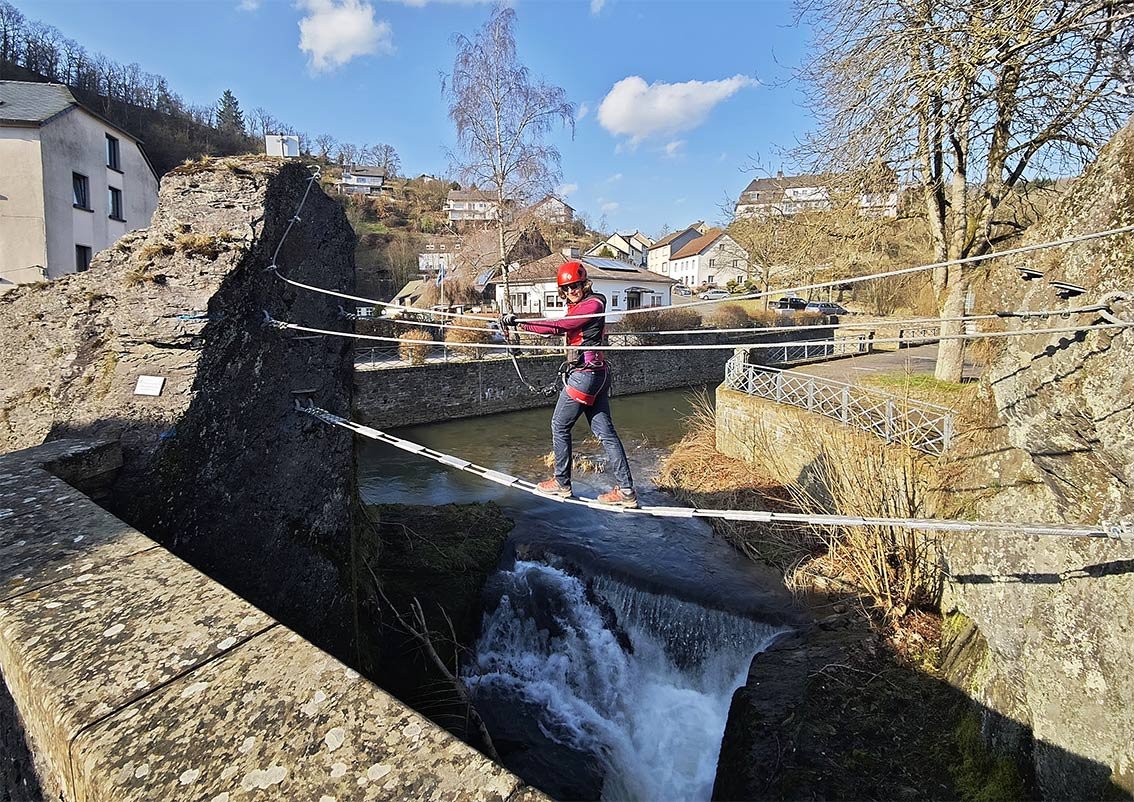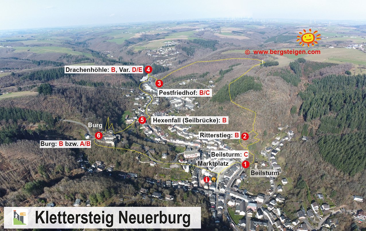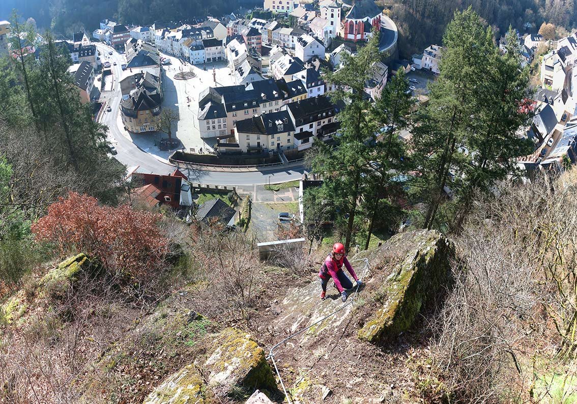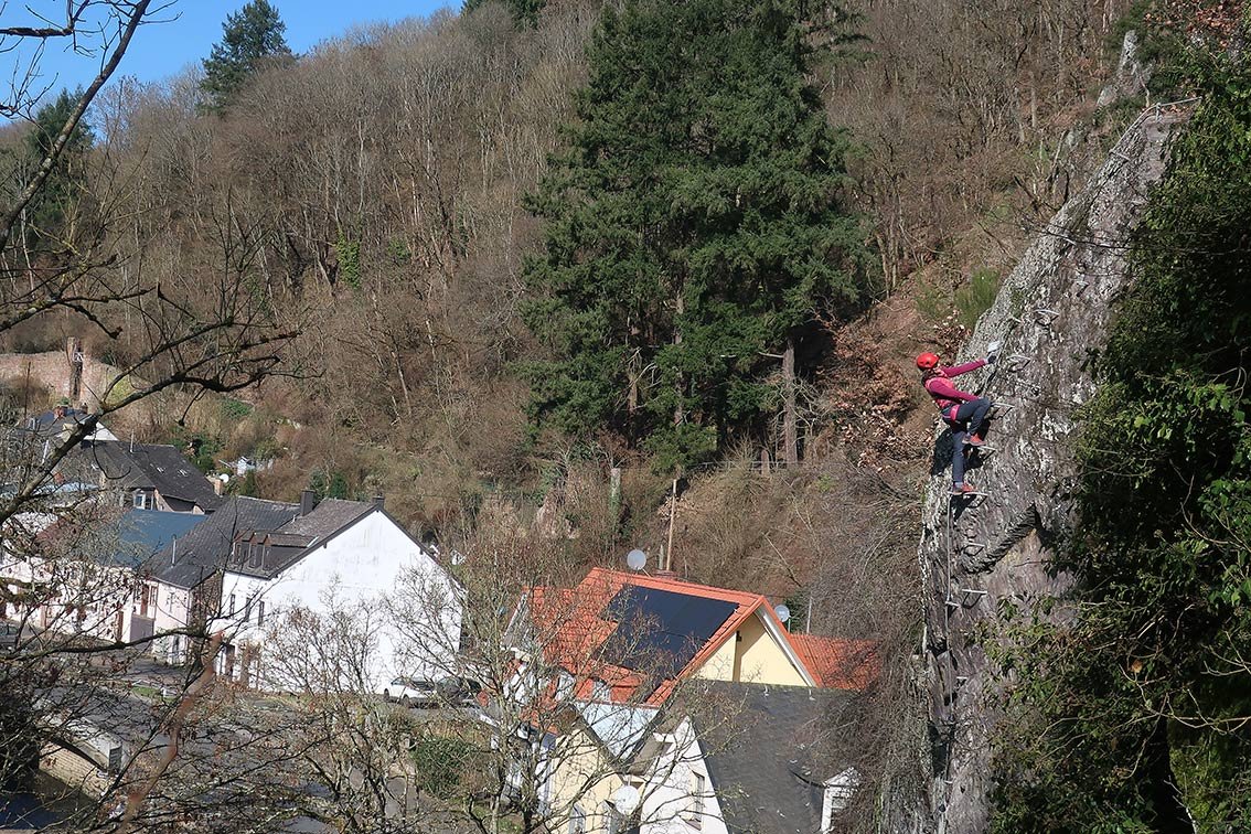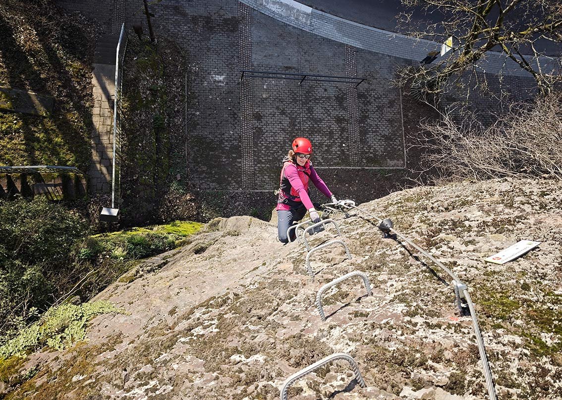 Ein Klettersteig als Stadtbummel? So etwas kann man im Eifelstädtchen Neuerburg erleben. In sechs Klettersteigstationen wandert man um bzw. direkt durch die Stadt Neuerburg. Namen wie Pestfriedhof, Drachenhöhle, Burg oder Hexenfall lassen schon vorab etwas erahnen, wohin der Weg führt. Das Gute an diesem Klettersteig: Alle Passagen können einfach umwandert werden! Am Ende der Klettersteigrunde geht man auf einem mittelalterlichen Weg quer durch die Stadt hinunter zum Marktplatz – spätestens dann hat man das kleine Eifel-Städtchen direkt in sein Klettersteig-Herz geschlossen.