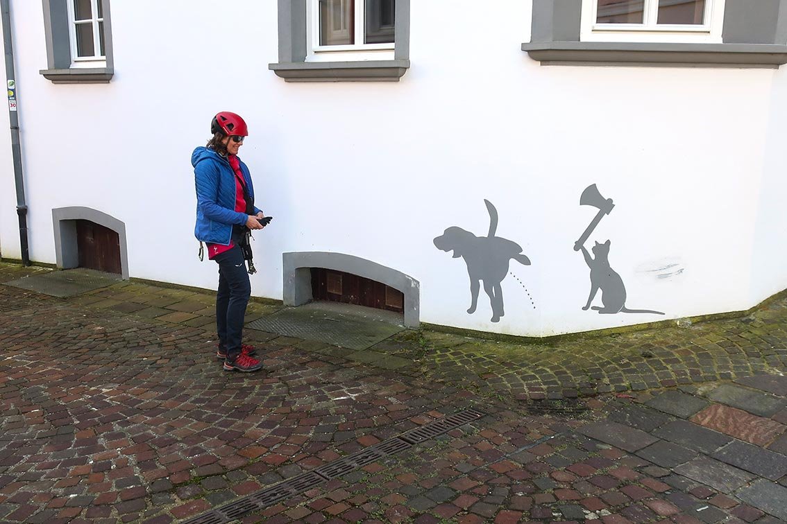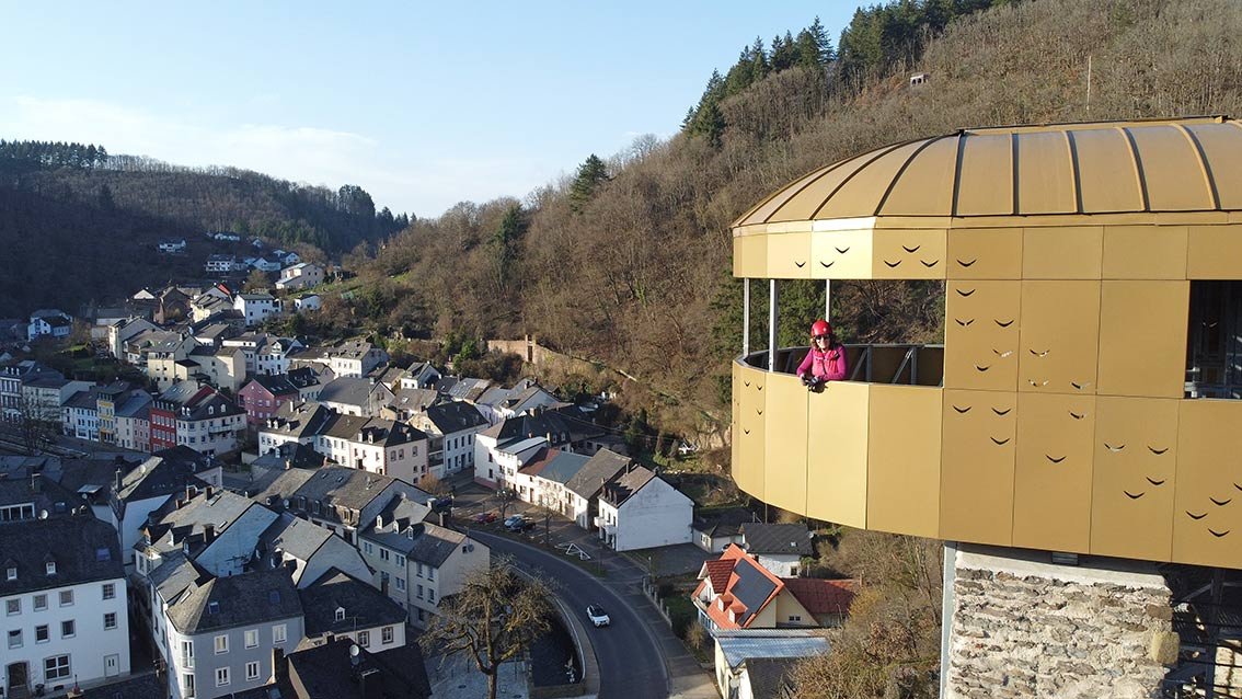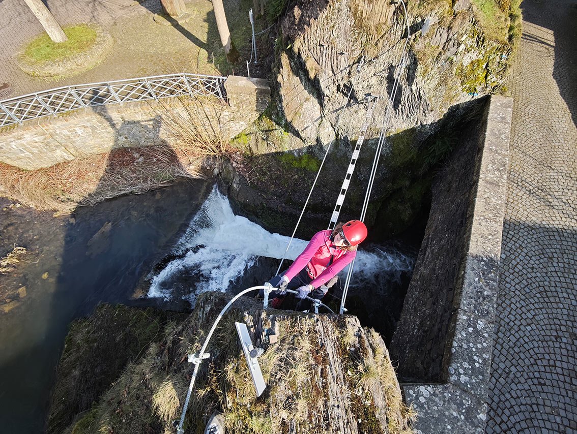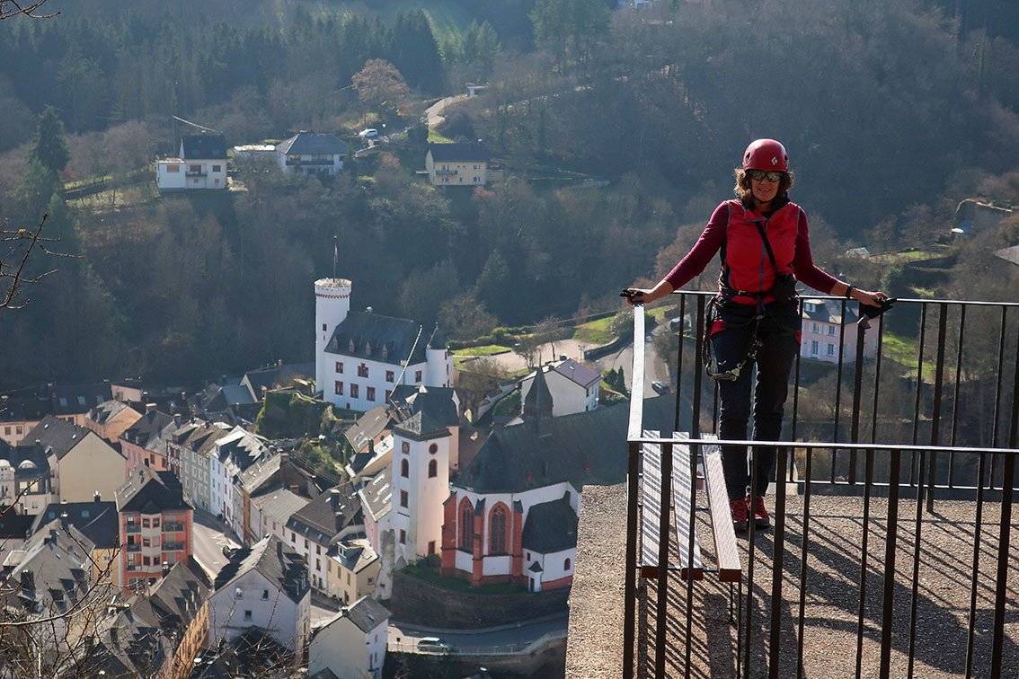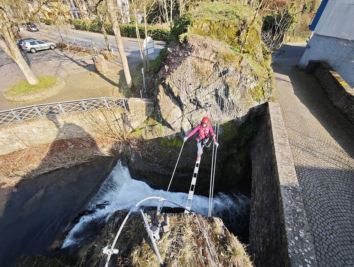 Ein Klettersteig als Stadtbummel? So etwas kann man im Eifelstädtchen Neuerburg erleben. In sechs Klettersteigstationen wandert man um bzw. direkt durch die Stadt Neuerburg. Namen wie Pestfriedhof, Drachenhöhle, Burg oder Hexenfall lassen schon vorab etwas erahnen, wohin der Weg führt. Das Gute an diesem Klettersteig: Alle Passagen können einfach umwandert werden! Am Ende der Klettersteigrunde geht man auf einem mittelalterlichen Weg quer durch die Stadt hinunter zum Marktplatz – spätestens dann hat man das kleine Eifel-Städtchen direkt in sein Klettersteig-Herz geschlossen.