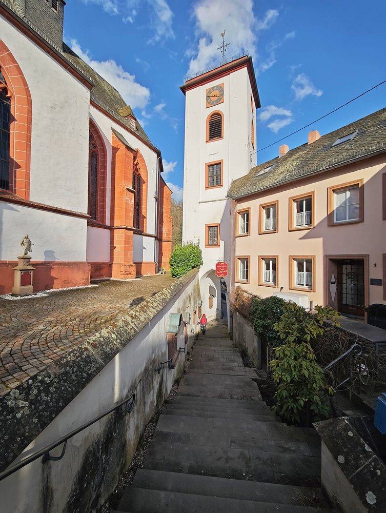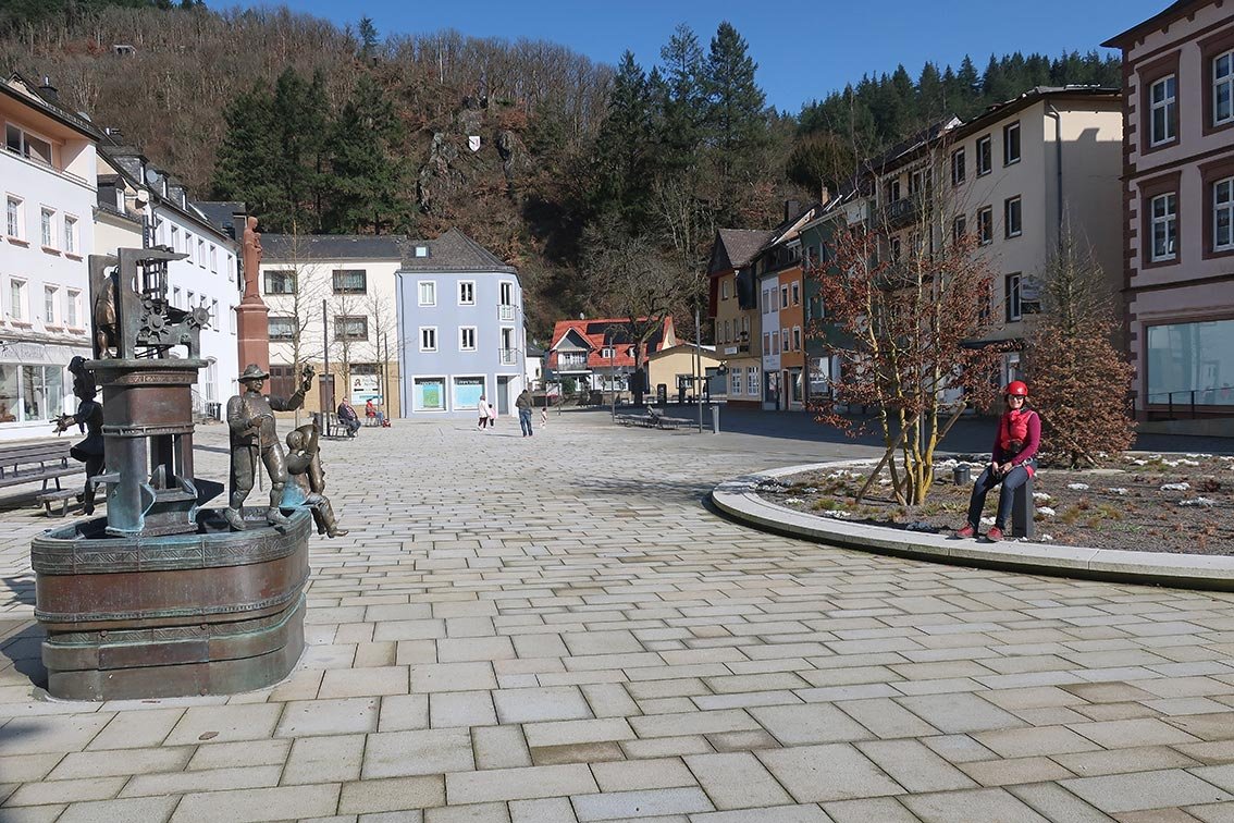 Vom Marktplatz zur Hauptstraße und auf die andere Straßenseite zur schon sichtbaren Felswand links von der Treppe zum Beilsturm.
