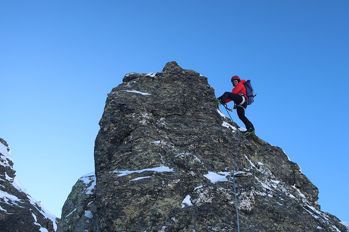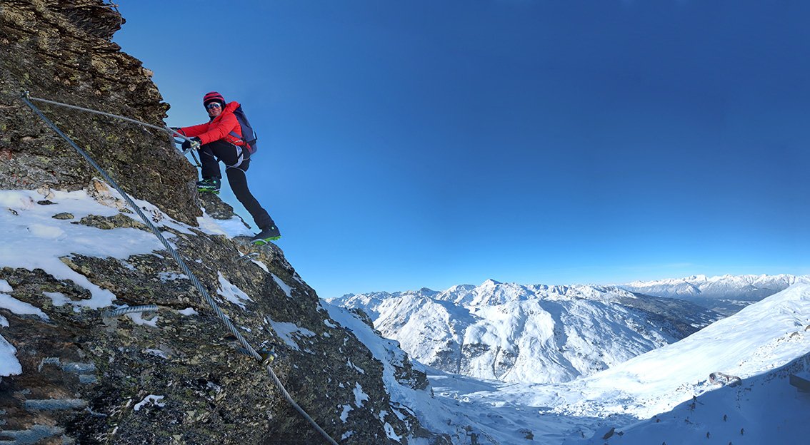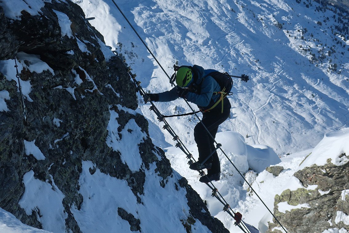 Komplette Klettersteigausrüstung und im Winter LVS-Ausrüstung (der Hang mit dem Abstiegsweg ist steil, die Lawinengefahr ist dort auf jeden Fall zu beachten). Bei starker Eisbildung können auch Steigeisen nötig sein, das merkt man evtl. aber schon auf dem dann vermutlich auch sehr glatten Zustiegsweg.