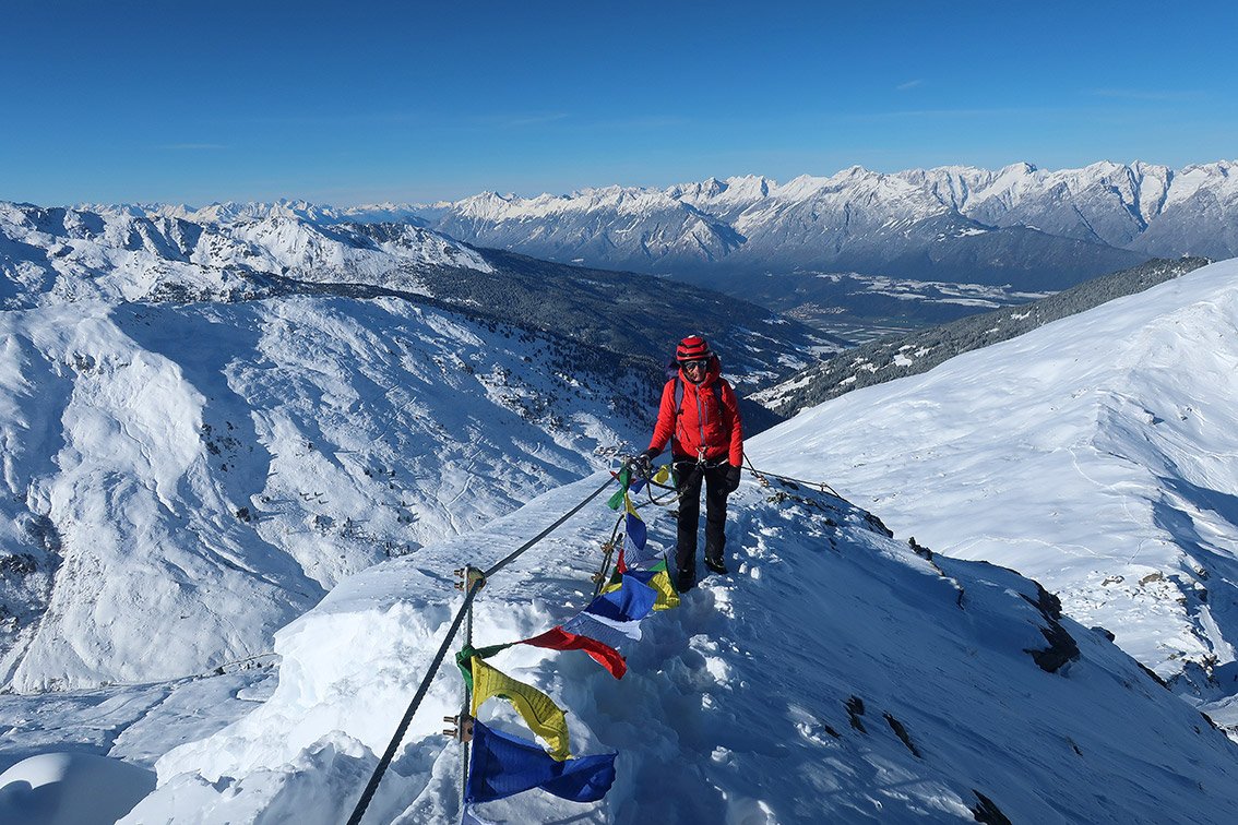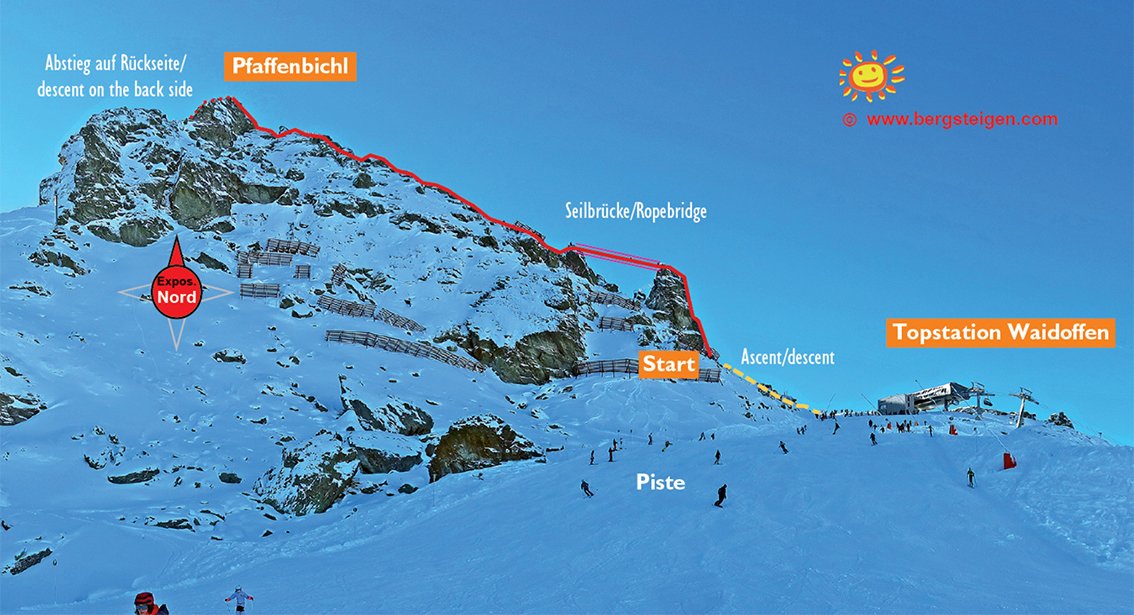 Der Klettersteig Pfaffenbichl ist als Winterklettersteig konzipiert und überwindet diverse Felsblöcke bis hinauf zum bekannten Aussichtsgipfel hoch oberhalb des Skigebietes. Man kraxelt immer über kurze Felsstufe und Blöcke - das Highlight ist eine 30 Meter lange Nepalbrücke gleich nach dem ersten Turm. Der Aufstieg zum Pfaffenbichl ist im Tiroler Unterland vermutlich die am häufigsten begangene Pistenskitour (es geht meist recht früh in der Skitourensaison); mehr als 100 Tourengeher auf der Skipiste sind oft keine Seltenheit, die Gipfel-Ferrata ist jetzt quasi das Tüpfelchen auf dem i.