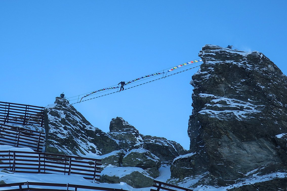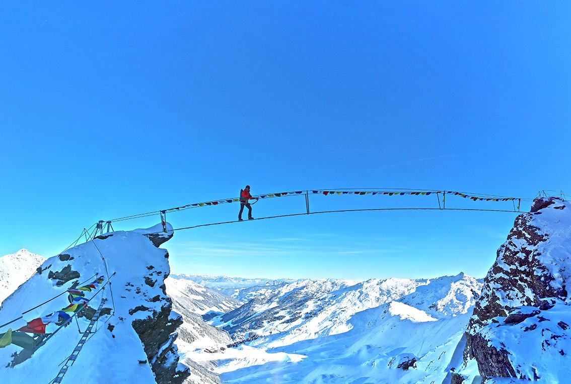 Achtung: Bei stärkerem Wind ist die dann schwankende Seilbrücke eine Herausforderung und anspruchsvoll! Warning: In strong winds, the swinging rope bridge can be challenging and demanding!