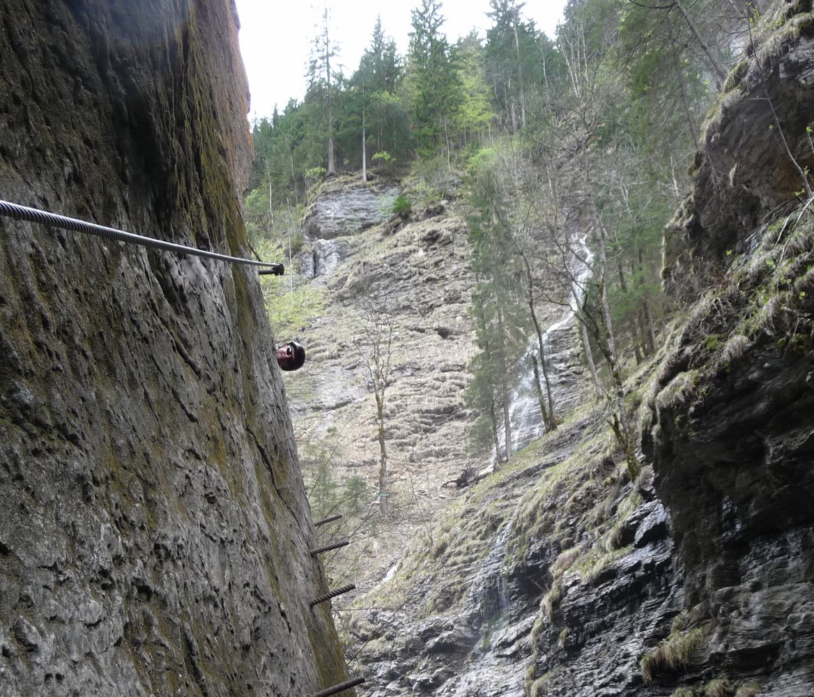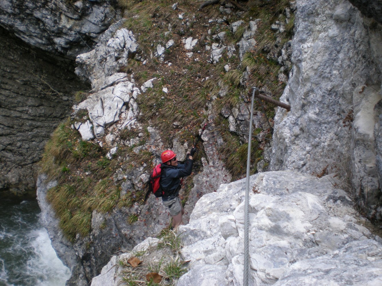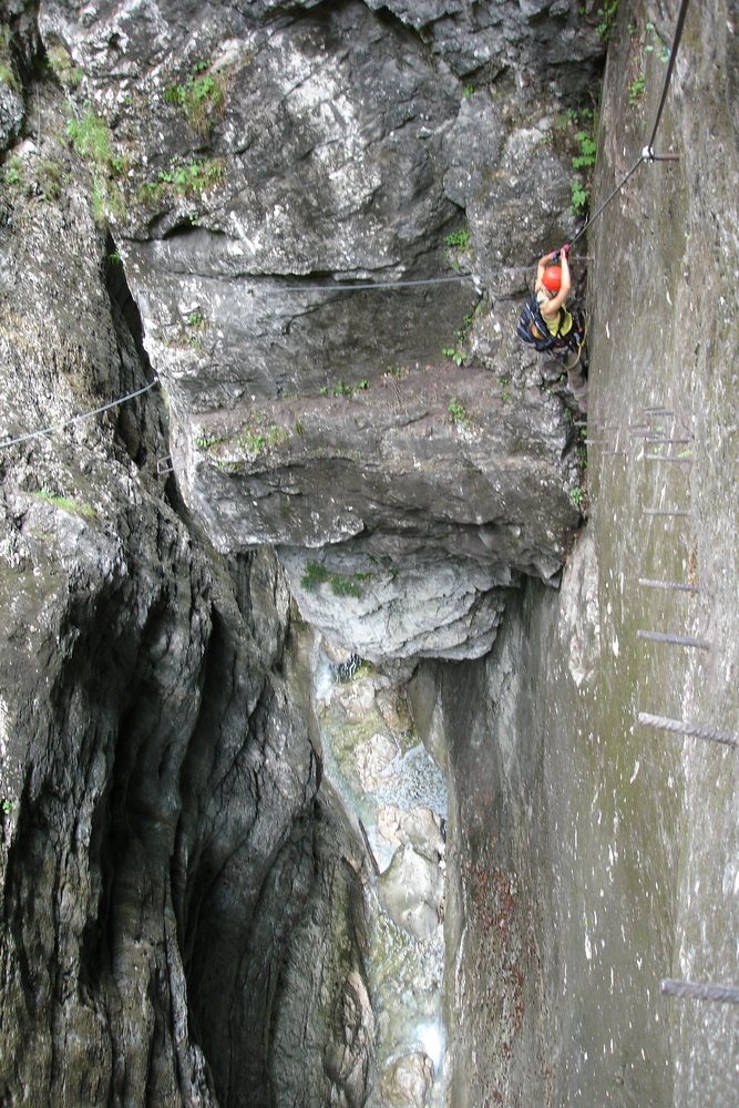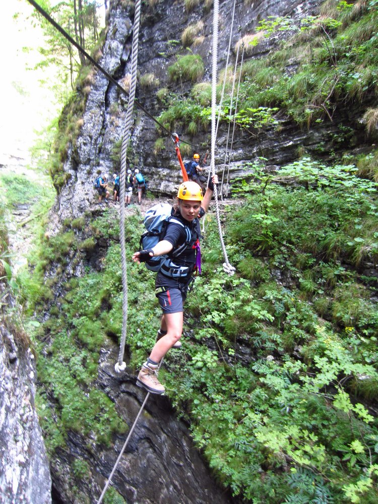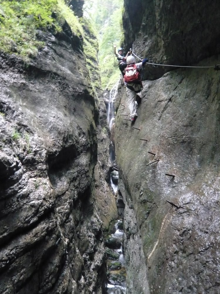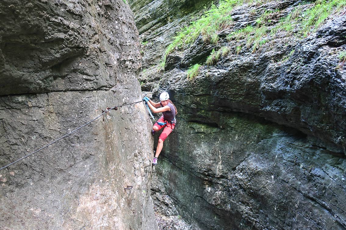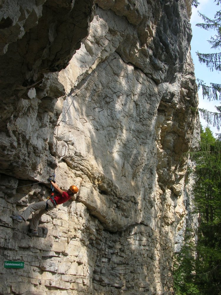 Gamsleckenwand: Auf dem Pfad weiter zur sehr steilen und überhängenden Schlusswand, der sog. Gamsleckenwand (D, wer dort schon genug hat, kann nach links auf schönem Steig leicht aus der Schlucht aussteigen). Der Klettersteig geht ab dort rechts über zwei Überhänge, über einen langen und luftigen Quergang und die anschließende Steilwand wird der vorläufige Ausstieg erreicht. In diesem Bereich gibt es auch eine kurze F-Variante.