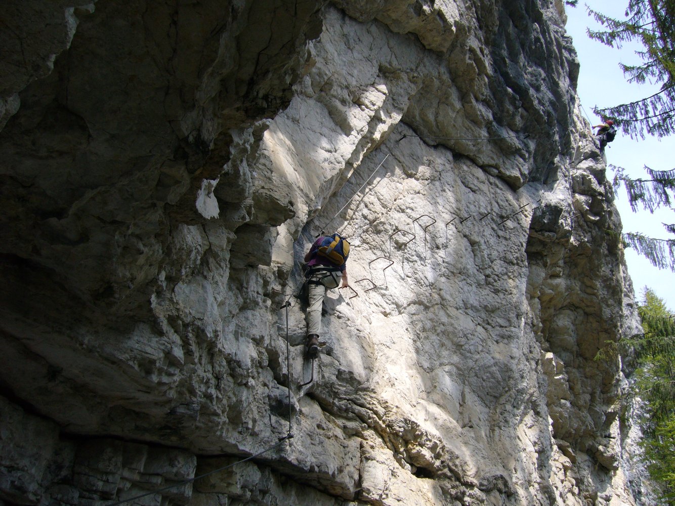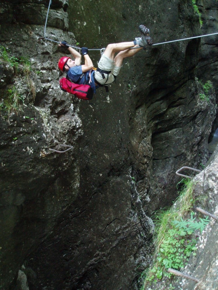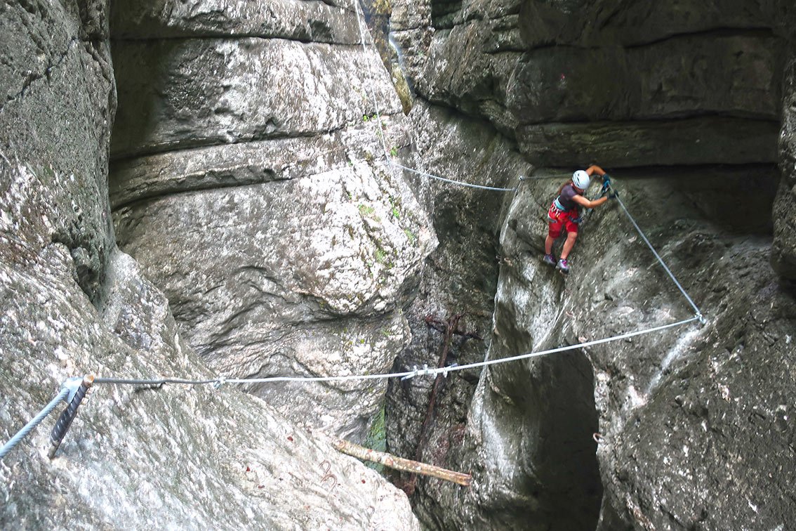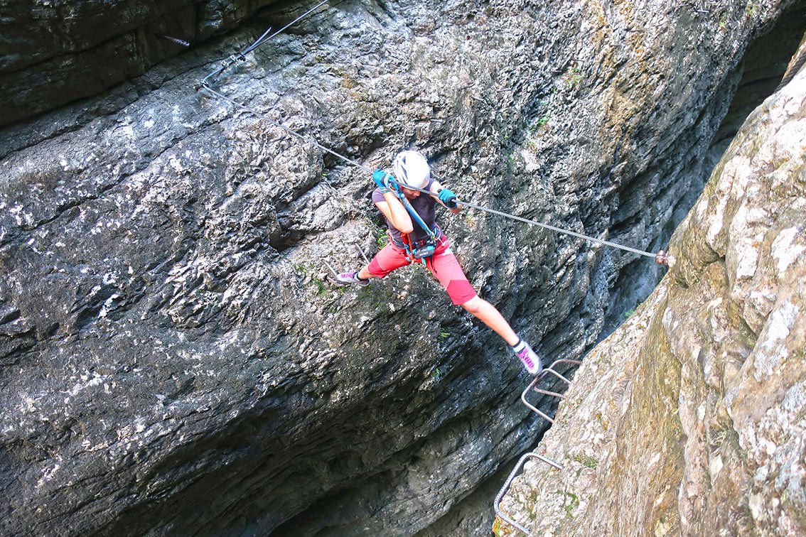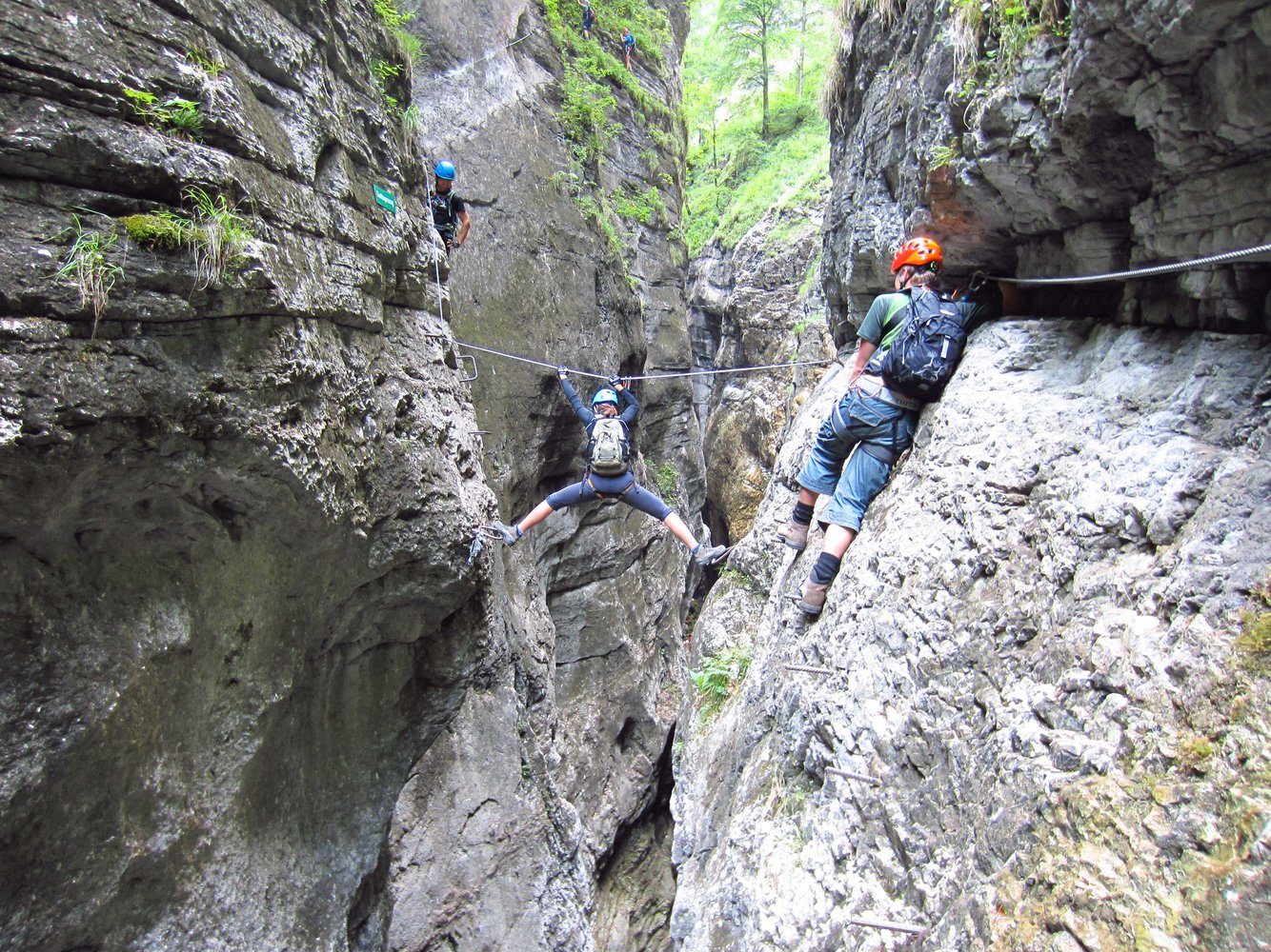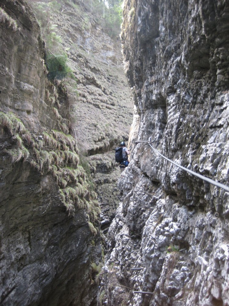 Gamsleckenwand: Auf dem Pfad weiter zur sehr steilen und überhängenden Schlusswand, der sog. Gamsleckenwand (D, wer dort schon genug hat, kann nach links auf schönem Steig leicht aus der Schlucht aussteigen). Der Klettersteig geht ab dort rechts über zwei Überhänge, über einen langen und luftigen Quergang und die anschließende Steilwand wird der vorläufige Ausstieg erreicht. In diesem Bereich gibt es auch eine kurze F-Variante.
