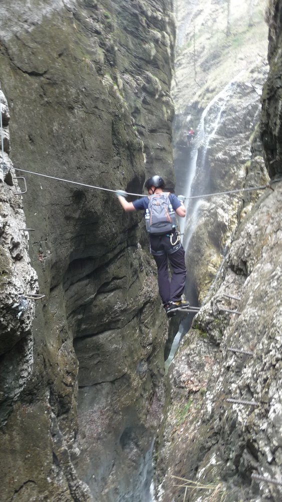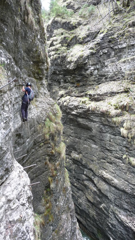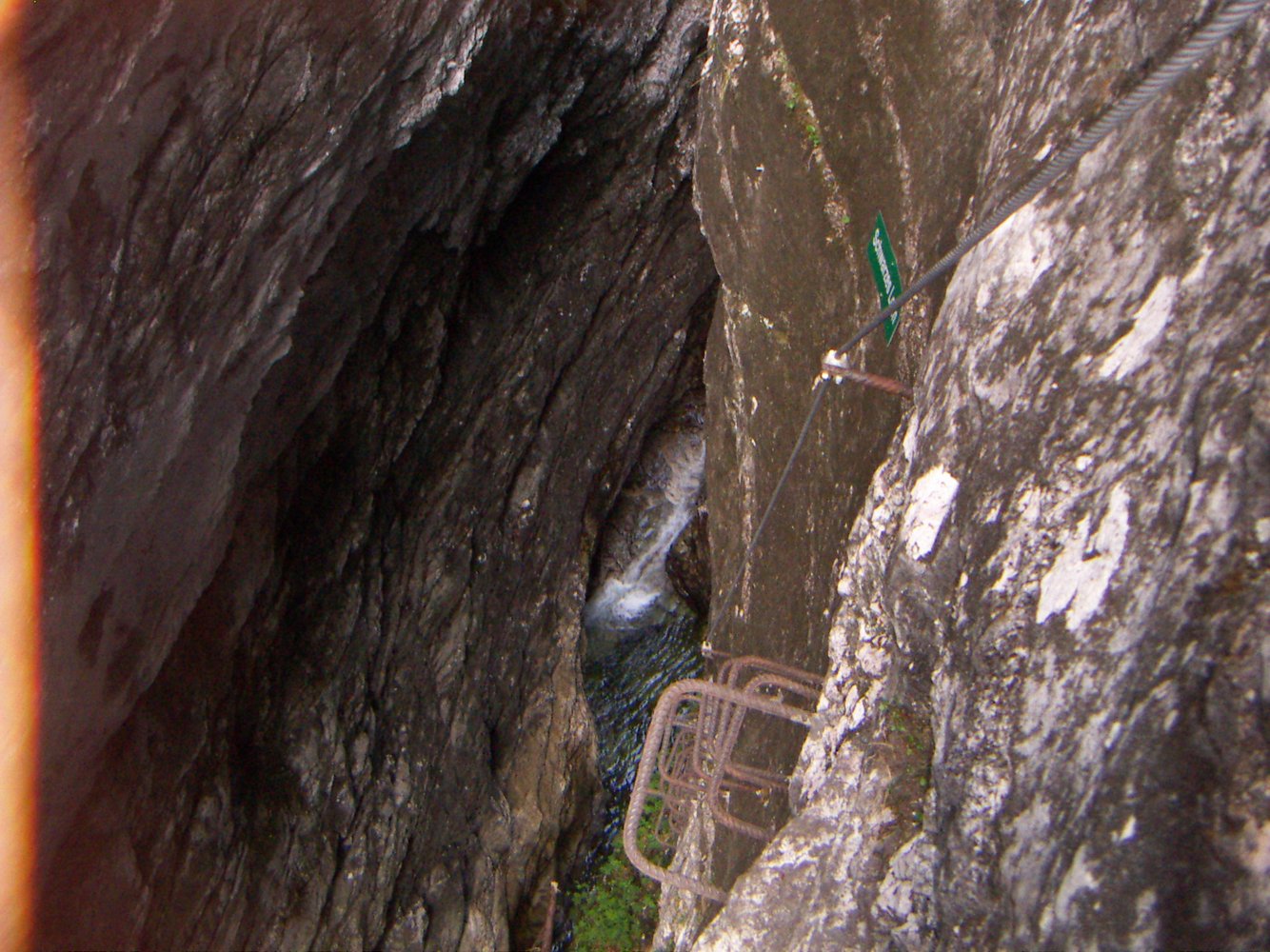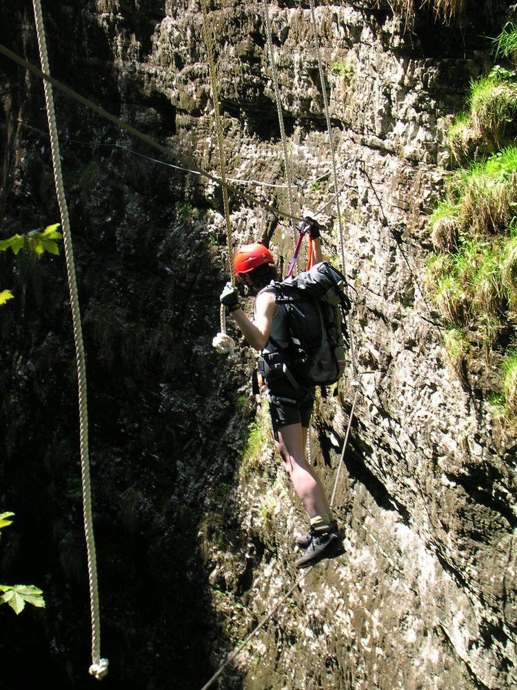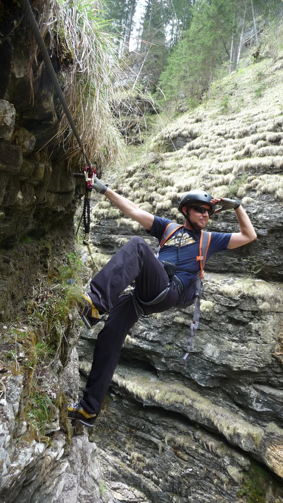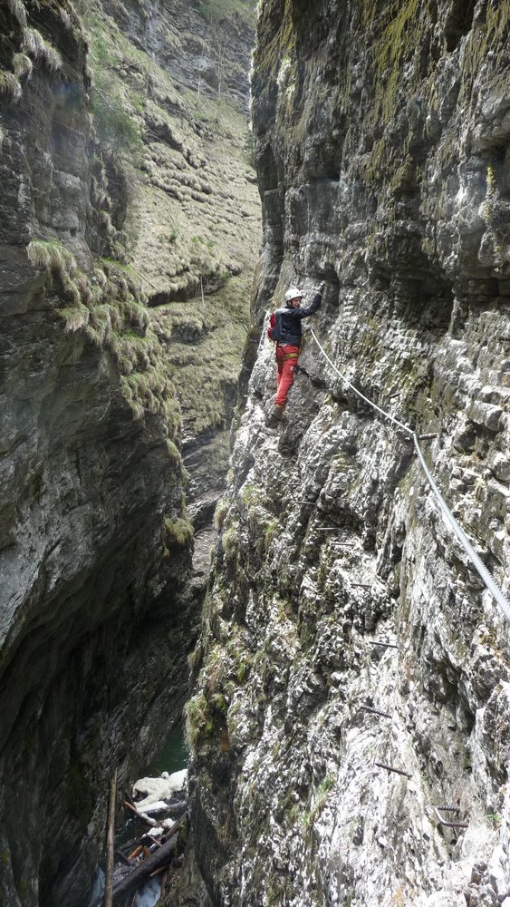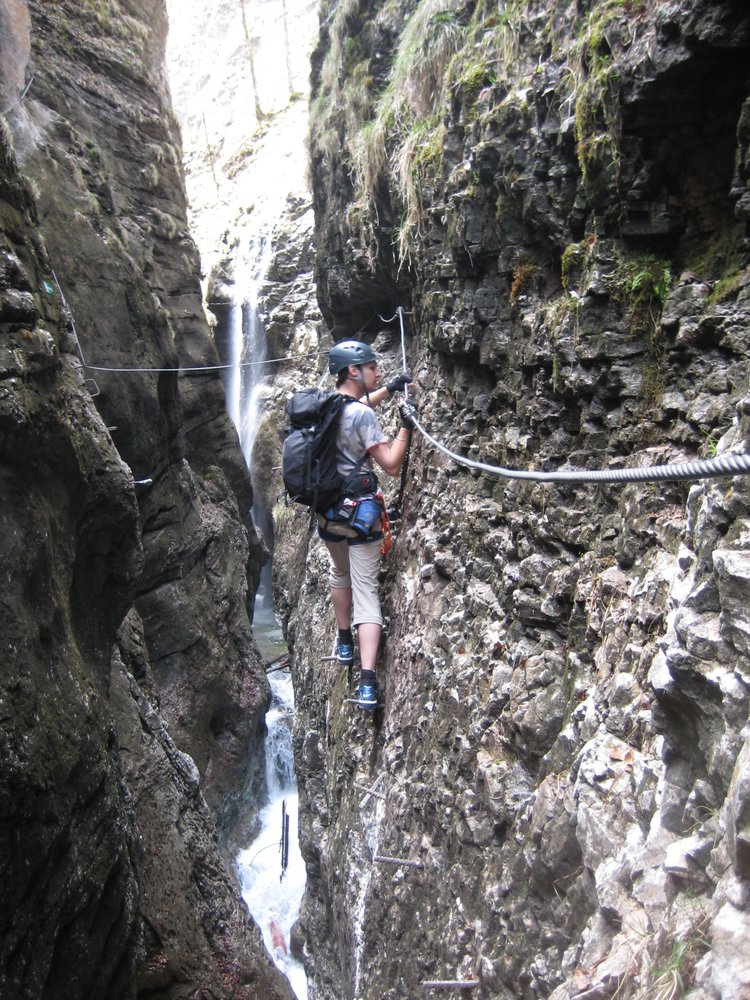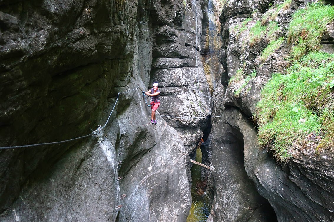 Gamsleckenwand: Auf dem Pfad weiter zur sehr steilen und überhängenden Schlusswand, der sog. Gamsleckenwand (D, wer dort schon genug hat, kann nach links auf schönem Steig leicht aus der Schlucht aussteigen). Der Klettersteig geht ab dort rechts über zwei Überhänge, über einen langen und luftigen Quergang und die anschließende Steilwand wird der vorläufige Ausstieg erreicht. In diesem Bereich gibt es auch eine kurze F-Variante.