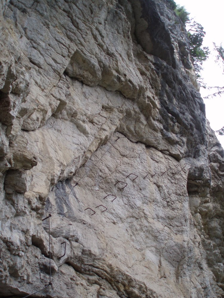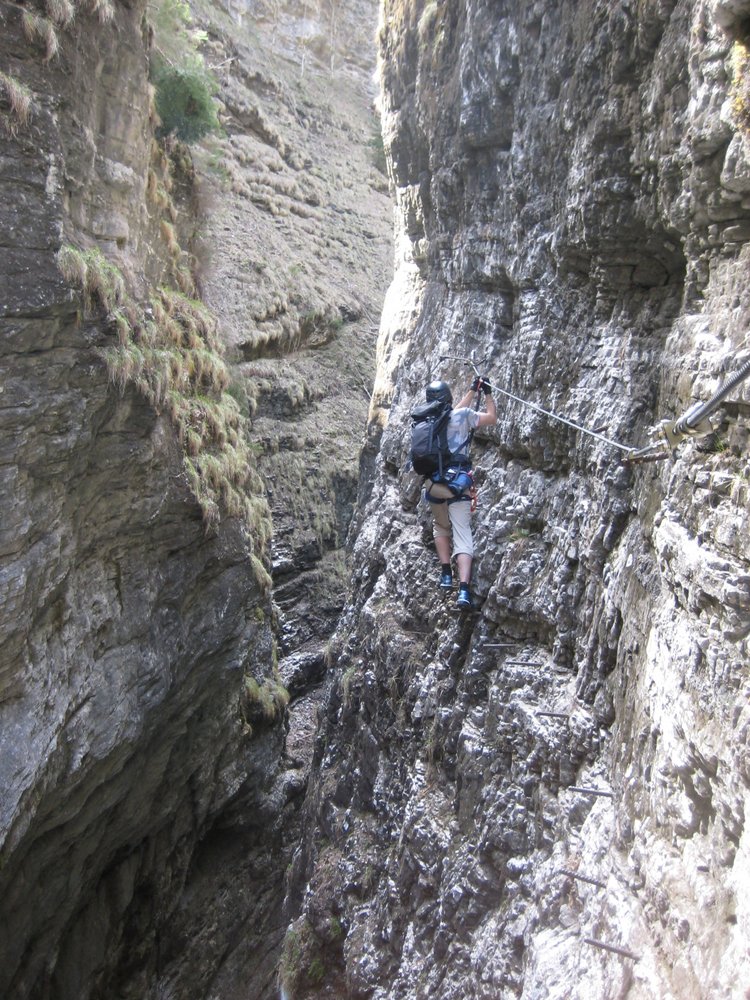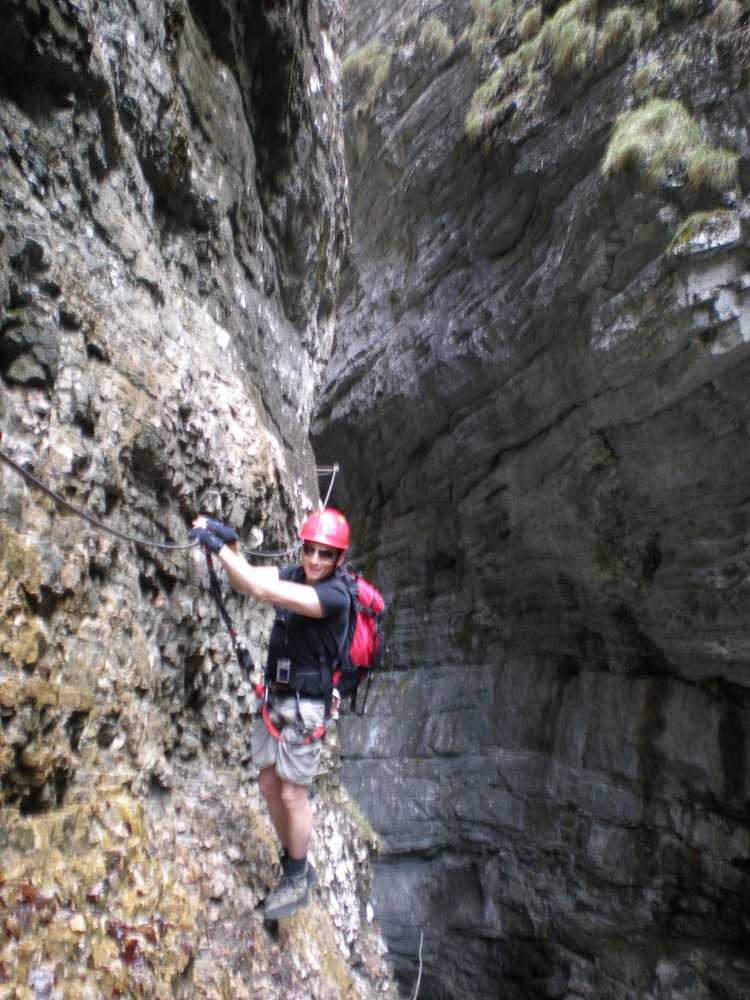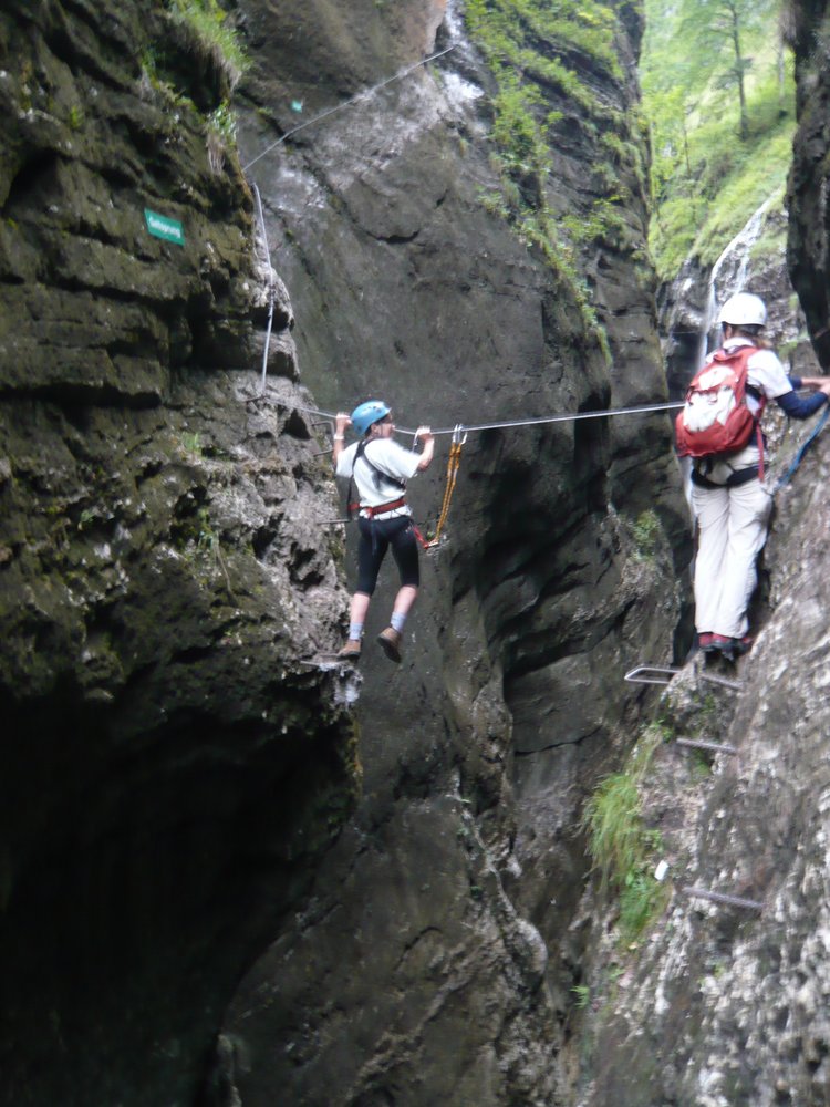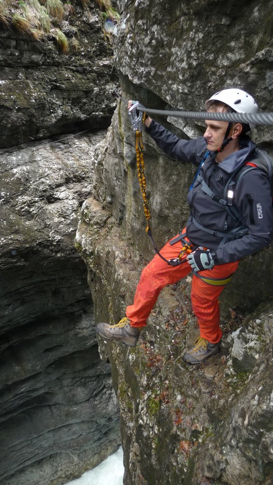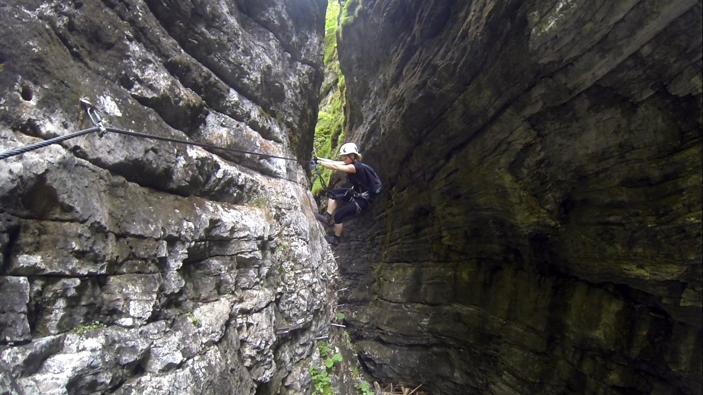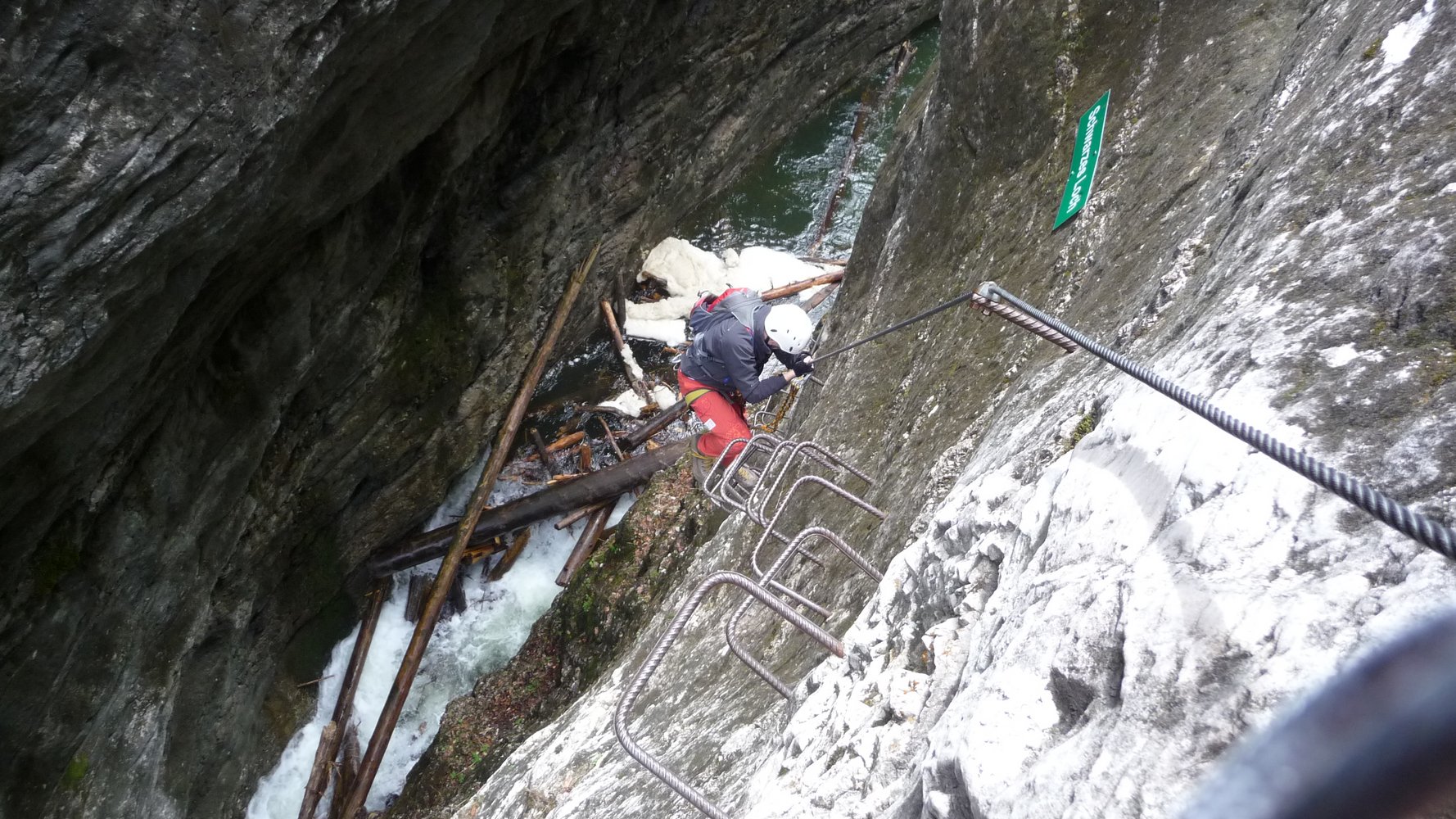 Gamsleckenwand: Auf dem Pfad weiter zur sehr steilen und überhängenden Schlusswand, der sog. Gamsleckenwand (D, wer dort schon genug hat, kann nach links auf schönem Steig leicht aus der Schlucht aussteigen). Der Klettersteig geht ab dort rechts über zwei Überhänge, über einen langen und luftigen Quergang und die anschließende Steilwand wird der vorläufige Ausstieg erreicht. In diesem Bereich gibt es auch eine kurze F-Variante.