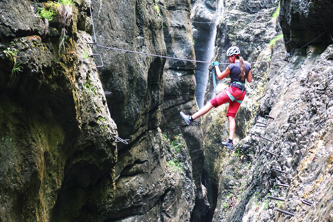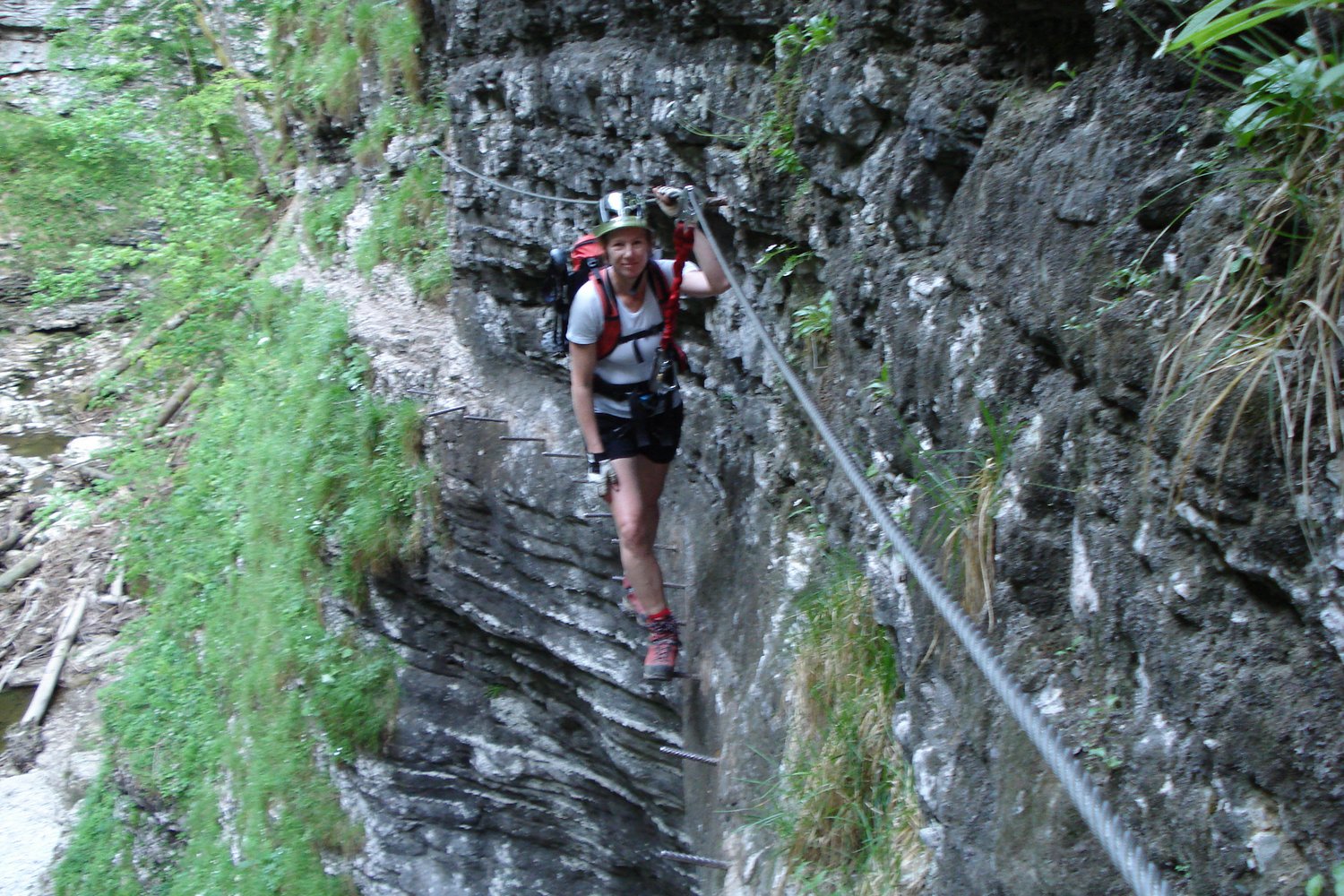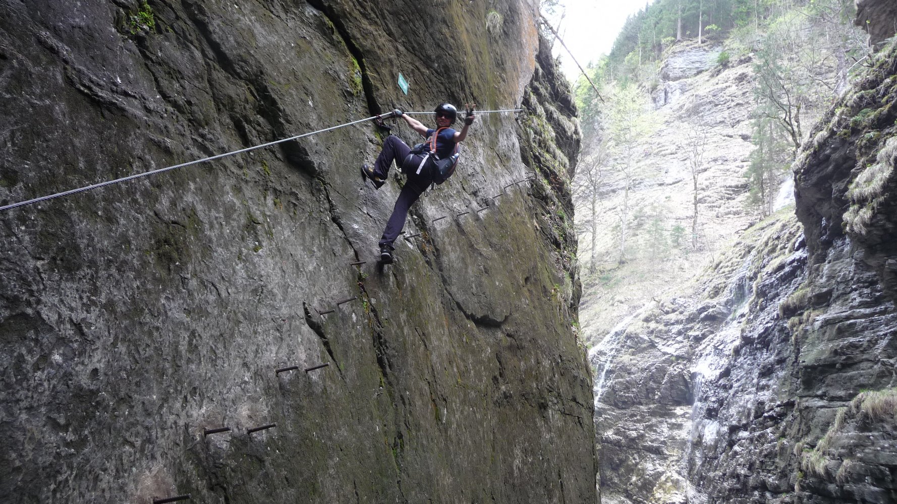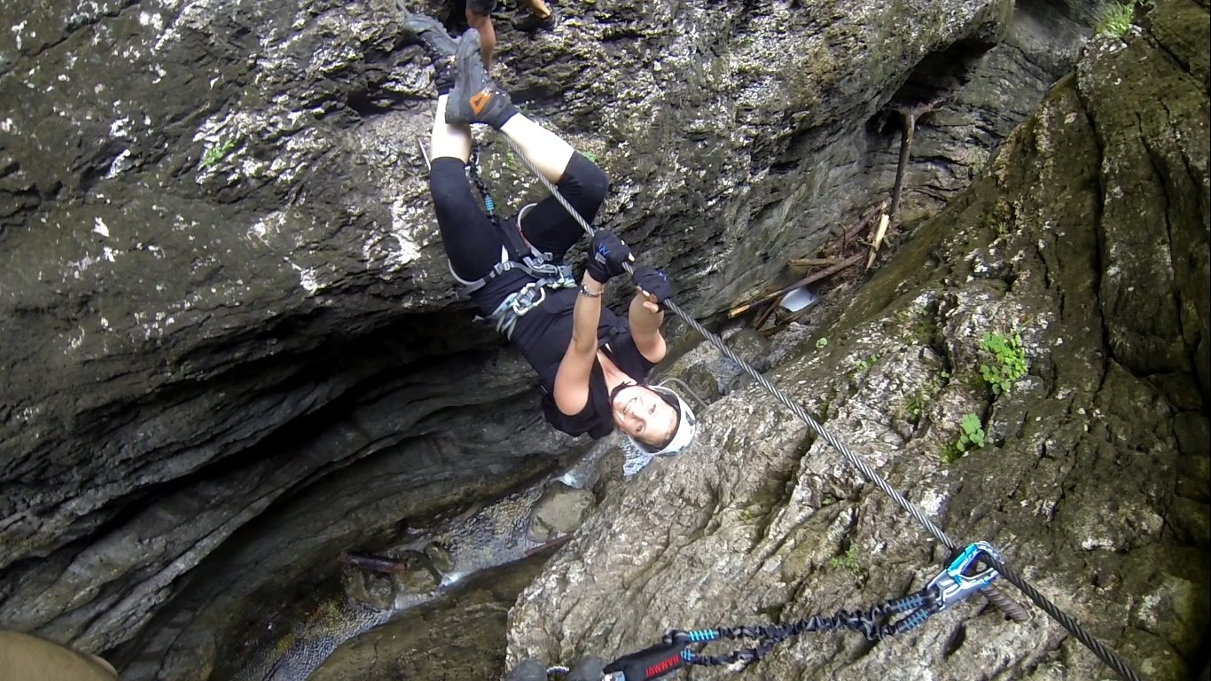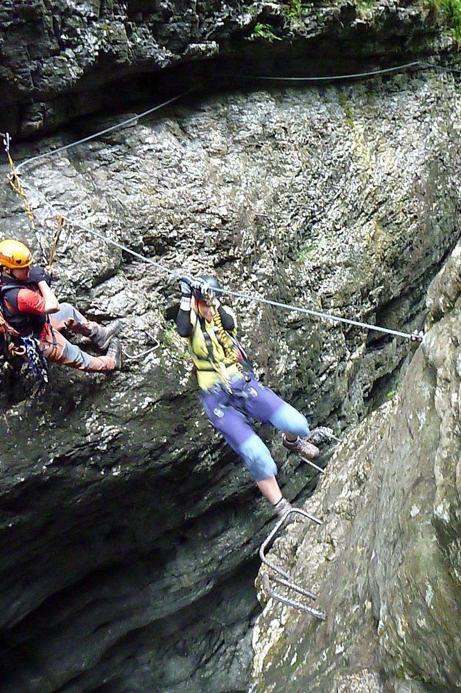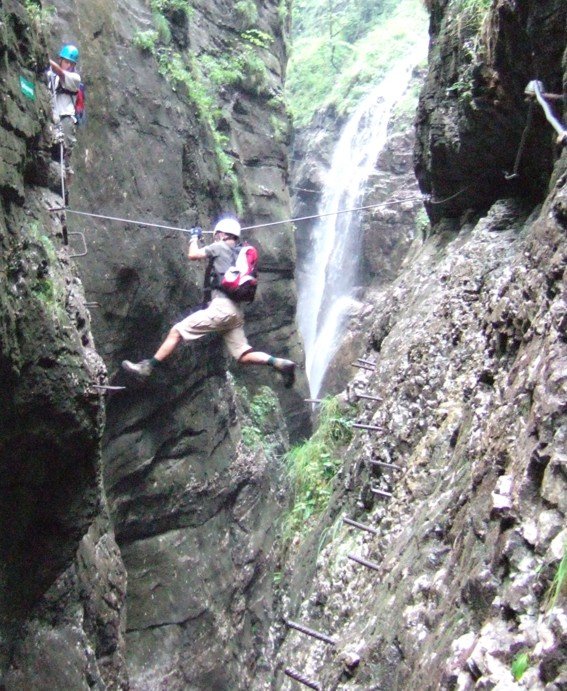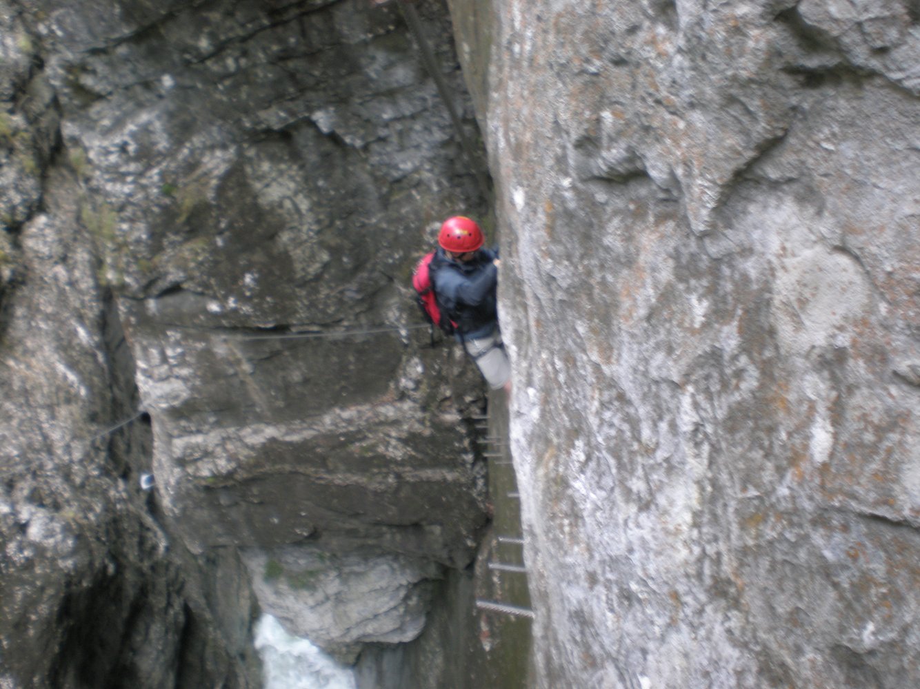 Gamsleckenwand: Auf dem Pfad weiter zur sehr steilen und überhängenden Schlusswand, der sog. Gamsleckenwand (D, wer dort schon genug hat, kann nach links auf schönem Steig leicht aus der Schlucht aussteigen). Der Klettersteig geht ab dort rechts über zwei Überhänge, über einen langen und luftigen Quergang und die anschließende Steilwand wird der vorläufige Ausstieg erreicht. In diesem Bereich gibt es auch eine kurze F-Variante.