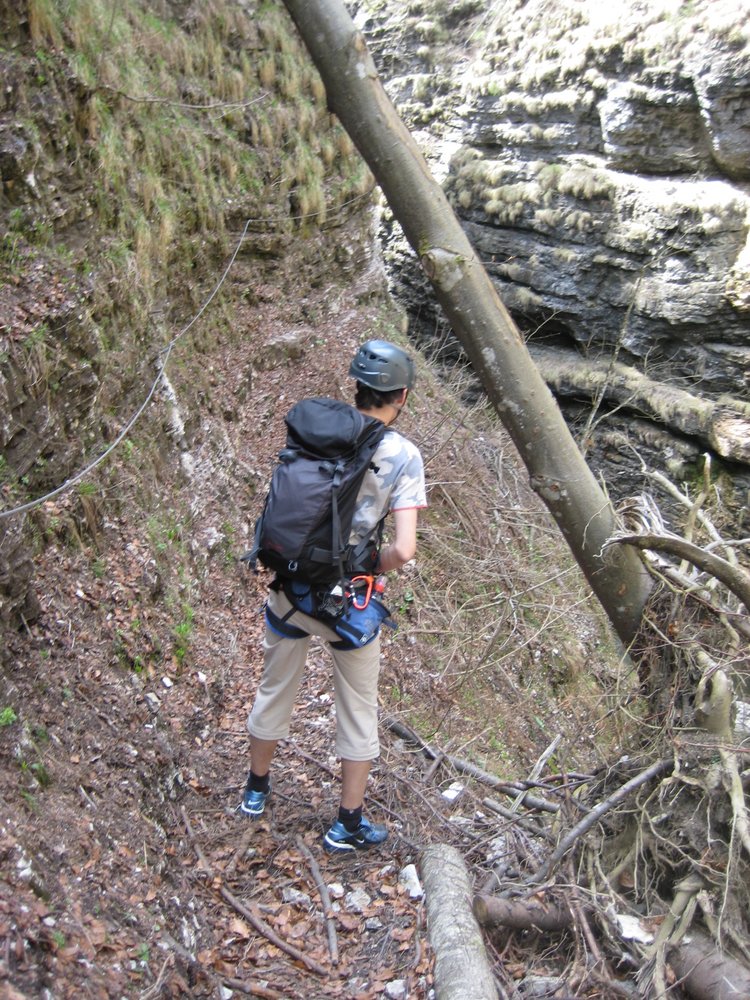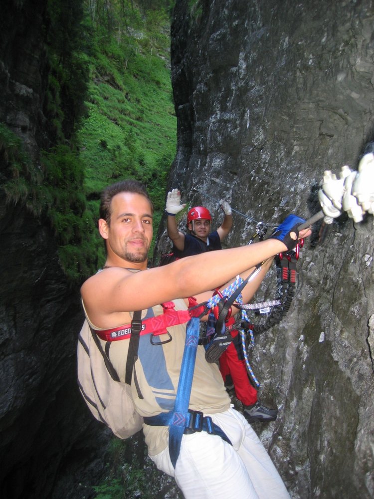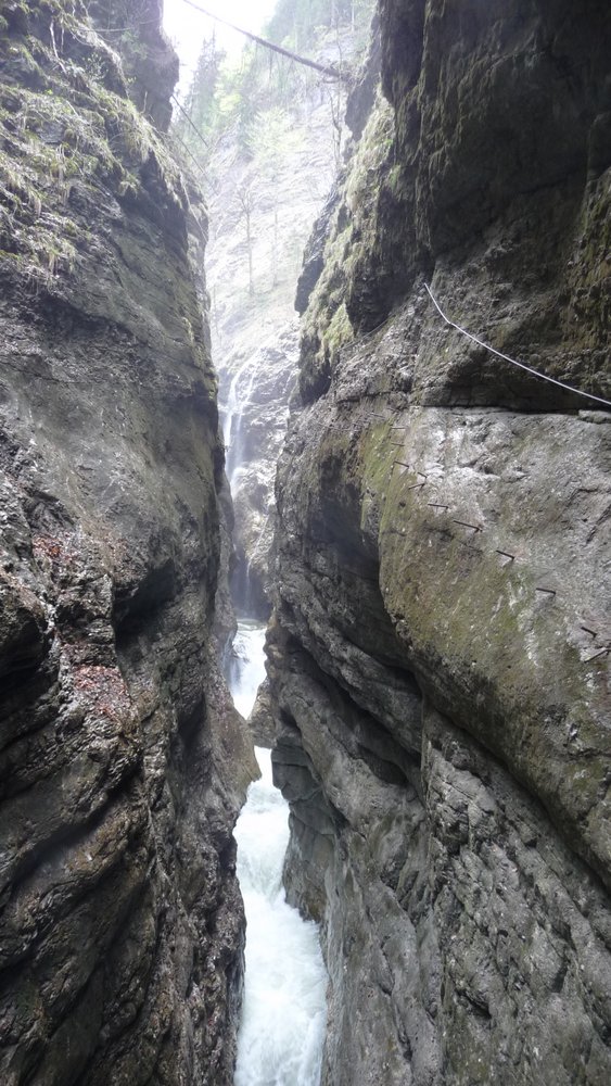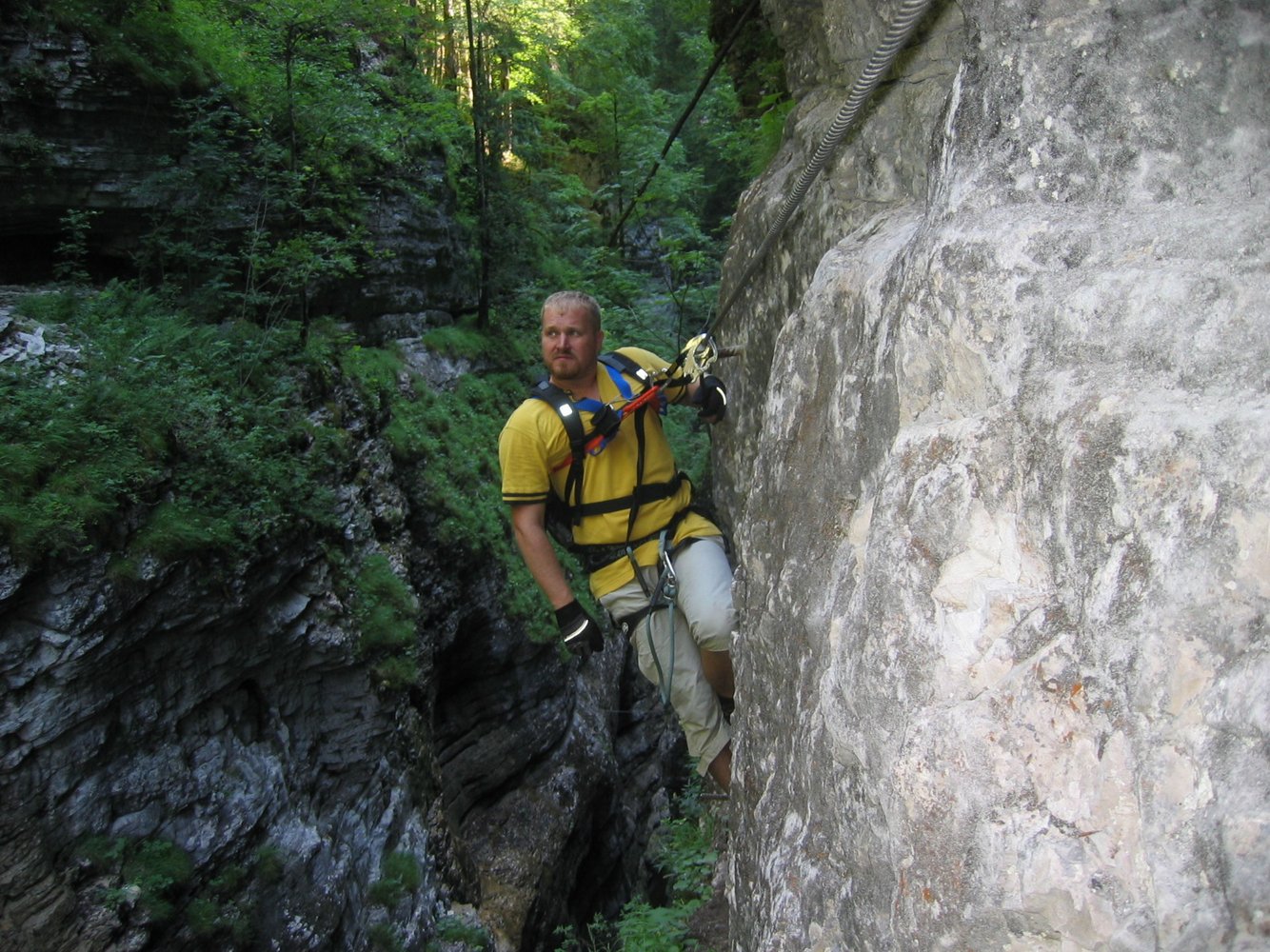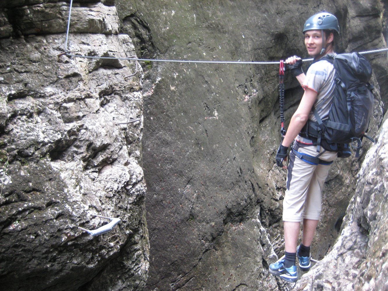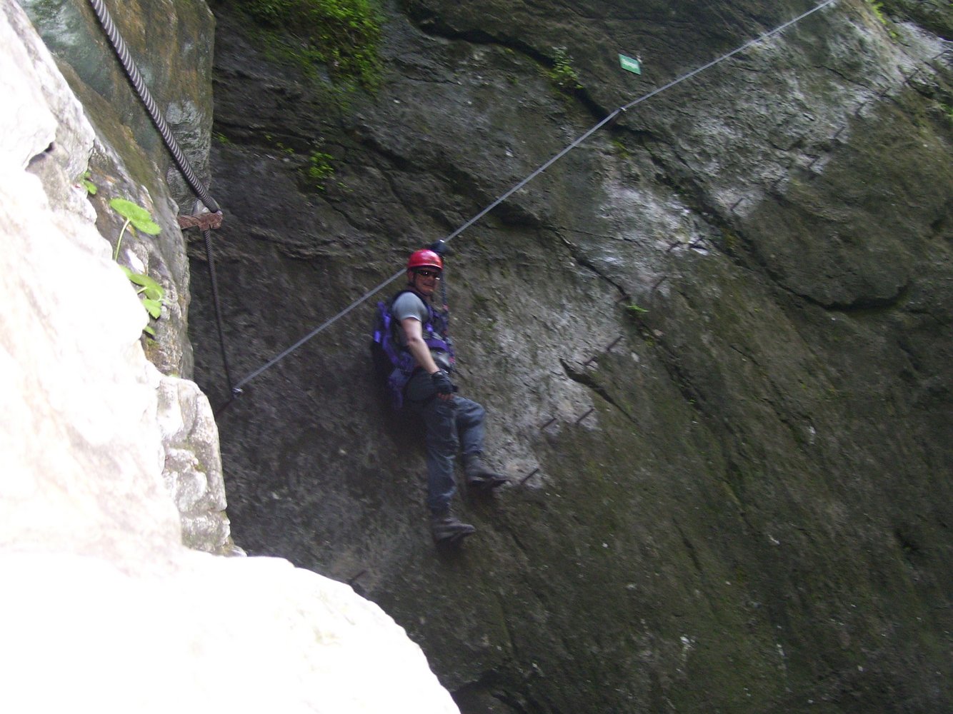 Gamsleckenwand: Auf dem Pfad weiter zur sehr steilen und überhängenden Schlusswand, der sog. Gamsleckenwand (D, wer dort schon genug hat, kann nach links auf schönem Steig leicht aus der Schlucht aussteigen). Der Klettersteig geht ab dort rechts über zwei Überhänge, über einen langen und luftigen Quergang und die anschließende Steilwand wird der vorläufige Ausstieg erreicht. In diesem Bereich gibt es auch eine kurze F-Variante.