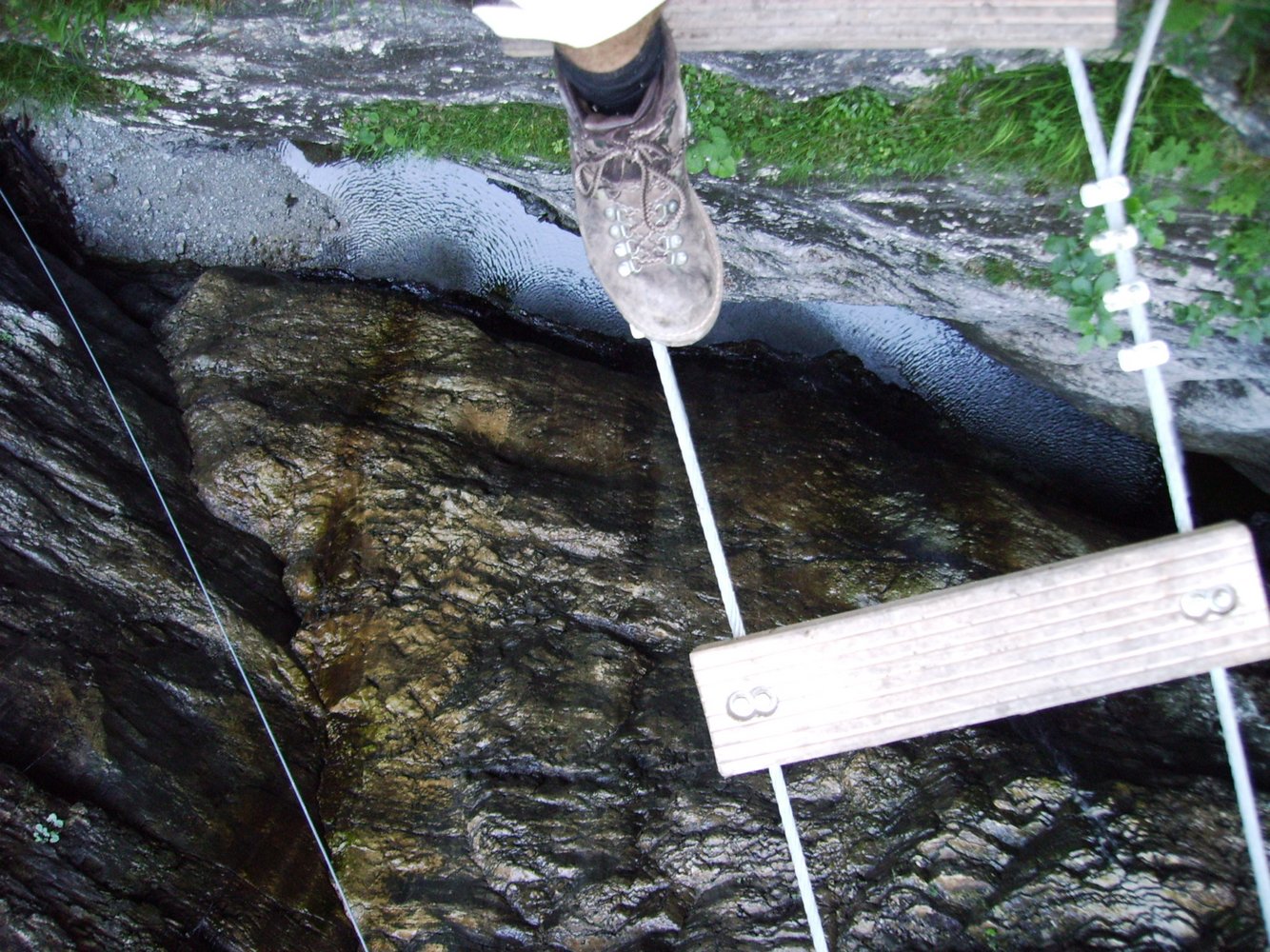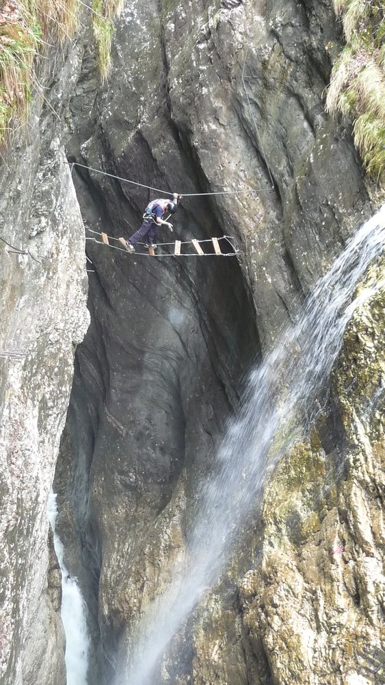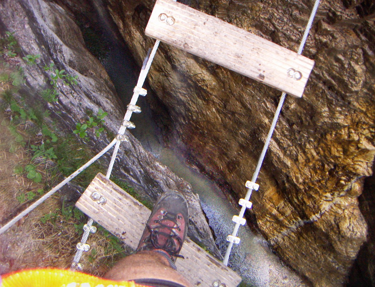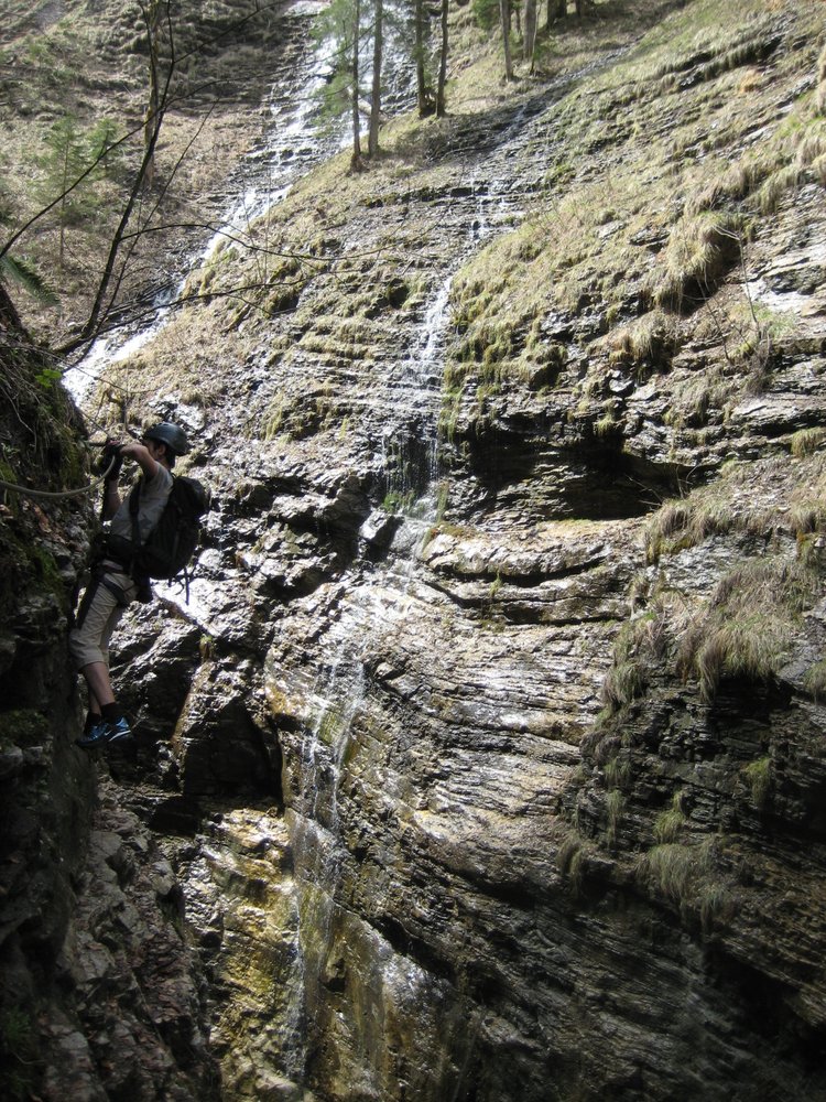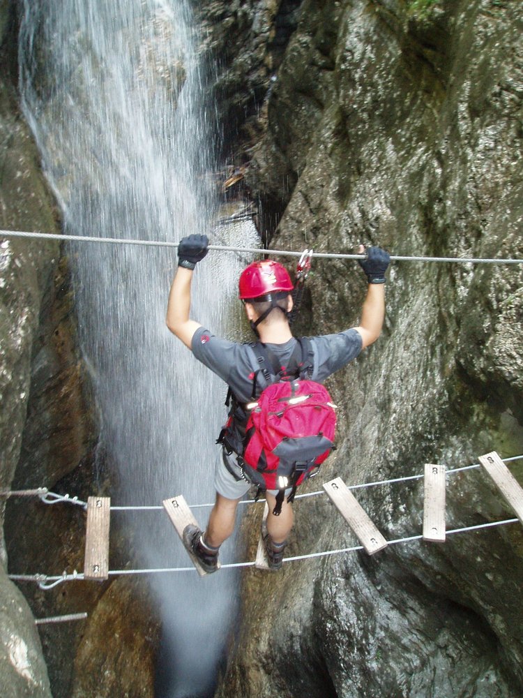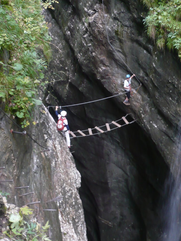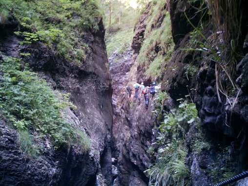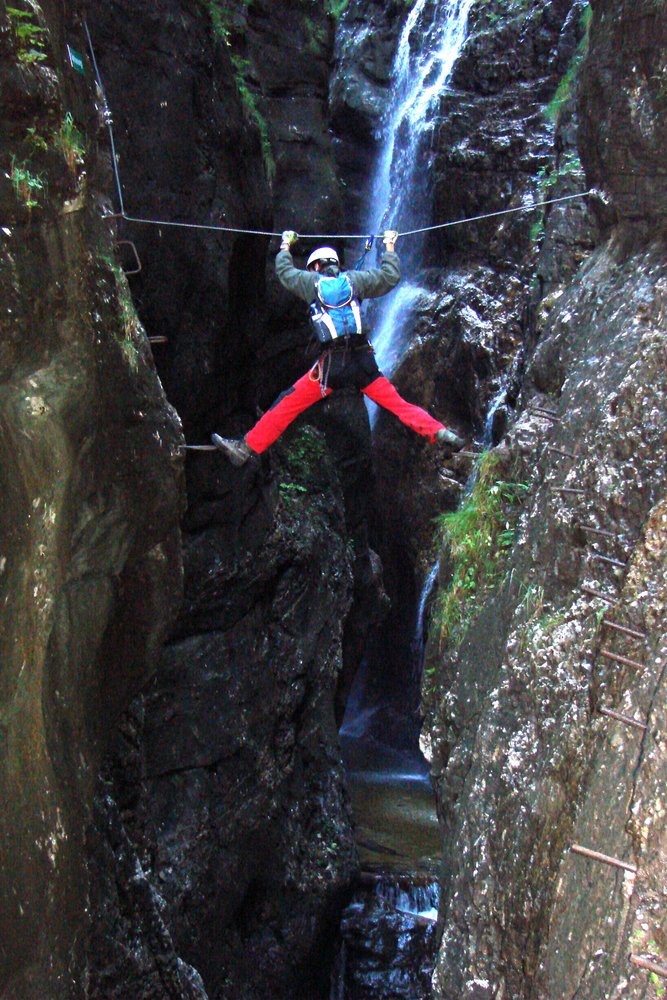 Klamm bis zur Wasserfallbrücke: Eine fallende Querung (A) zur ersten Brücke (Seufzerbrücke; B/C), danach durch steiles Waldgelände (Stelle B/C, meist leichter) zur zweiten Seilbrücke (Hangelbrücke; B/C). Dann weiter an sehr steilem Fels (bis B/C) zur engsten Stelle der Klamm und mit gewagtem "Gattsprung" (C) auf die andere Schluchtseite. Dann folgt ein glattes, meist nasses Wandstück (C) und über die nächste Seilbrücke (Wasserfallbrücke; B) gelangt man wieder auf die andere Seite der Klamm.
