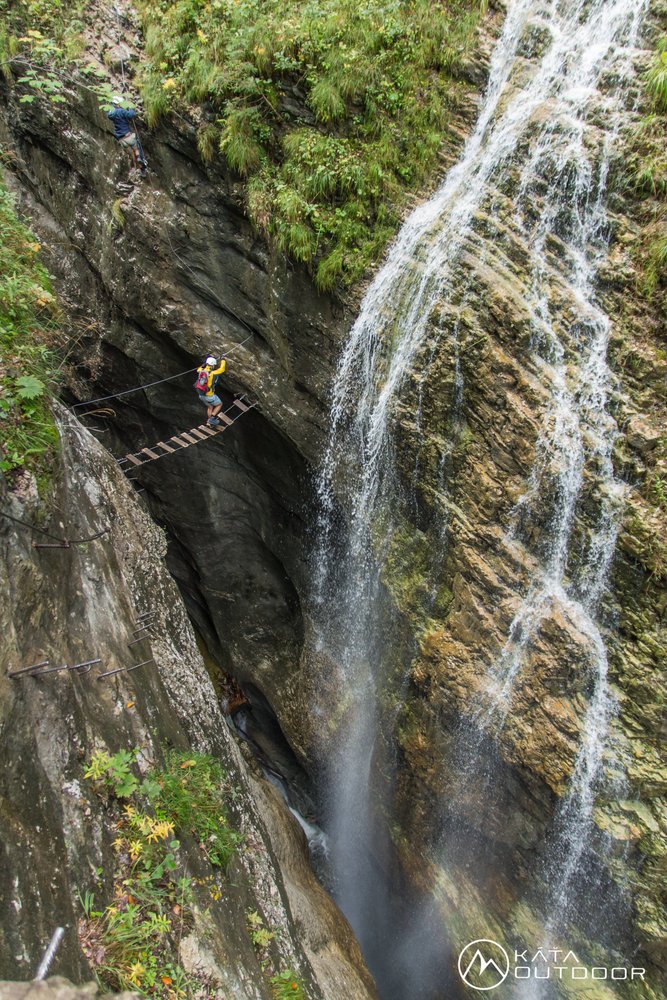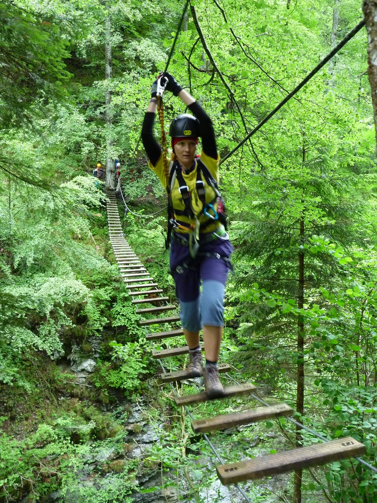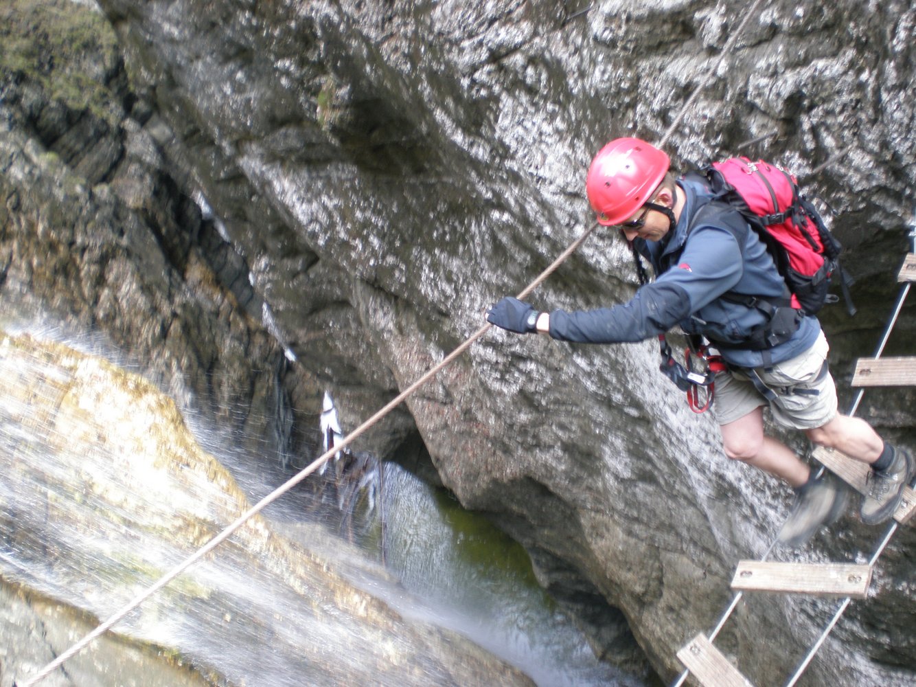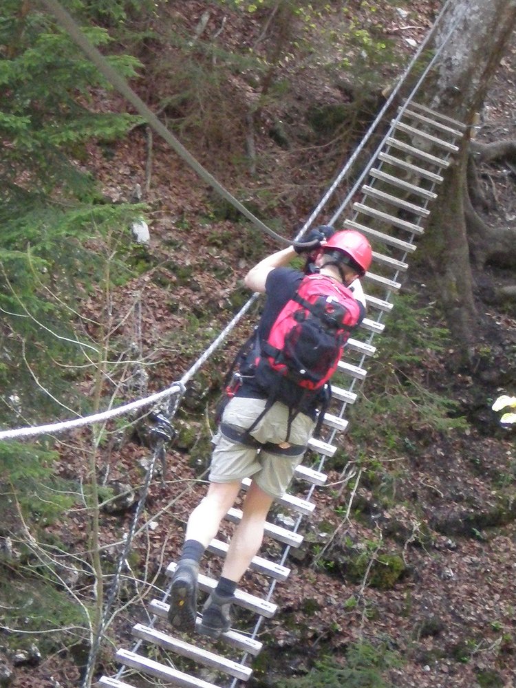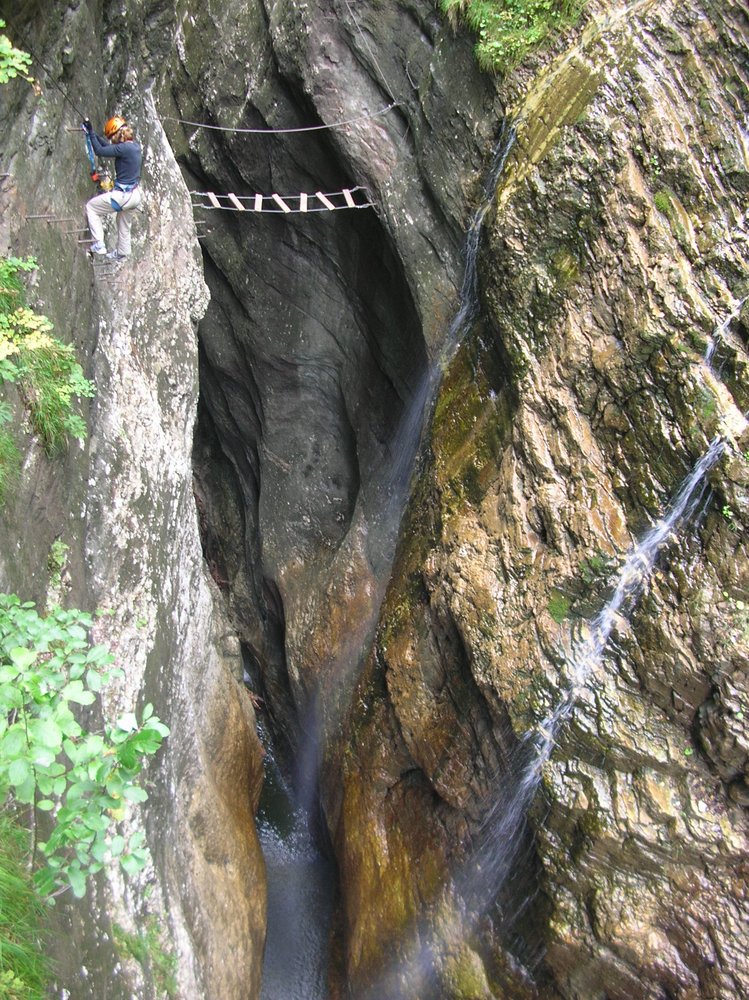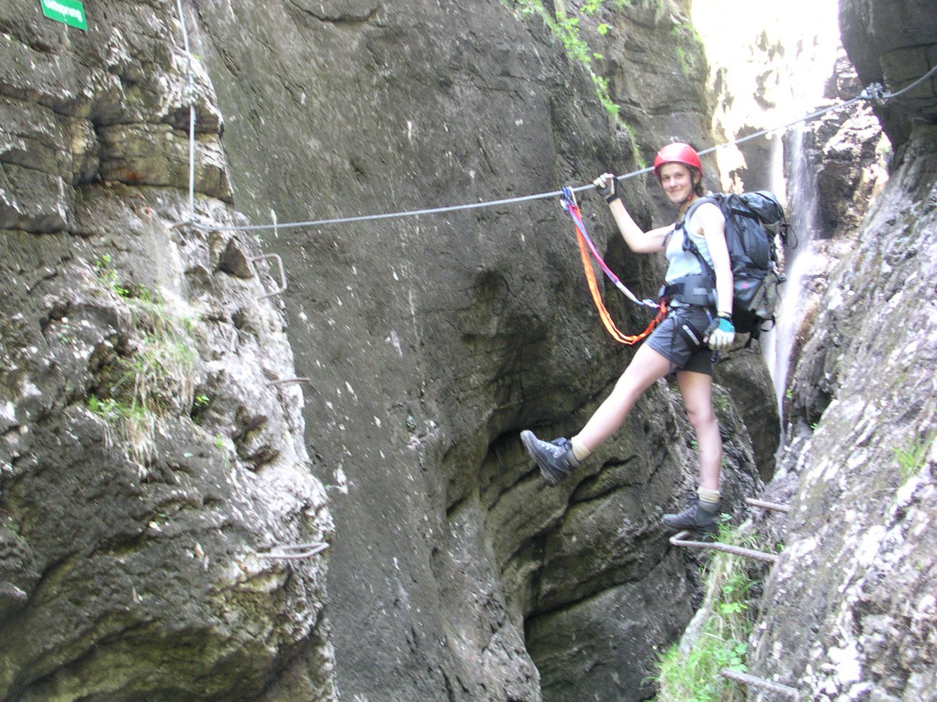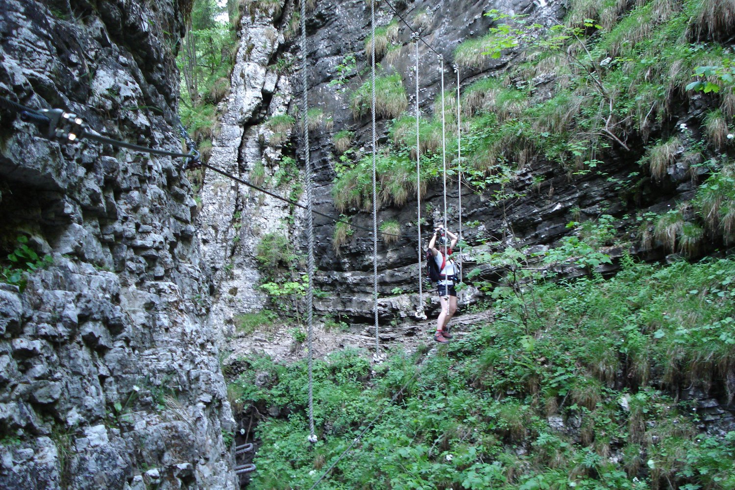 Klamm bis zur Wasserfallbrücke: Eine fallende Querung (A) zur ersten Brücke (Seufzerbrücke; B/C), danach durch steiles Waldgelände (Stelle B/C, meist leichter) zur zweiten Seilbrücke (Hangelbrücke; B/C). Dann weiter an sehr steilem Fels (bis B/C) zur engsten Stelle der Klamm und mit gewagtem "Gattsprung" (C) auf die andere Schluchtseite. Dann folgt ein glattes, meist nasses Wandstück (C) und über die nächste Seilbrücke (Wasserfallbrücke; B) gelangt man wieder auf die andere Seite der Klamm.