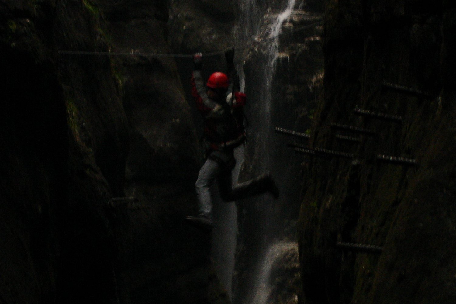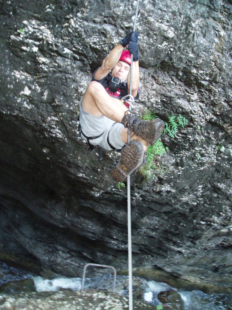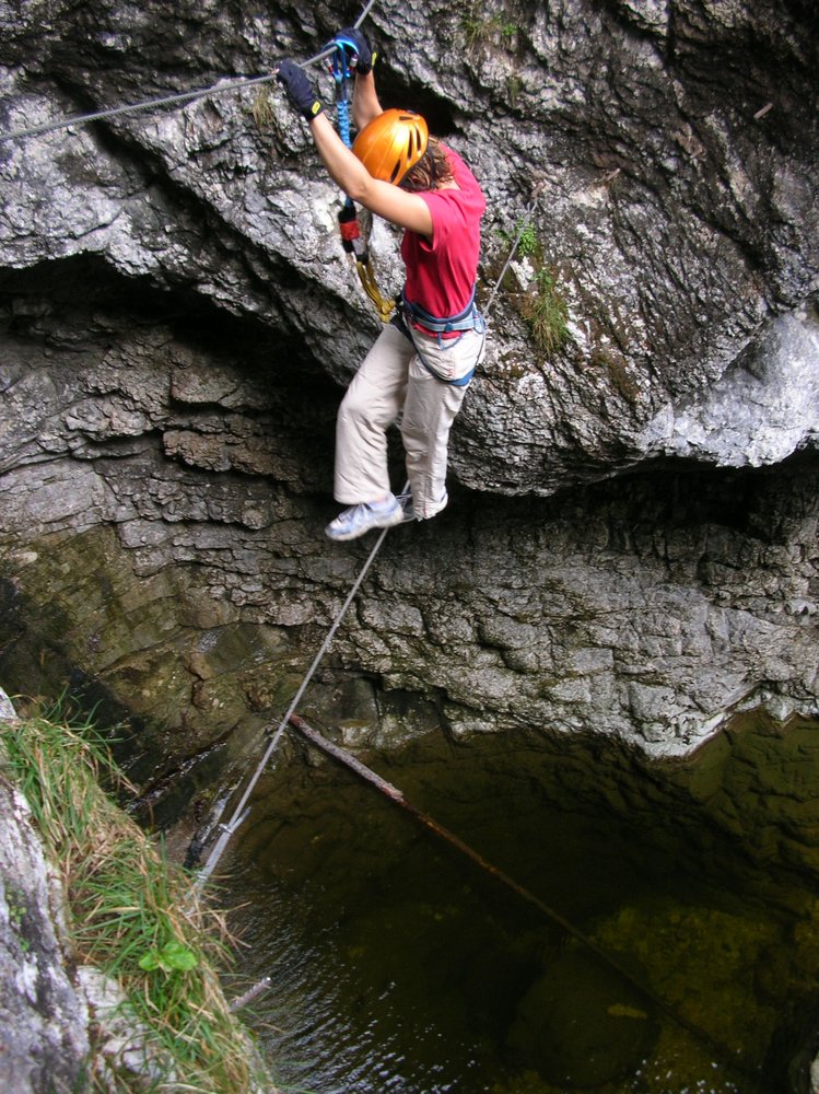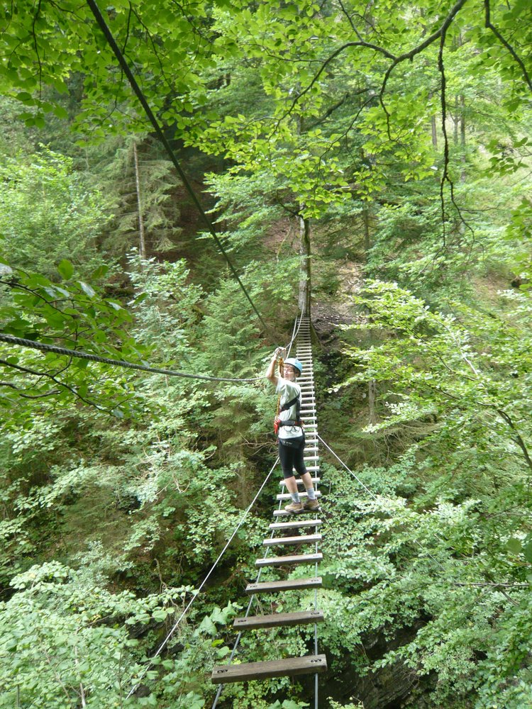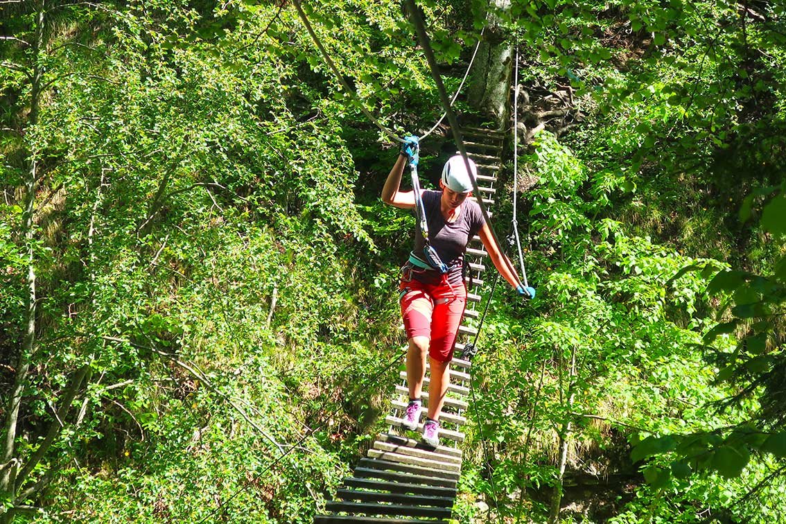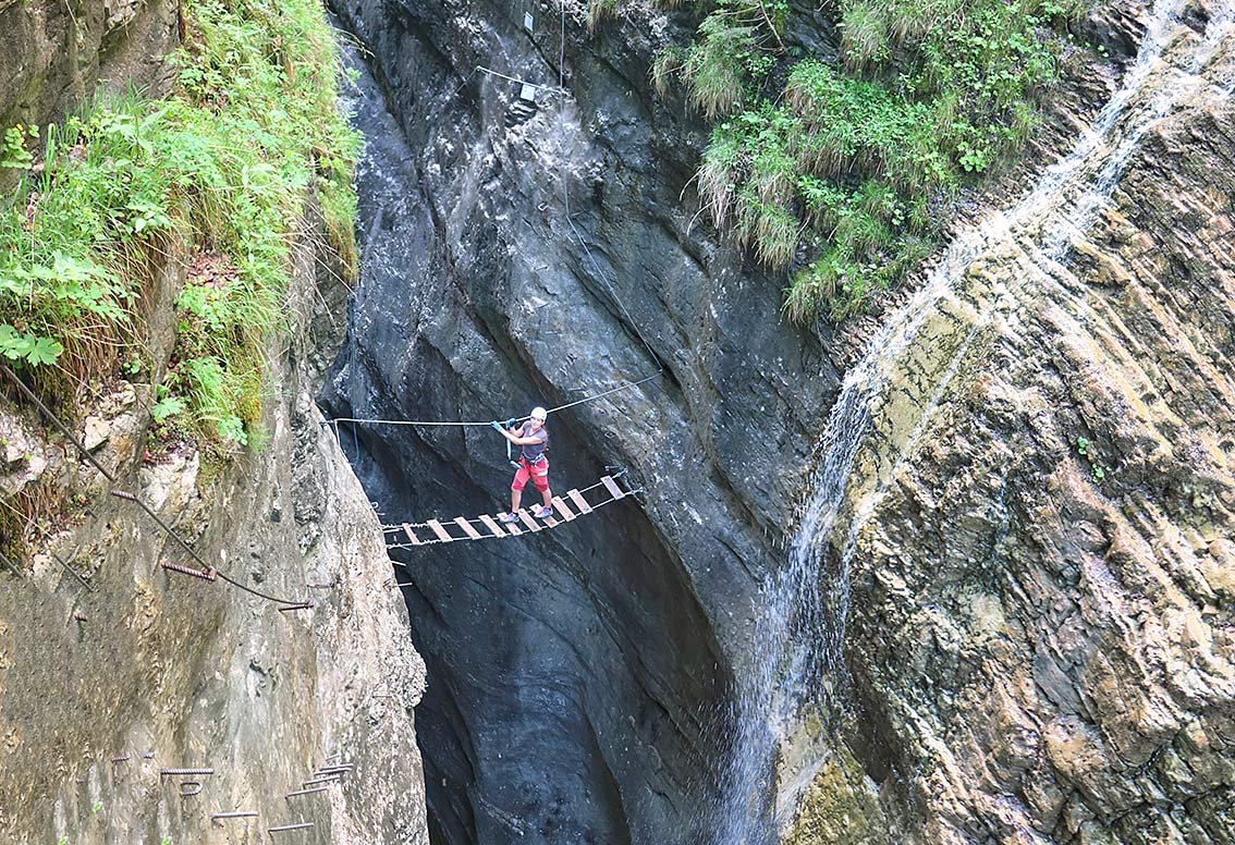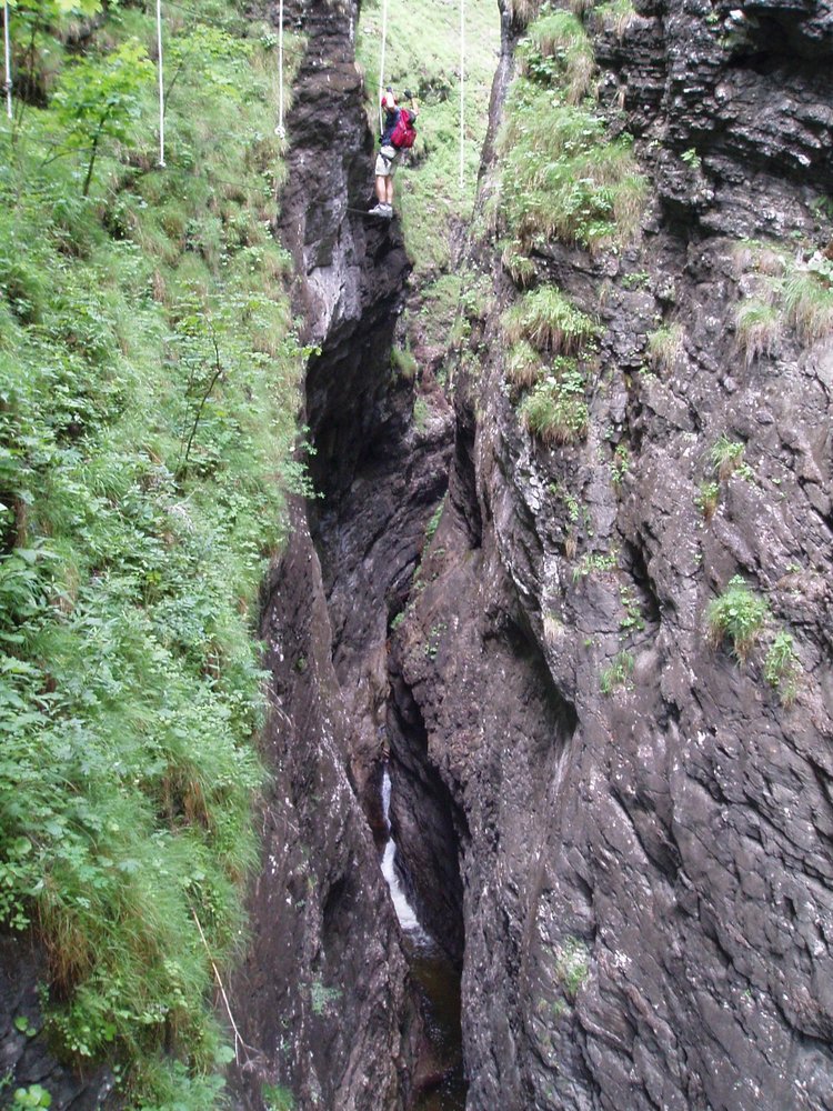 Klamm bis zur Wasserfallbrücke: Eine fallende Querung (A) zur ersten Brücke (Seufzerbrücke; B/C), danach durch steiles Waldgelände (Stelle B/C, meist leichter) zur zweiten Seilbrücke (Hangelbrücke; B/C). Dann weiter an sehr steilem Fels (bis B/C) zur engsten Stelle der Klamm und mit gewagtem "Gattsprung" (C) auf die andere Schluchtseite. Dann folgt ein glattes, meist nasses Wandstück (C) und über die nächste Seilbrücke (Wasserfallbrücke; B) gelangt man wieder auf die andere Seite der Klamm.