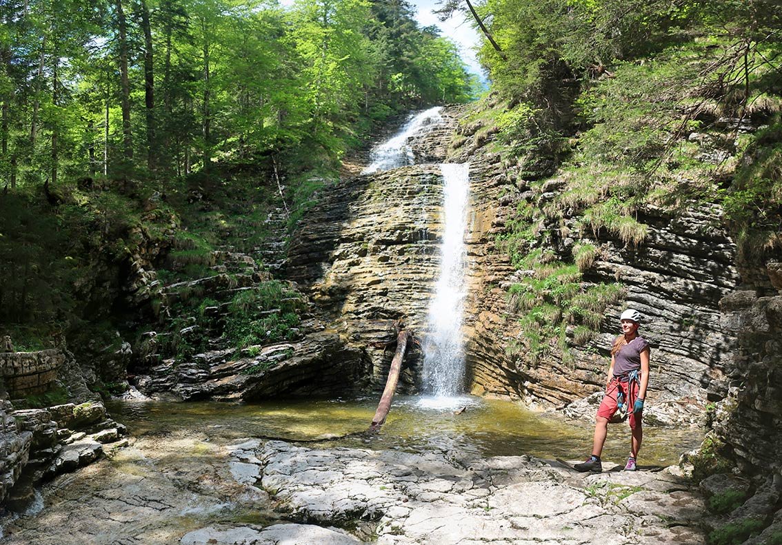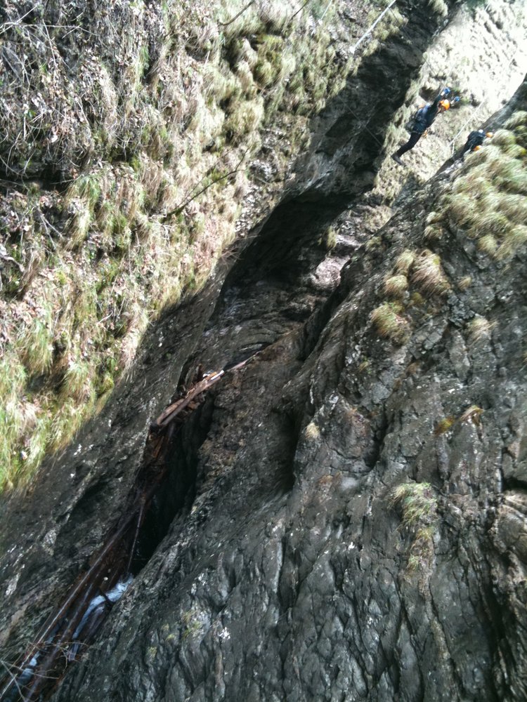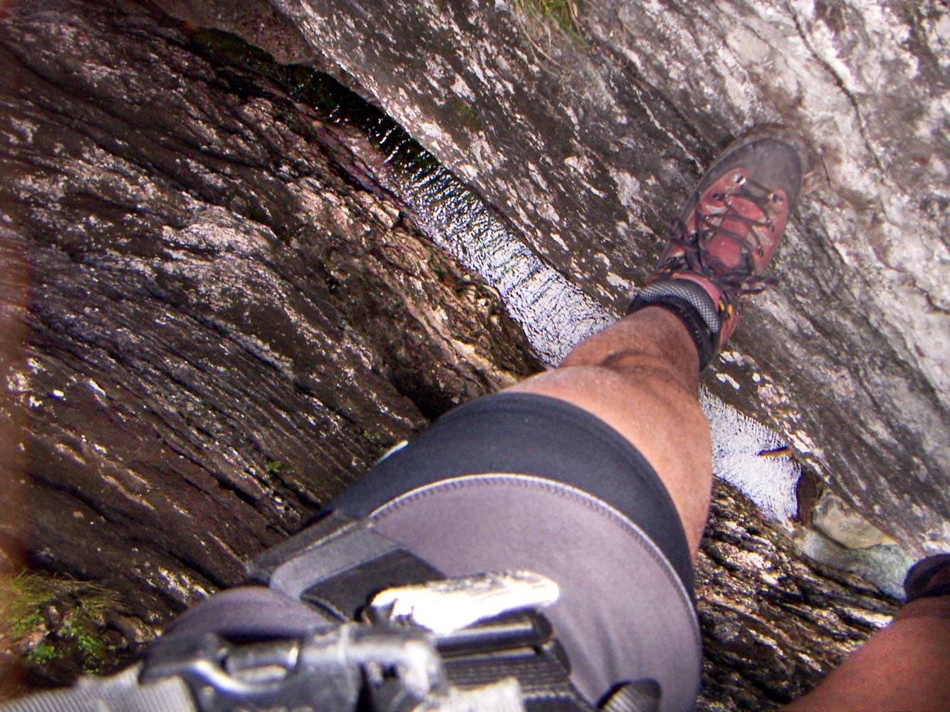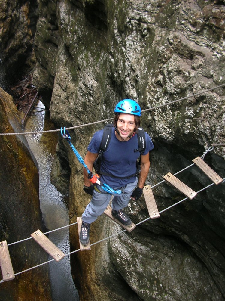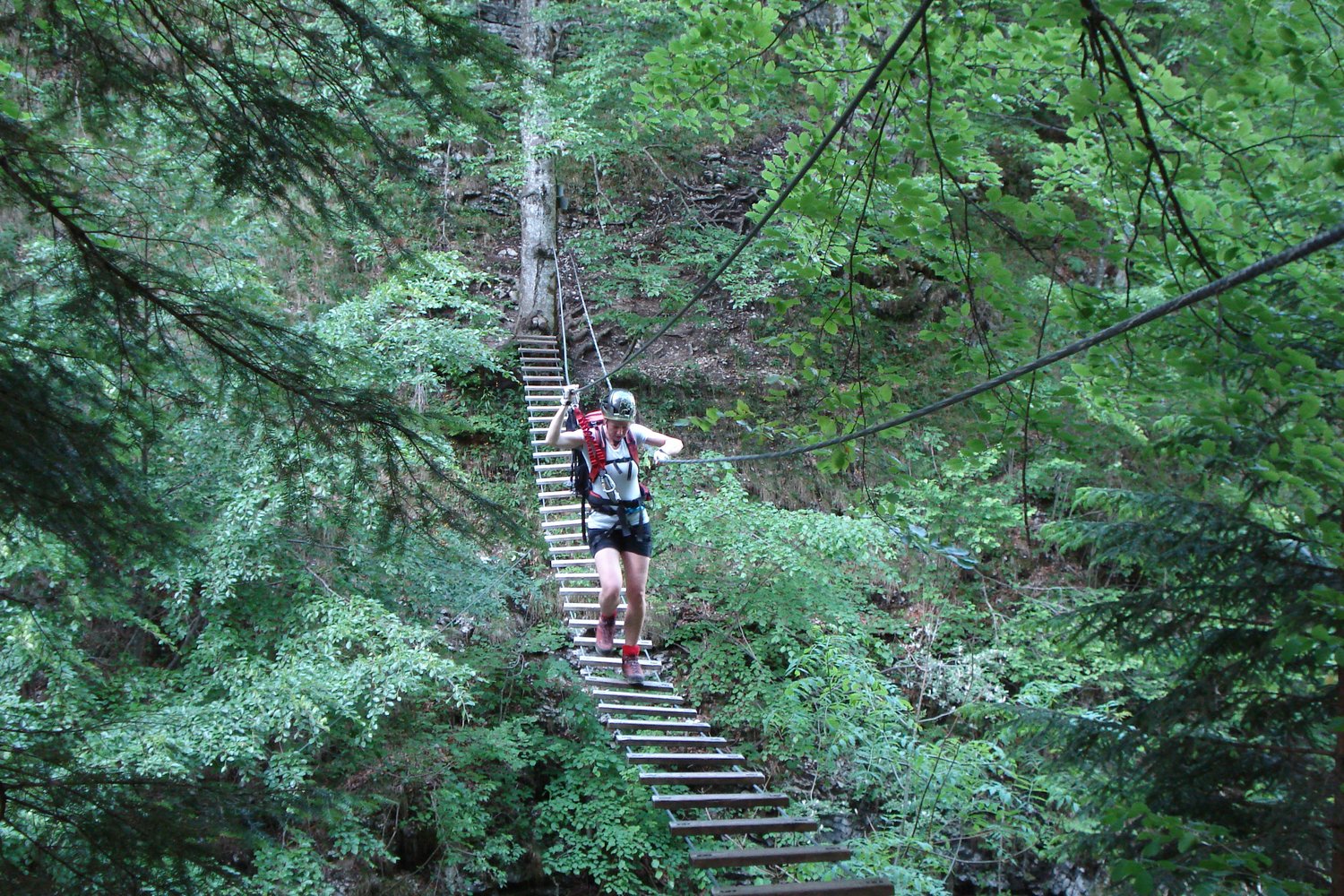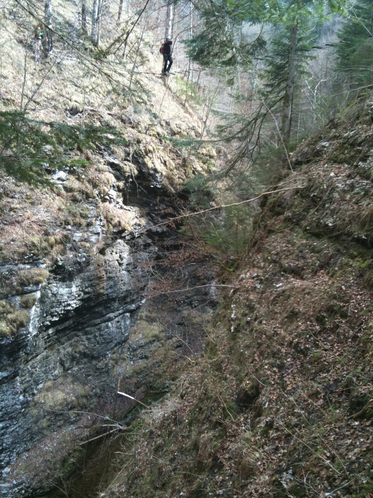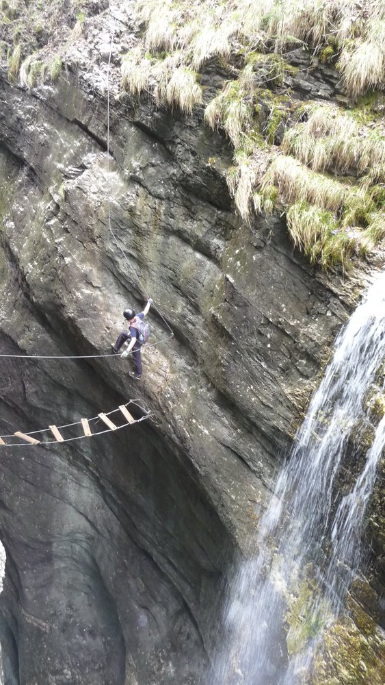 Klamm bis zur Wasserfallbrücke: Eine fallende Querung (A) zur ersten Brücke (Seufzerbrücke; B/C), danach durch steiles Waldgelände (Stelle B/C, meist leichter) zur zweiten Seilbrücke (Hangelbrücke; B/C). Dann weiter an sehr steilem Fels (bis B/C) zur engsten Stelle der Klamm und mit gewagtem "Gattsprung" (C) auf die andere Schluchtseite. Dann folgt ein glattes, meist nasses Wandstück (C) und über die nächste Seilbrücke (Wasserfallbrücke; B) gelangt man wieder auf die andere Seite der Klamm.