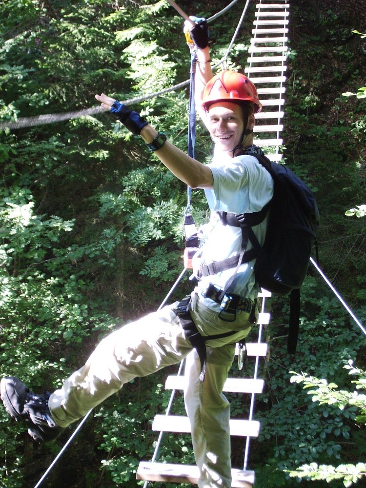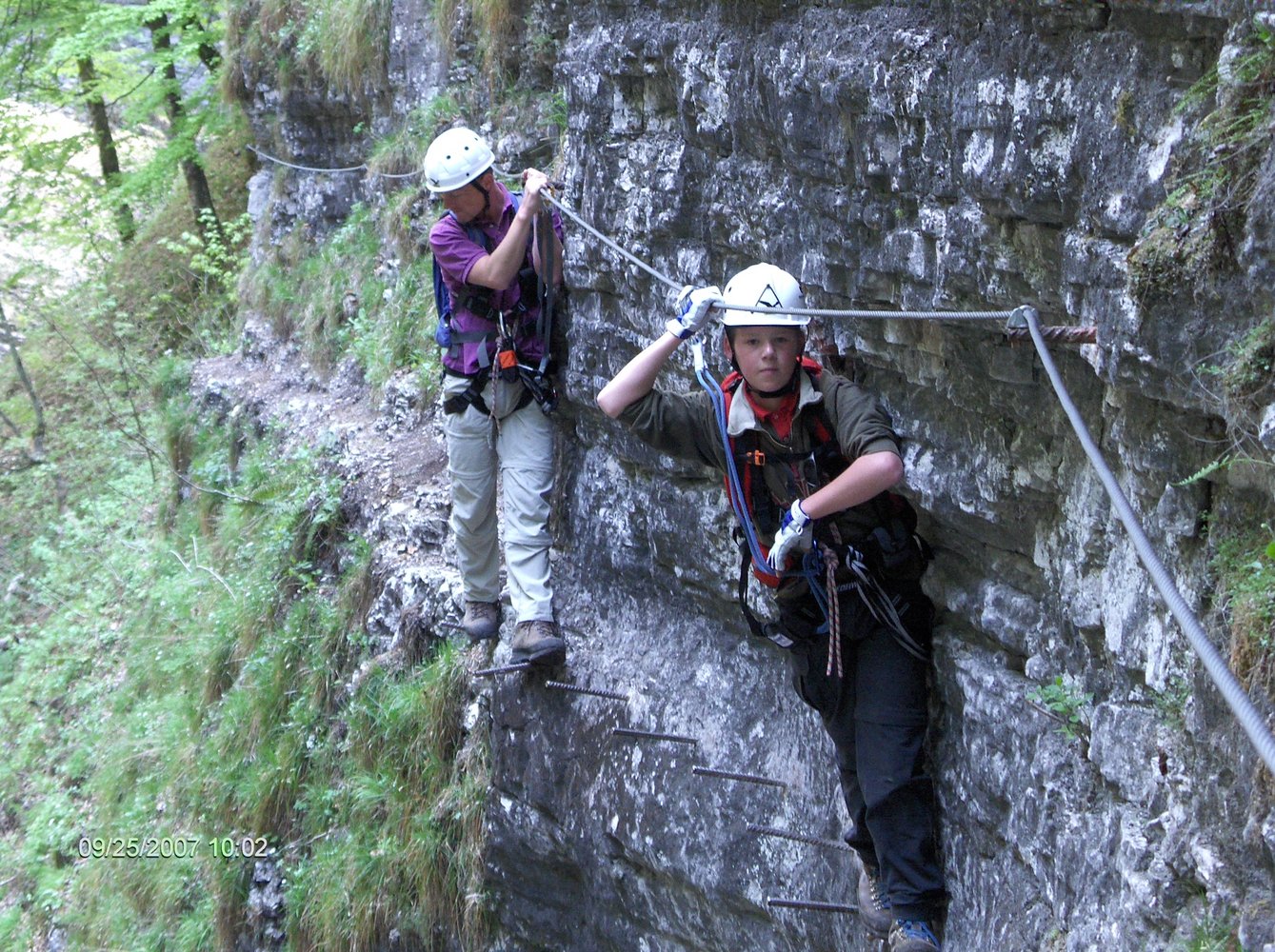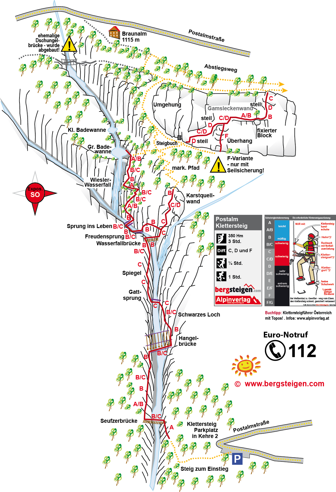 Bei Nässe ist die Klamm sehr rutschig und auch die heiklen Wiesenpassagen sind kein Genuss! Selten wurde bei einem Klettersteig so viel Eisen in (durch) Bäume geschlagen. Die Wegführung wurde nach einem Sturmschaden geringfügig geändert. Oben hat es früher noch eine kleine „Dschungelbrücke“ gegeben, diese wurde aber oft von umstürzenden Bäumen beschädigt und dann komplett abgebaut. Siehe auch Klettersteig Brustwand (C) - beide Steige kann man gut kombinieren.