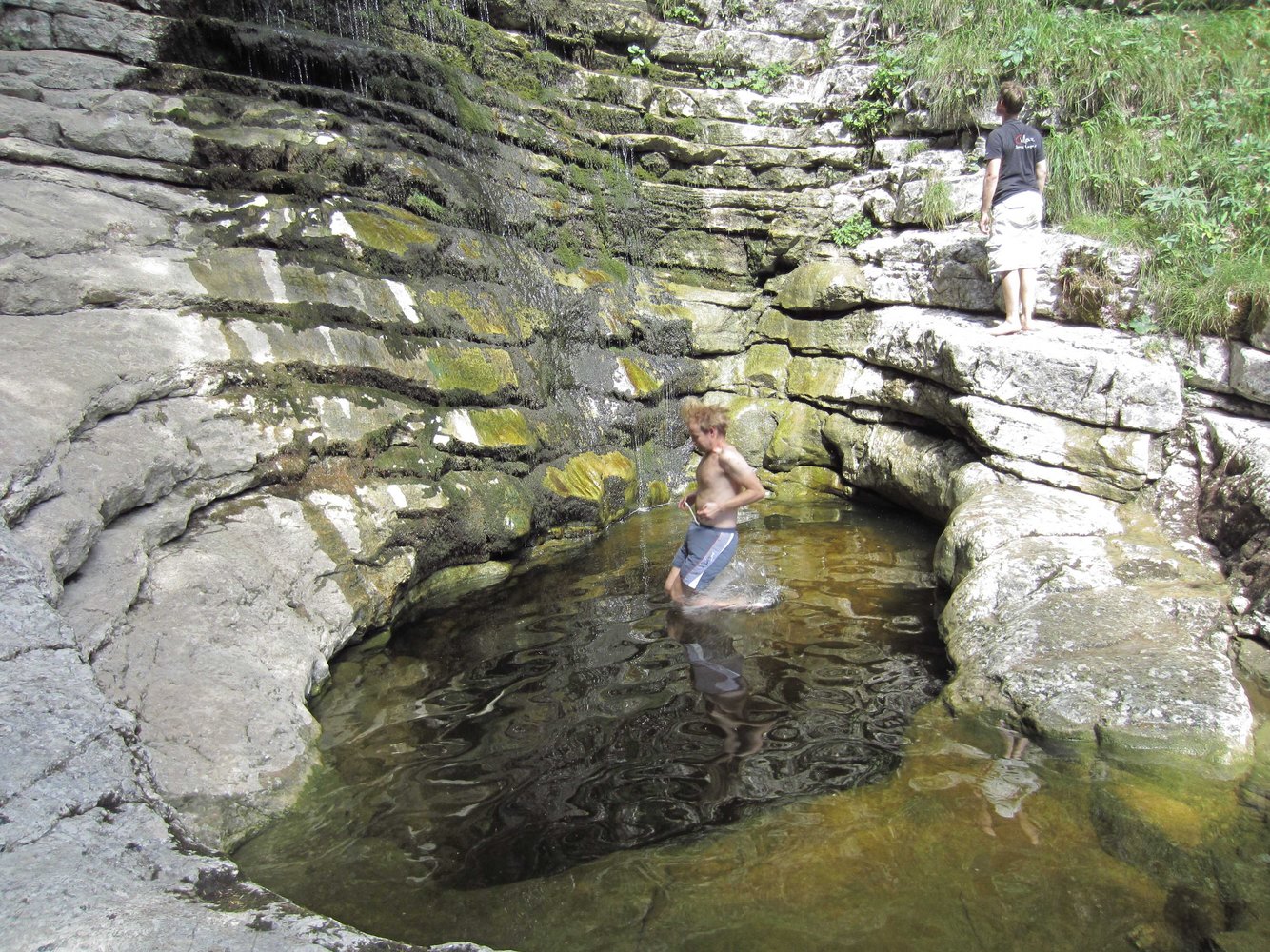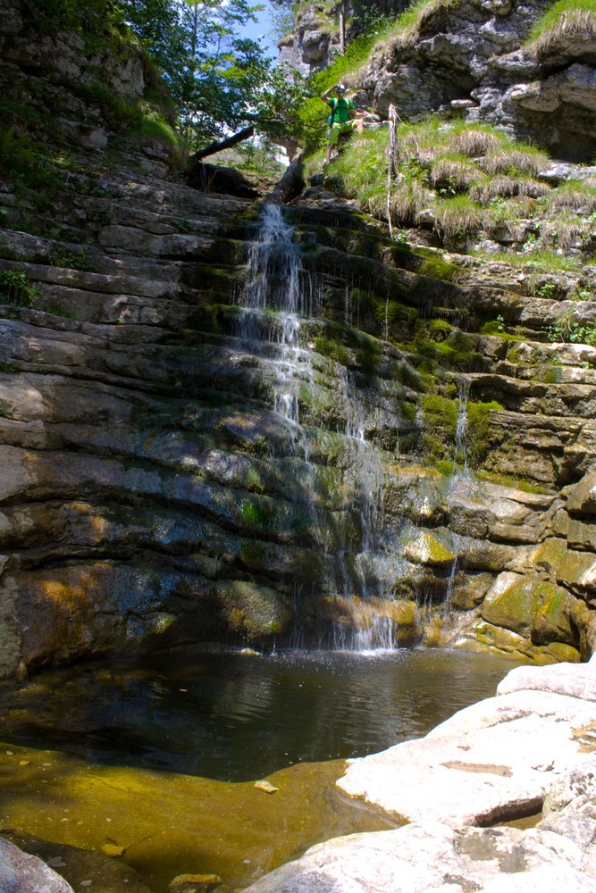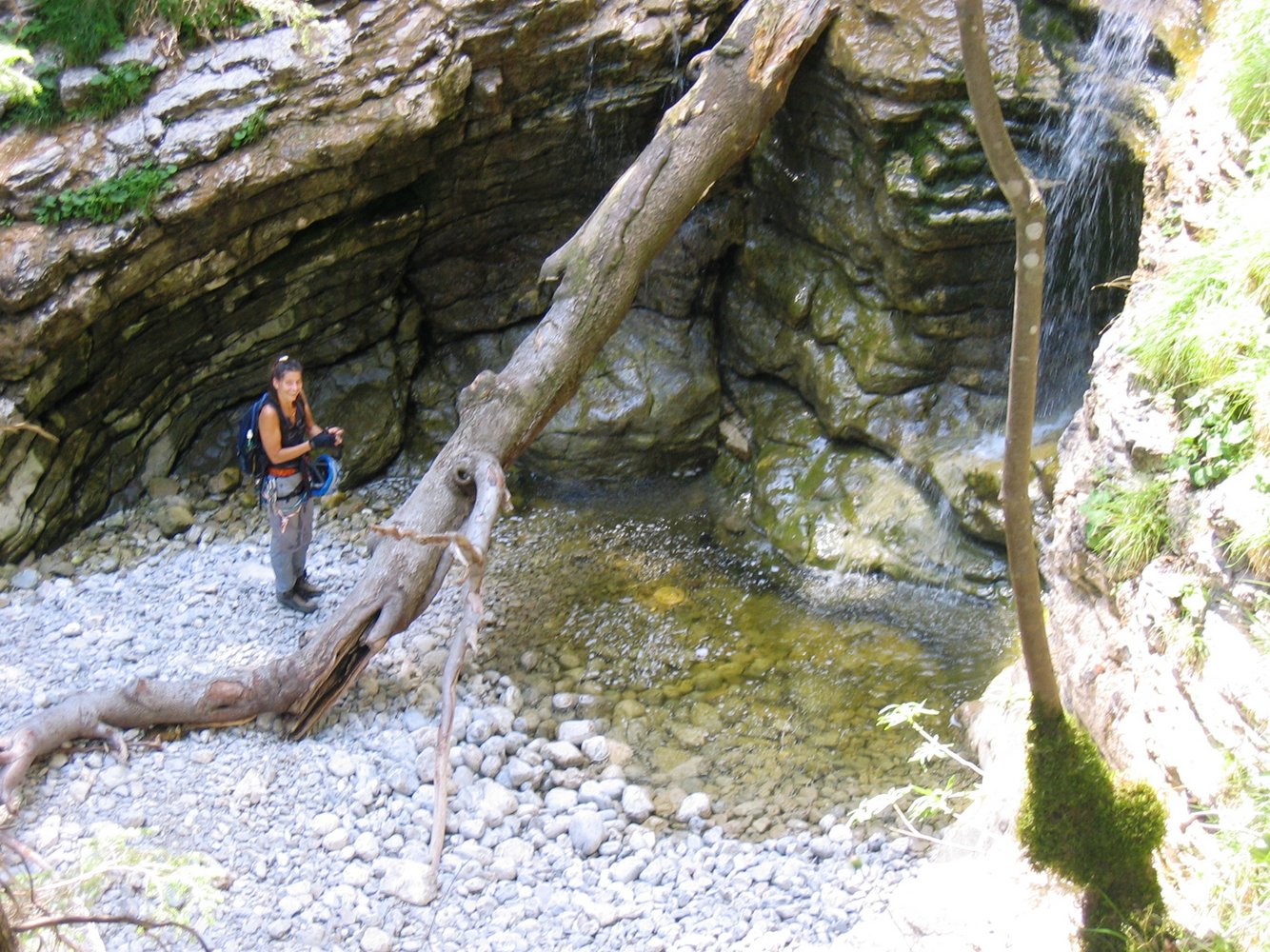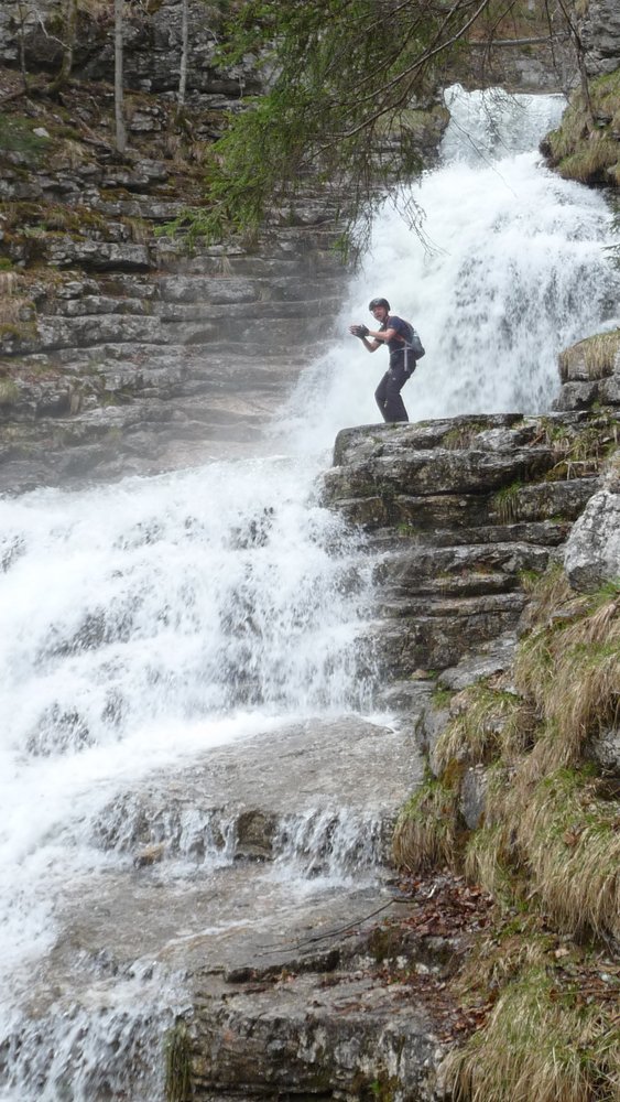 Variante Wiesler-Wasserfall: Nach der Wasserfallbrücke links, dann abwärts (B) zum Freudensprung (B/C). Auf der anderen Klammseite gelangt man zum "Sprung ins Leben" (B/C), mit dem man neuerlich die Klammseite wechselt. Gestuft aus der Klamm aufwärts (Stelle B/C) gelangt man auf ein Band. Auf diesem nach links (A) zum Wieslerwasserfall. Am Rand des Wasserfalles (Stelle B/C) bis zur "Großen Badewanne". Von dem Gumpen rechts zum Pfad aufsteigen.