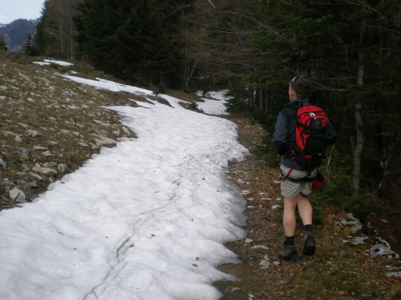 Variante Karstquellenwand: Es geht gerade an der Karstquellenwand (C/D) hinauf, man kommt in flacheres Waldgelände und geht dort bis zur Gamsleckenwand.